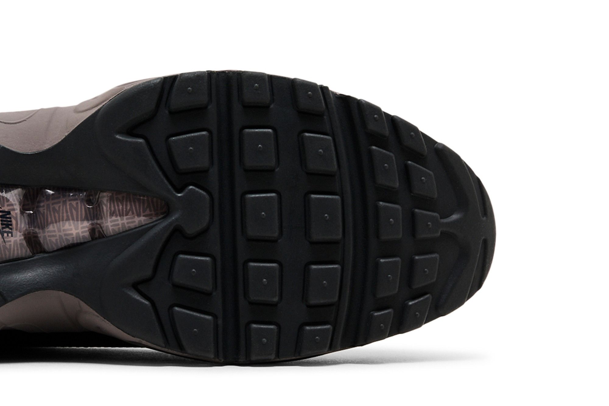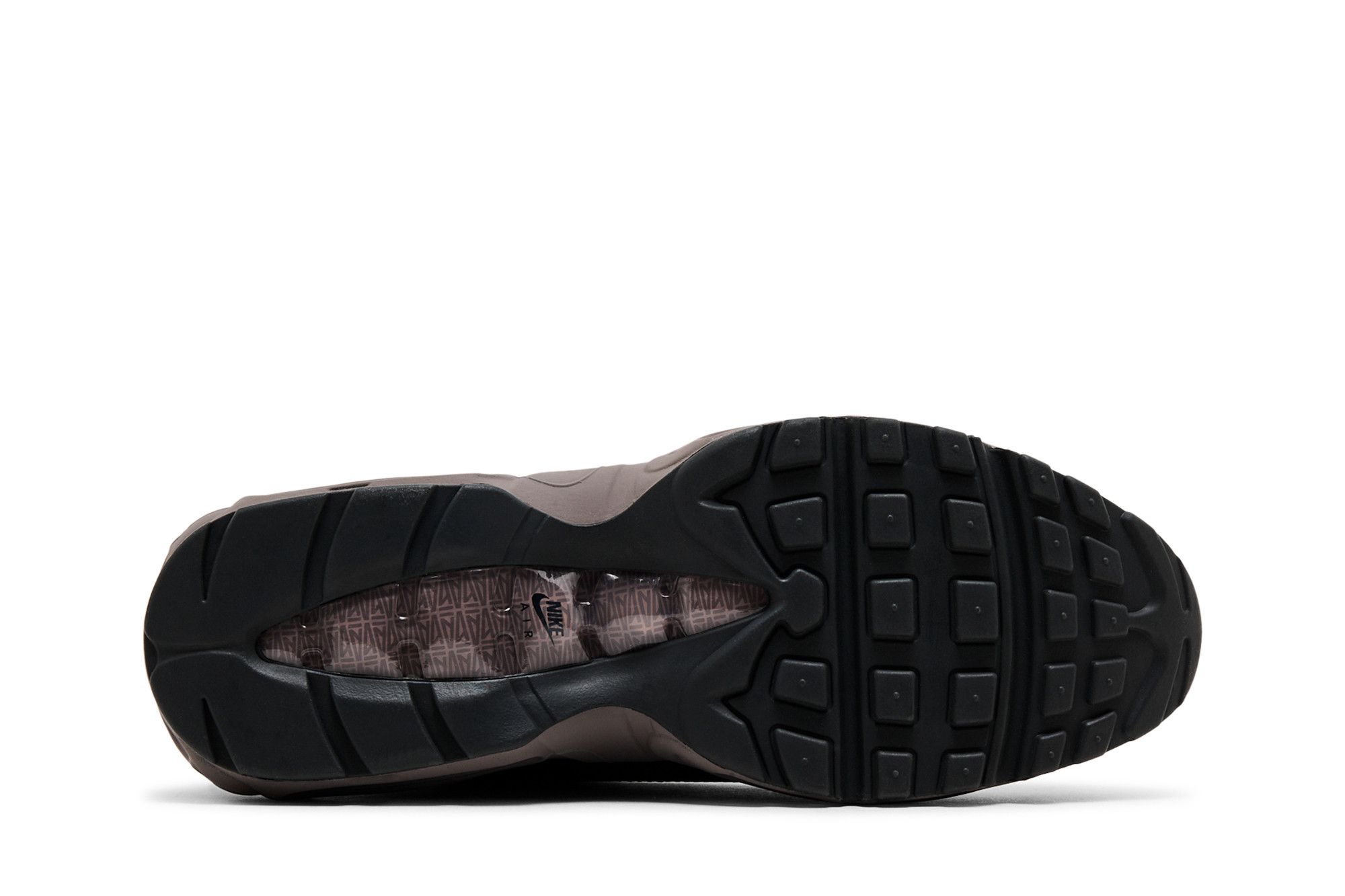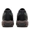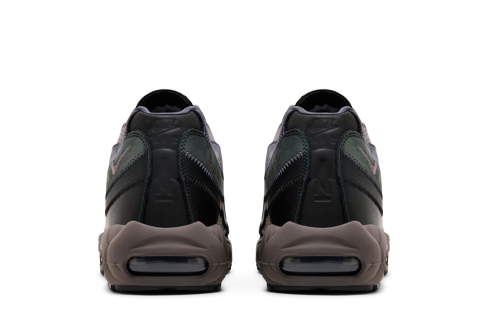 The A Ma Maniére x Nike Air Max 95 SP ‘Black Violet Ore’ is highlighted by wavy suede side panels in murky shades of grey, green, and black. A Ma Maniére branding appears on the tongue patch and black leather toe cap, while graphics etched into the medial heel depict ‘hand wash cold’ laundry symbols. The retro runner is mounted on a grey polyurethane midsole with visible Air-sole cushioning.