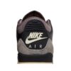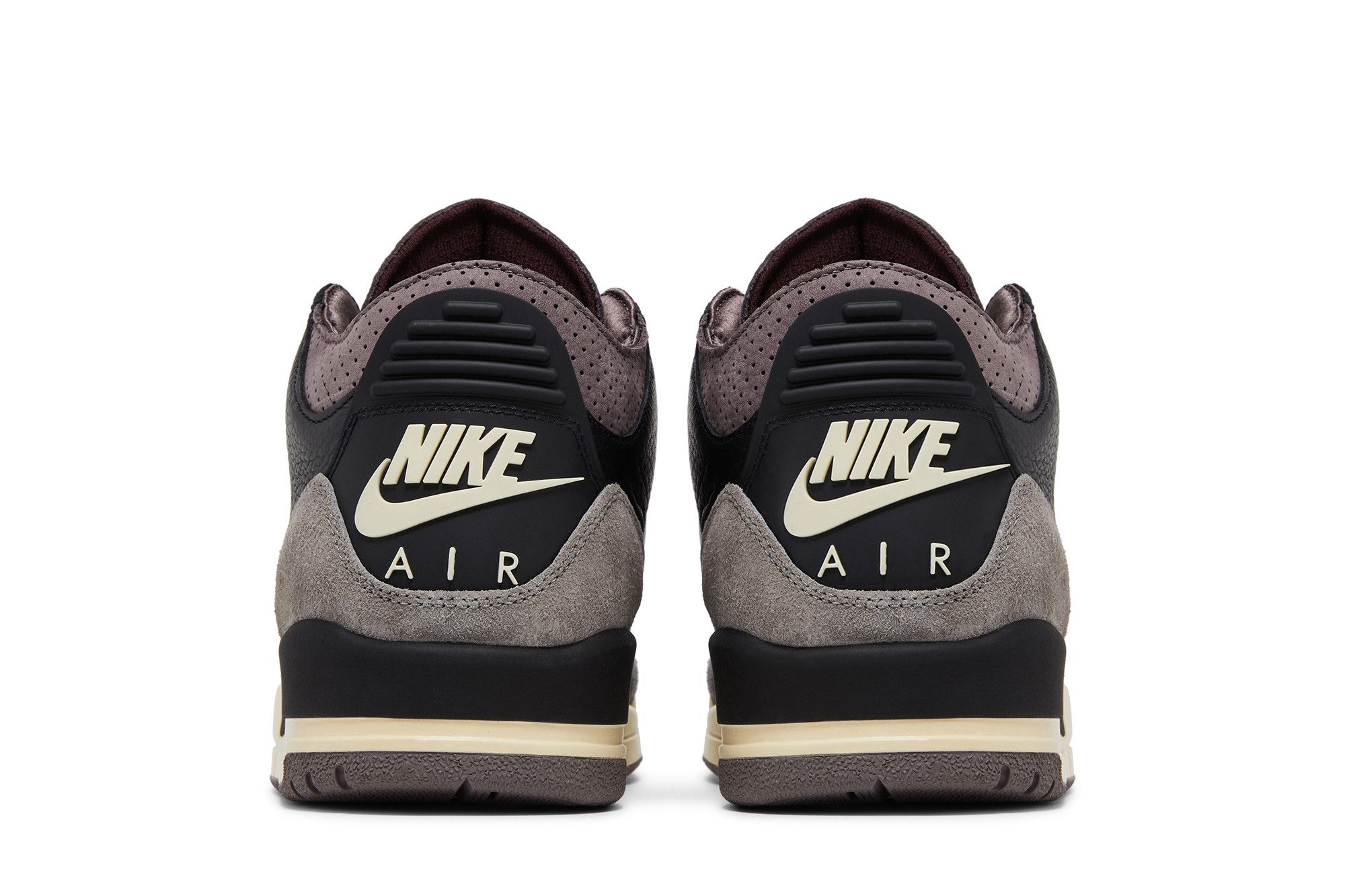 The A Ma Maniére x Women’s Air Jordan 3 Retro ‘While You Were Sleeping’ features black tumbled leather on the upper, fortified with grey hairy suede overlays at the forefoot and heel. Perforated nubuck in a subdued Violet Ore hue appears on the eyestay and mid-cut collar, lined with quilted satin and stripped of interior padding. The tongue is similarly slimmed down and displays mismatched ‘A’ and Jumpman branding. A raised Nike Air logo embellishes the molded heel tab. A vintage off-white finish coats the polyurethane midsole, fitted with a visible Air-sole unit in the heel.