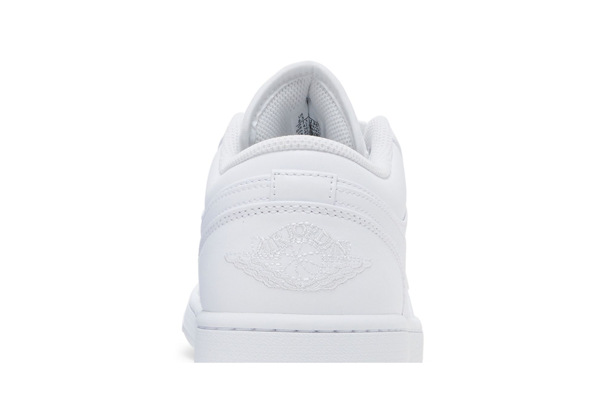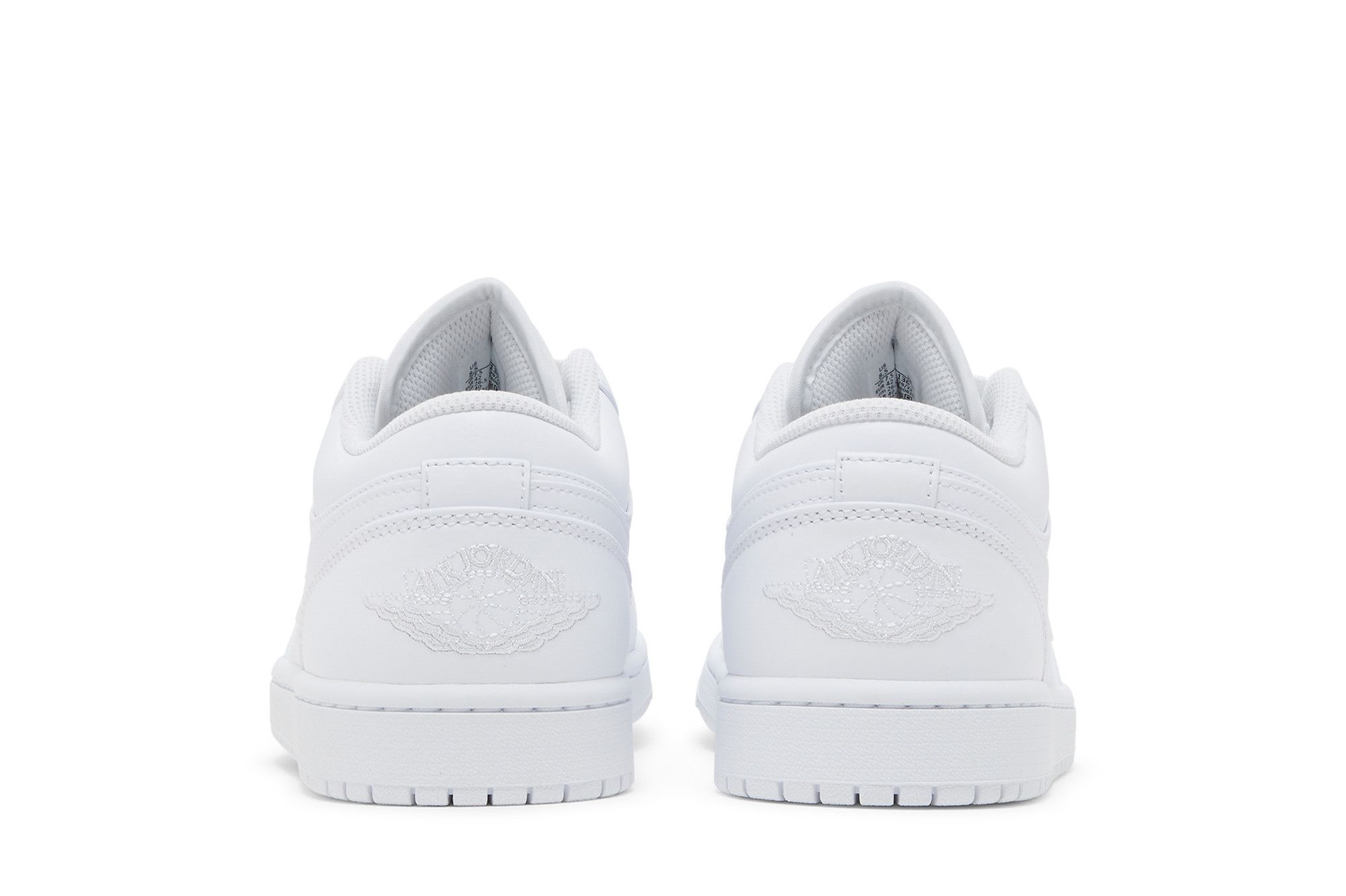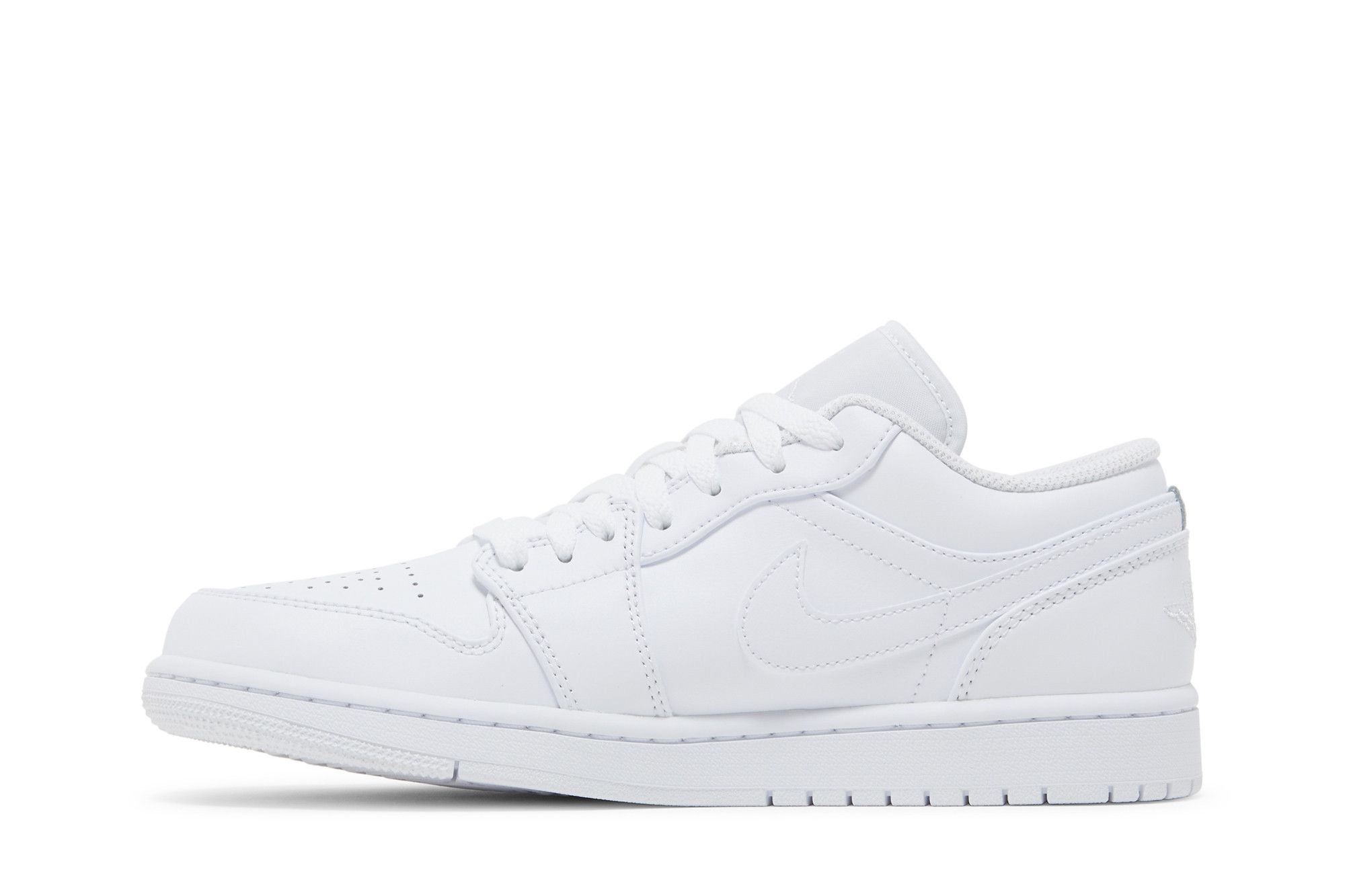 The 2022 edition of the Air Jordan 1 Low ‘Triple White’ brings a blank-slate aesthetic to a streamlined silhouette modeled after the 1985 original. A pristine white finish is applied to the leather upper, yielding a versatile and highly adaptive design. Tonal branding elements include an embroidered Jumpman on the tongue and a stitched Wings logo on the back heel. The sneaker is mounted on a traditional white rubber cupsole, featuring an Air-sole heel unit encapsulated in lightweight polyurethane.