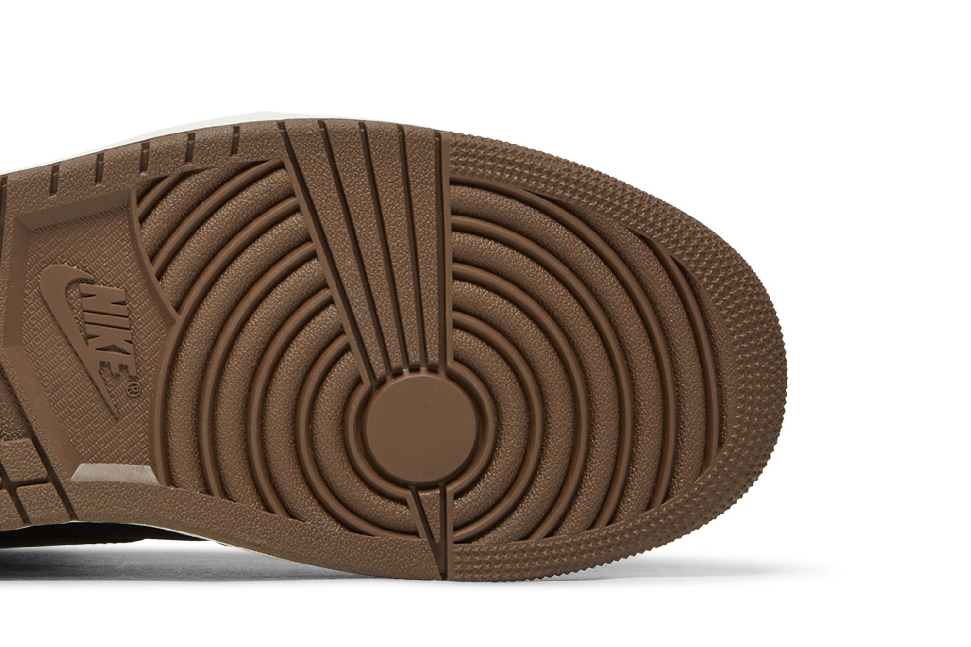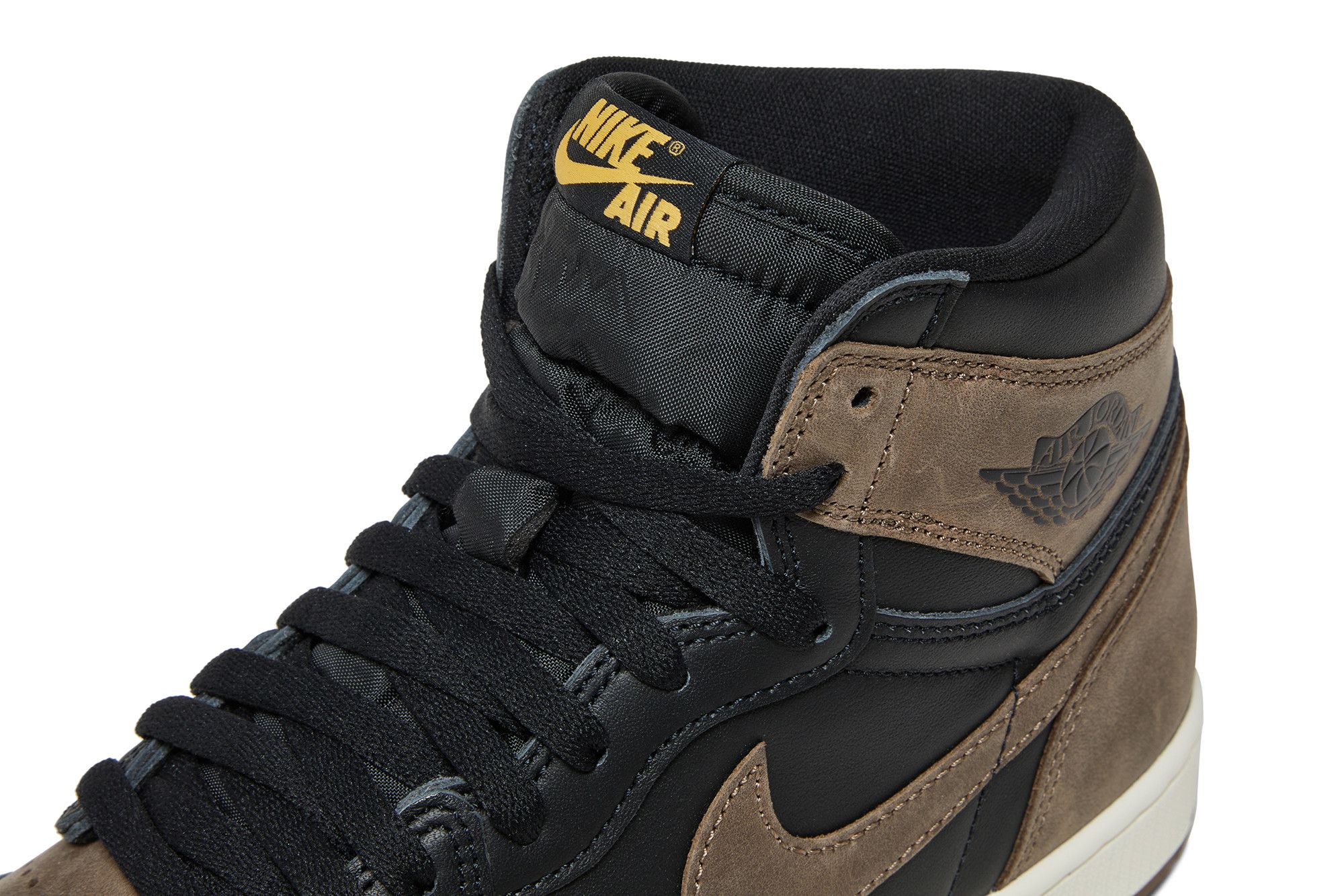 The Air Jordan 1 Retro High OG ‘Palomino’ merges a luxe build with OG-inspired two-tone color blocking. The sneaker icon carries a black leather upper, accented with aged brown nubuck on the toe box, Swoosh, heel overlay and collar flap. The latter is marked with a black Wings logo on the lateral side, while the woven tongue tag displays a Nike logo with metallic gold lettering. A contrasting off-white finish is applied to the midsole, built with stitched sidewall construction and encapsulated Air-sole cushioning. Underfoot, a brown rubber outsole features a traction pattern designed to grip the hardwood.