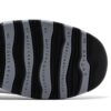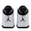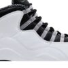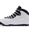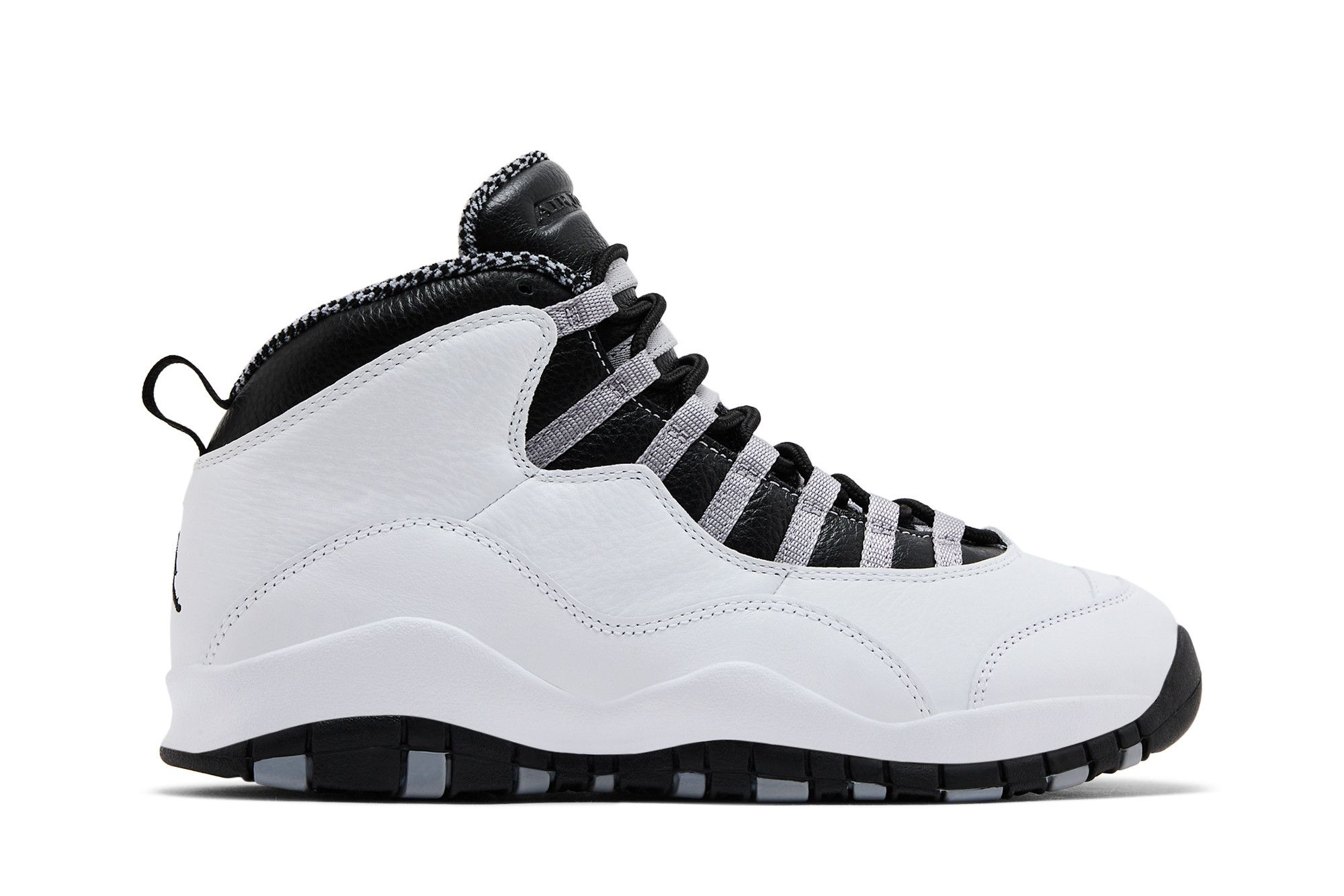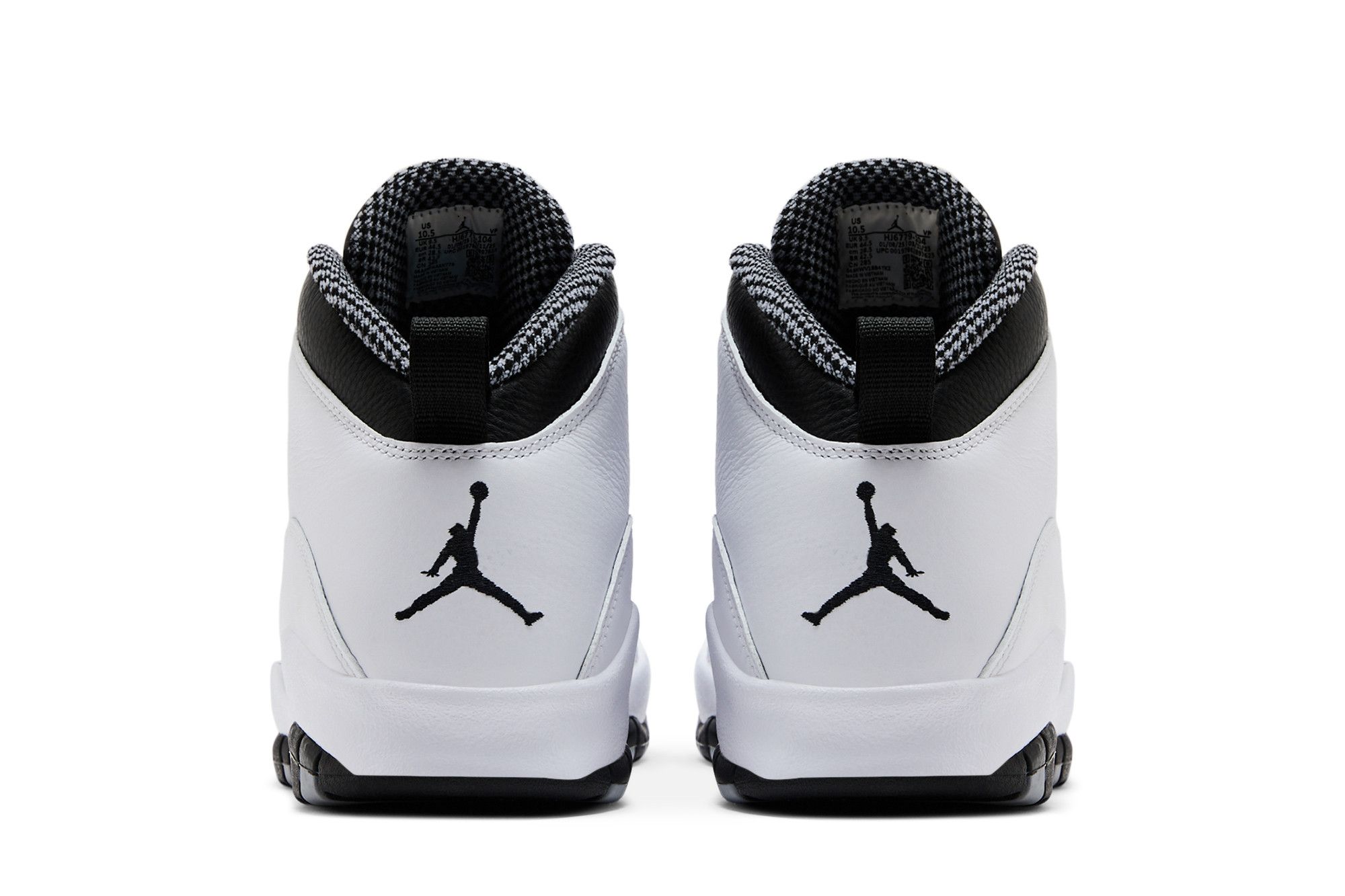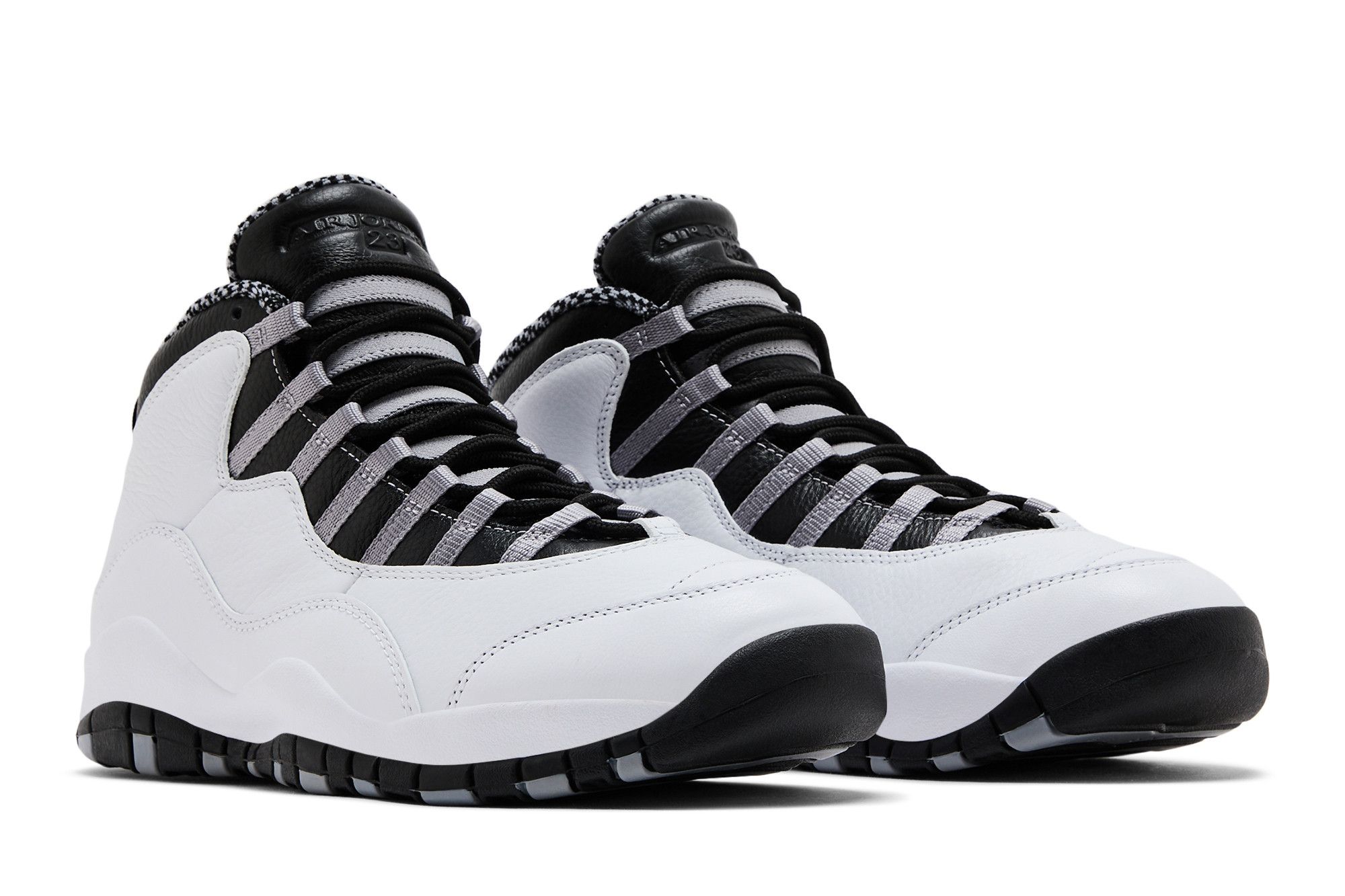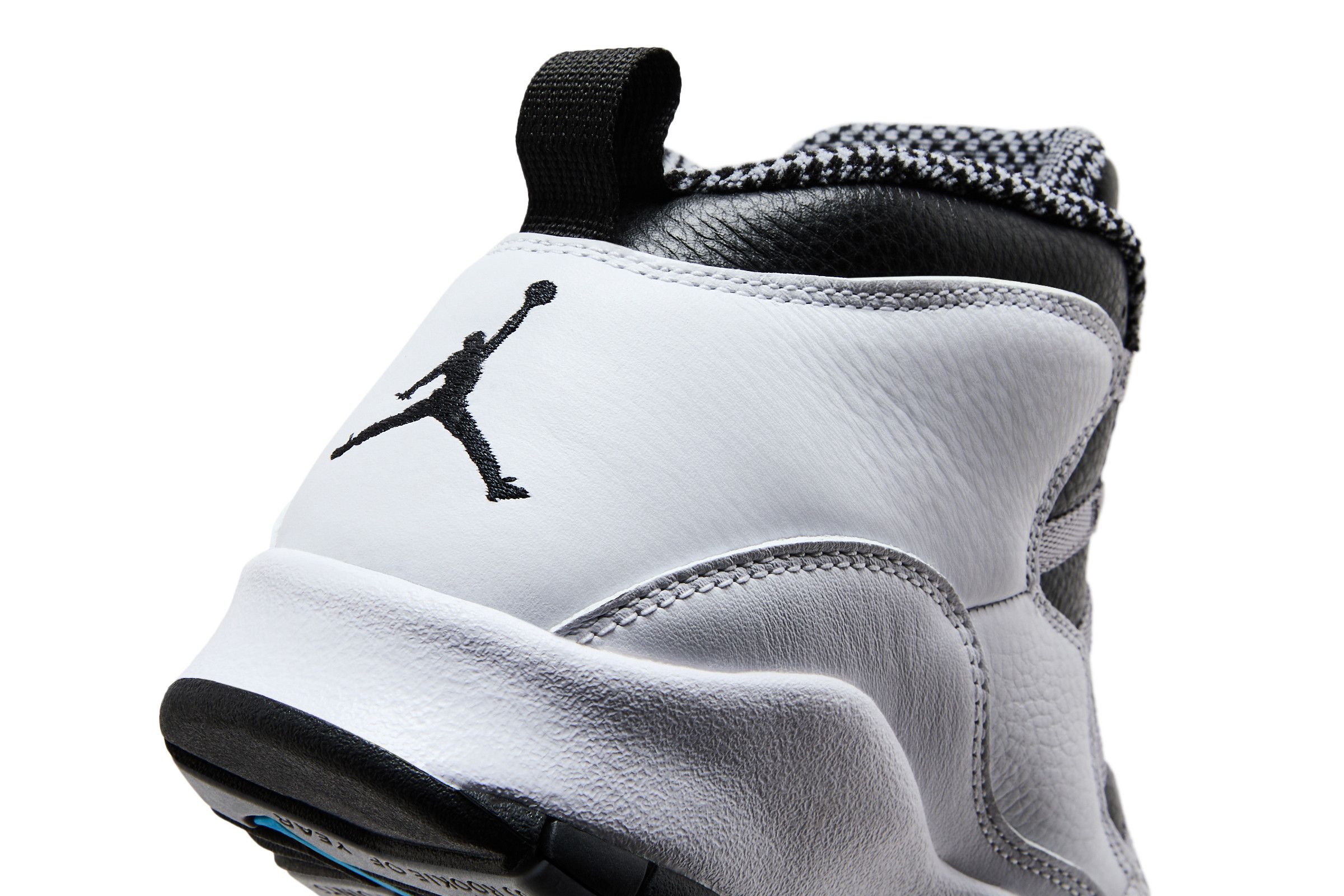 The 2025 edition of the Air Jordan 10 Retro ‘Steel’ brings back an original colorway of the model designed by Tinker Hatfield to celebrate Michael Jordan’s retirement. Laces feed through Steel Grey webbing eyelets to secure the layered white leather upper, contrasted by black leather accents on the collar and eyestay. Embroidered Jumpman branding decorates the back heel. Performance benefits include a Phylon midsole with a top-loaded, full-length Air-sole unit. Underfoot, the rubber outsole displays a teal Jumpman, alongside a list of MJ’s ten career milestones.