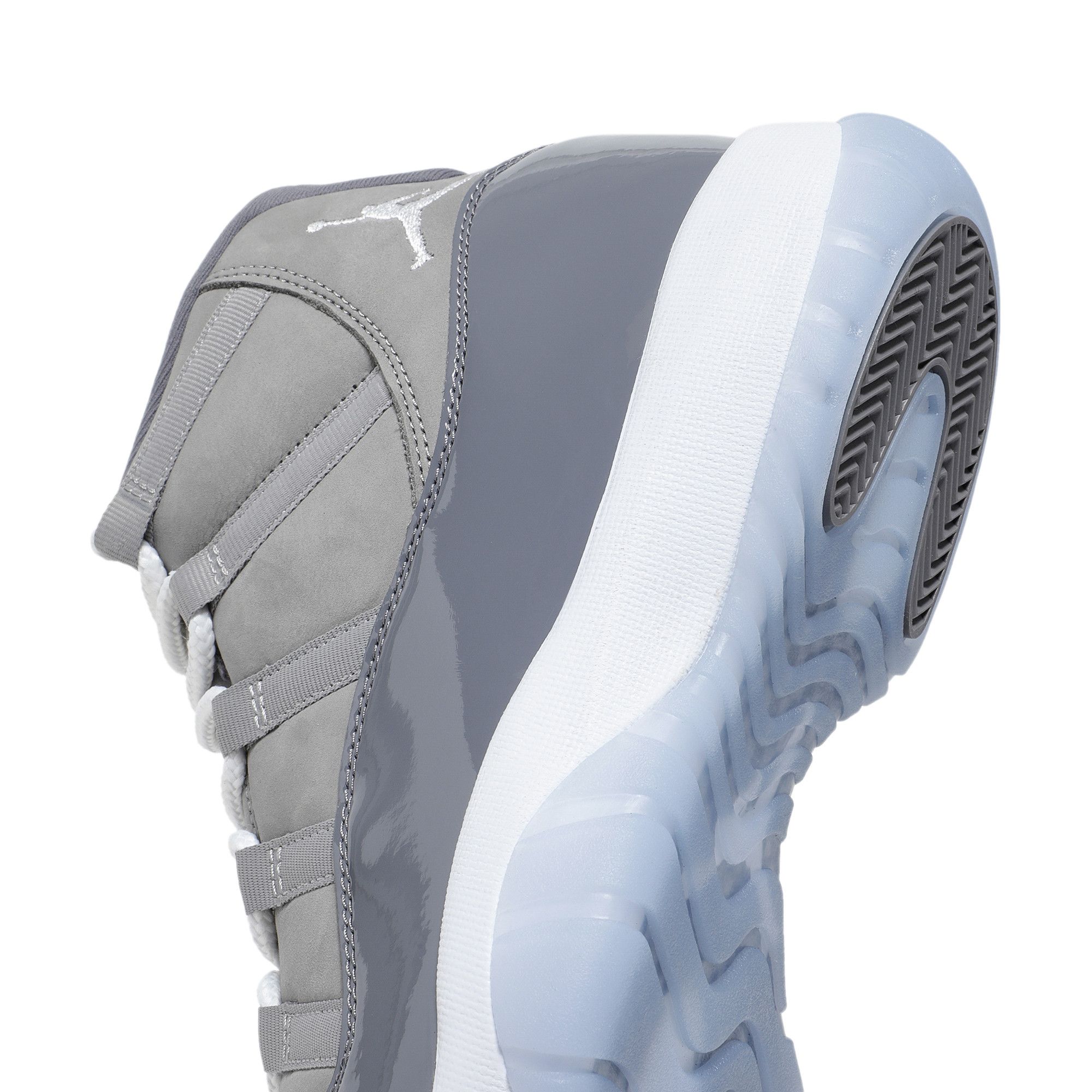 The 2021 edition of the Air Jordan 11 Retro ‘Cool Grey’ brings back a colorway first released in 2001 and retroed again in 2010. Celebrating the 20th anniversary of the original launch, the mid-top build is faithful to the original, featuring a nubuck upper with tonal webbing lace loops and a shiny patent leather overlay, all rendered in tones of Medium and Cool Grey. A white Jumpman logo is embroidered on the lateral ankle, while a stylized ‘23’ decorates the heel notch. Lightweight cushioning is provided by a full-length Air-sole unit housed within a white Phylon midsole. Underfoot, a translucent outsole reveals a carbon fiber spring plate for enhanced on-court responsiveness.