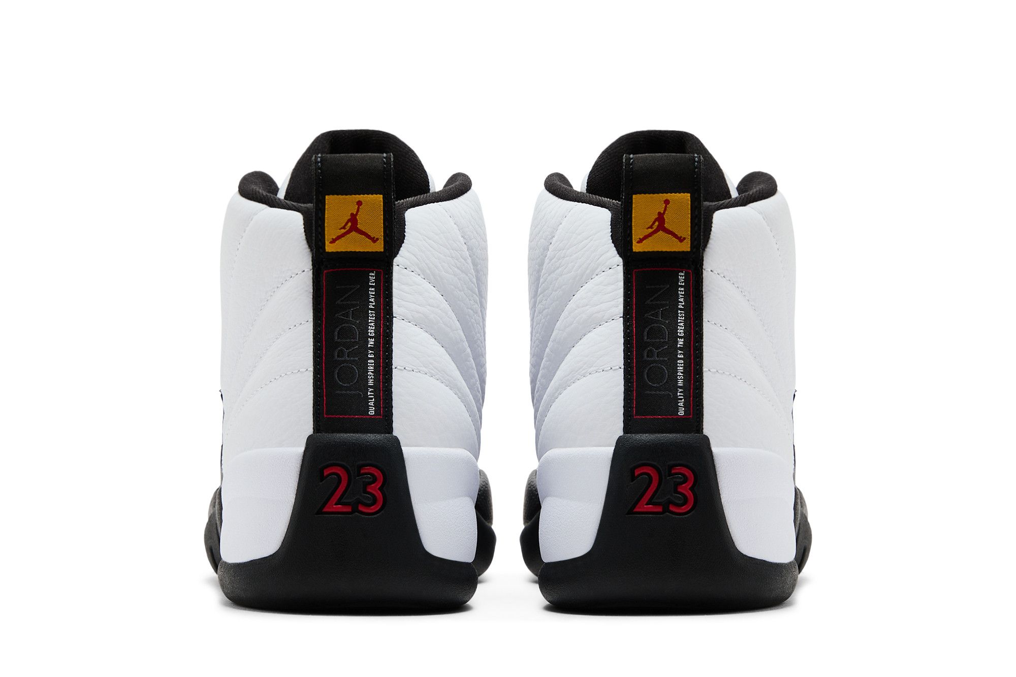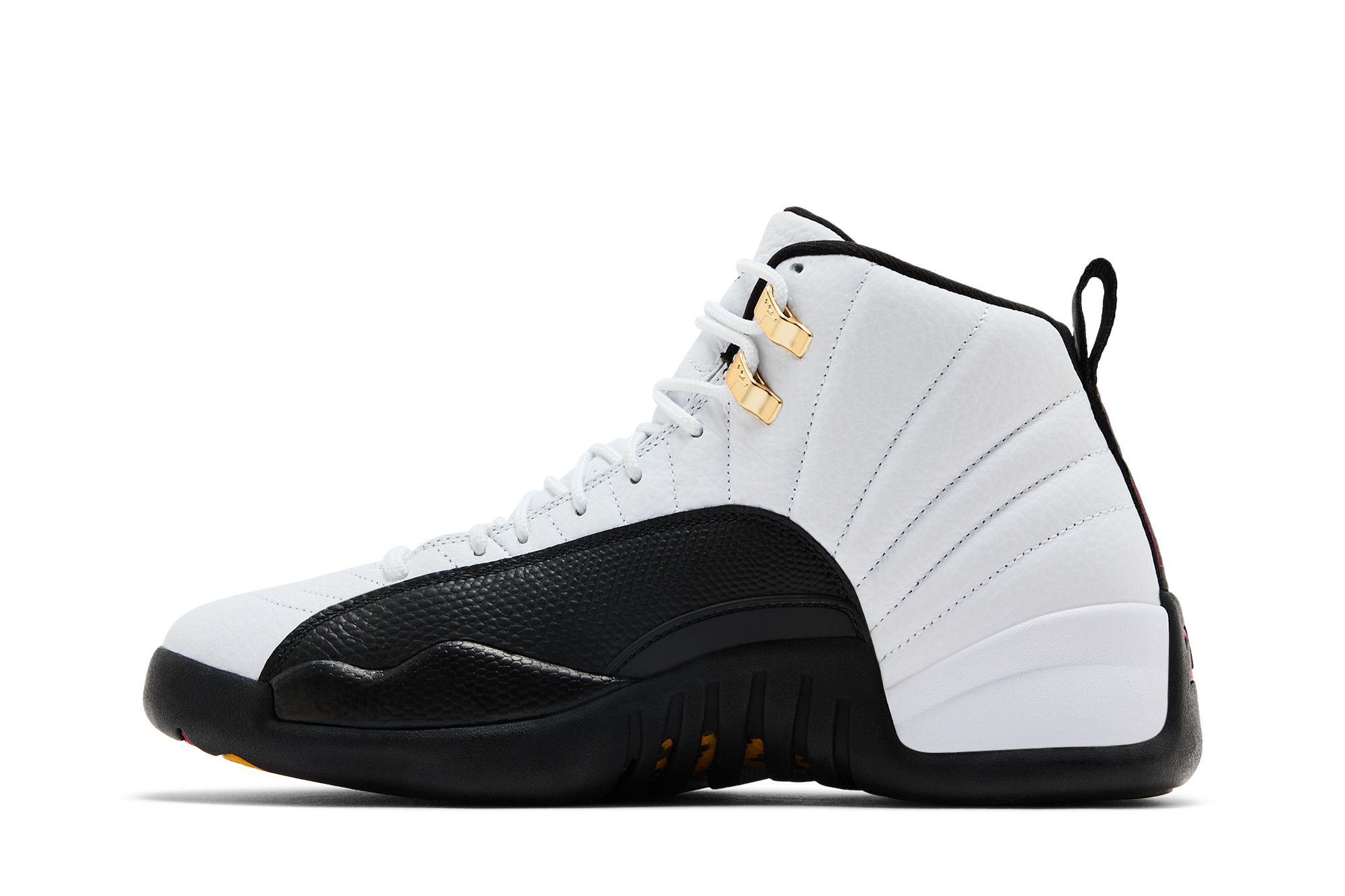 The 2025 edition of the Air Jordan 12 Retro ‘Taxi’ revives an OG colorway, featuring a white leather upper with radiating stitch lines and upper molded eyelets in metallic gold. Black lizard-textured overlays offer improved support and durability, while Jumpman branding adorns the tongue and a pull tab affixed to the heel. Performance benefits include a lightweight Phylon midsole with full-length Zoom Air cushioning. Underfoot, the outsole is equipped with herringbone traction pods and an exposed carbon fiber shank plate.