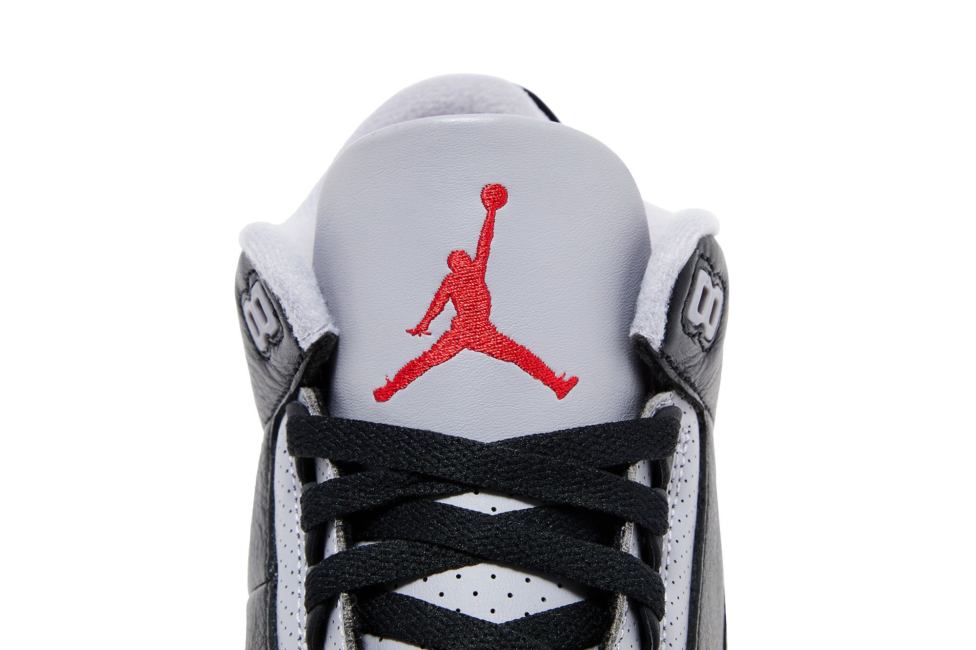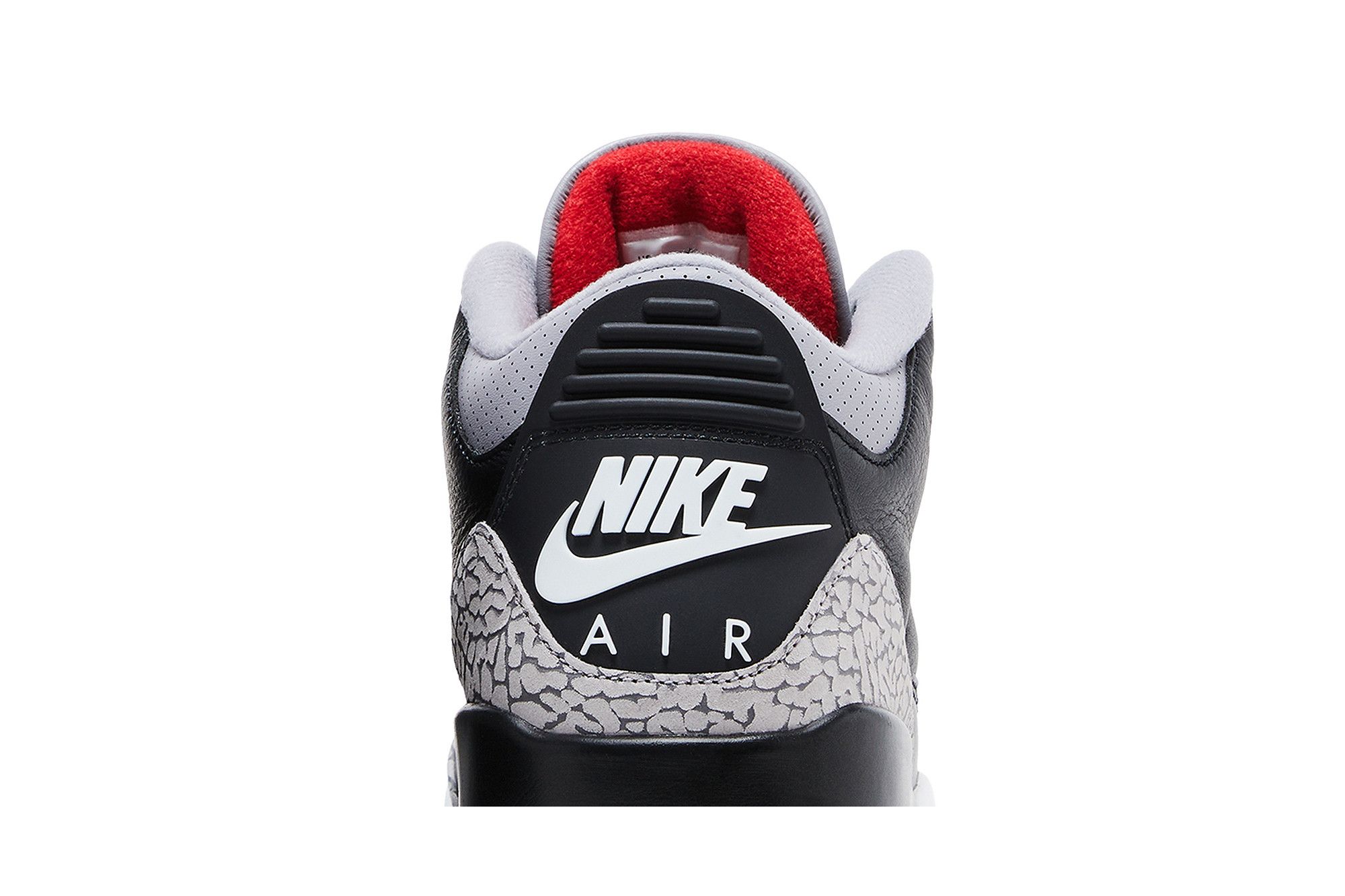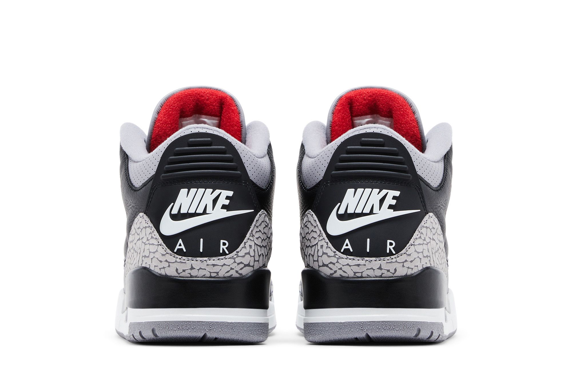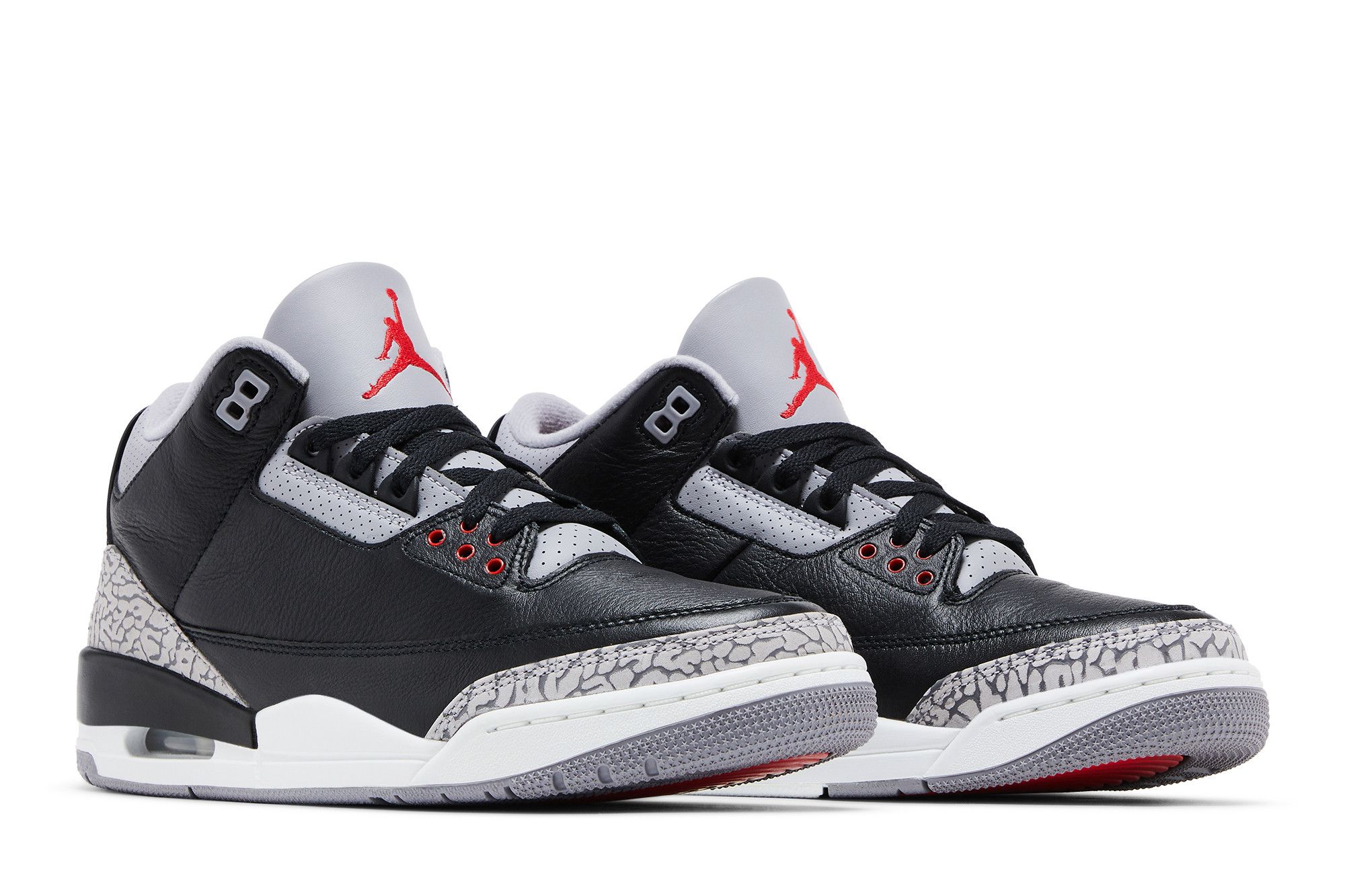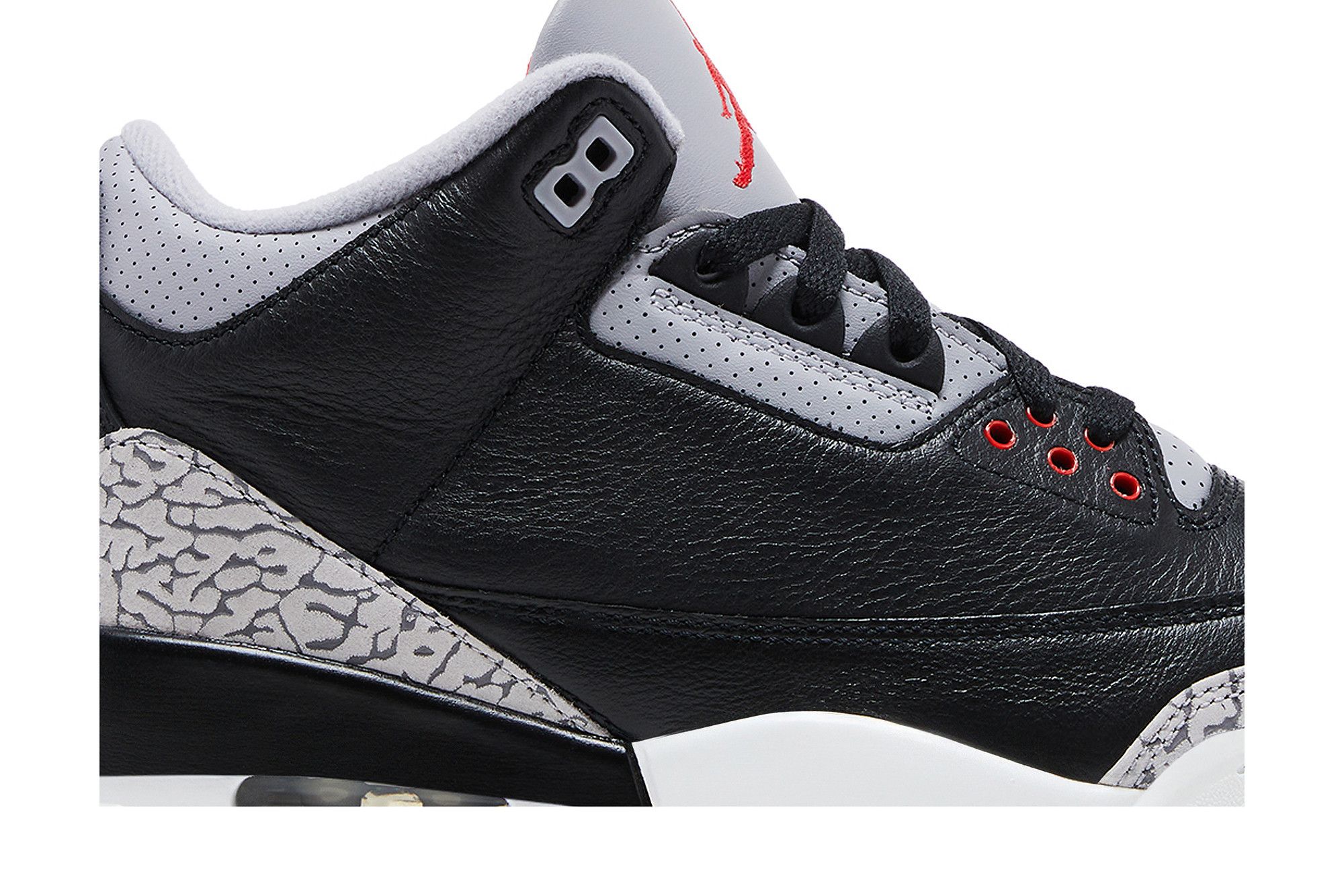 The 2024 edition of the Air Jordan 3 Retro OG ‘Black Cement’ revives an iconic colorway of the legacy silhouette. This release is true to the 1988 original, featuring a black tumbled leather upper with grey elephant print overlays at the forefoot and heel. An embroidered Jumpman in Fire Red graces the tongue, while a raised Nike Air logo decorates the back heel. The sneaker sits atop a white polyurethane midsole, fitted with visible Air-sole cushioning and accented with a splash of black along the heel. A grey rubber outsole provides durable traction underfoot.
