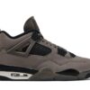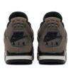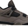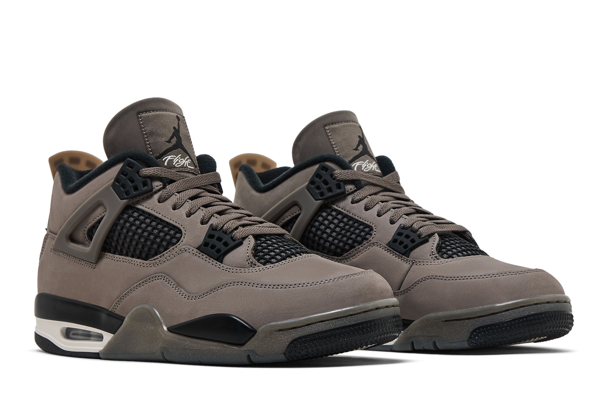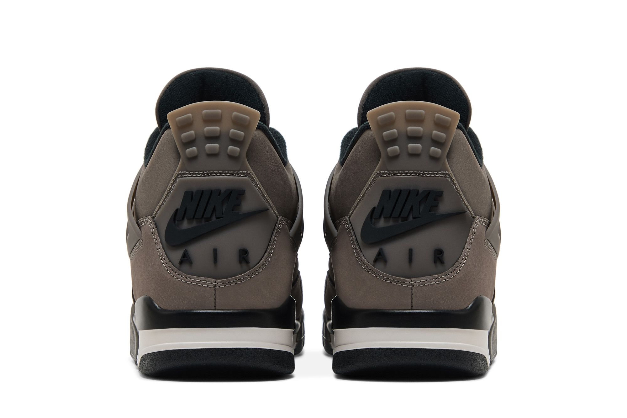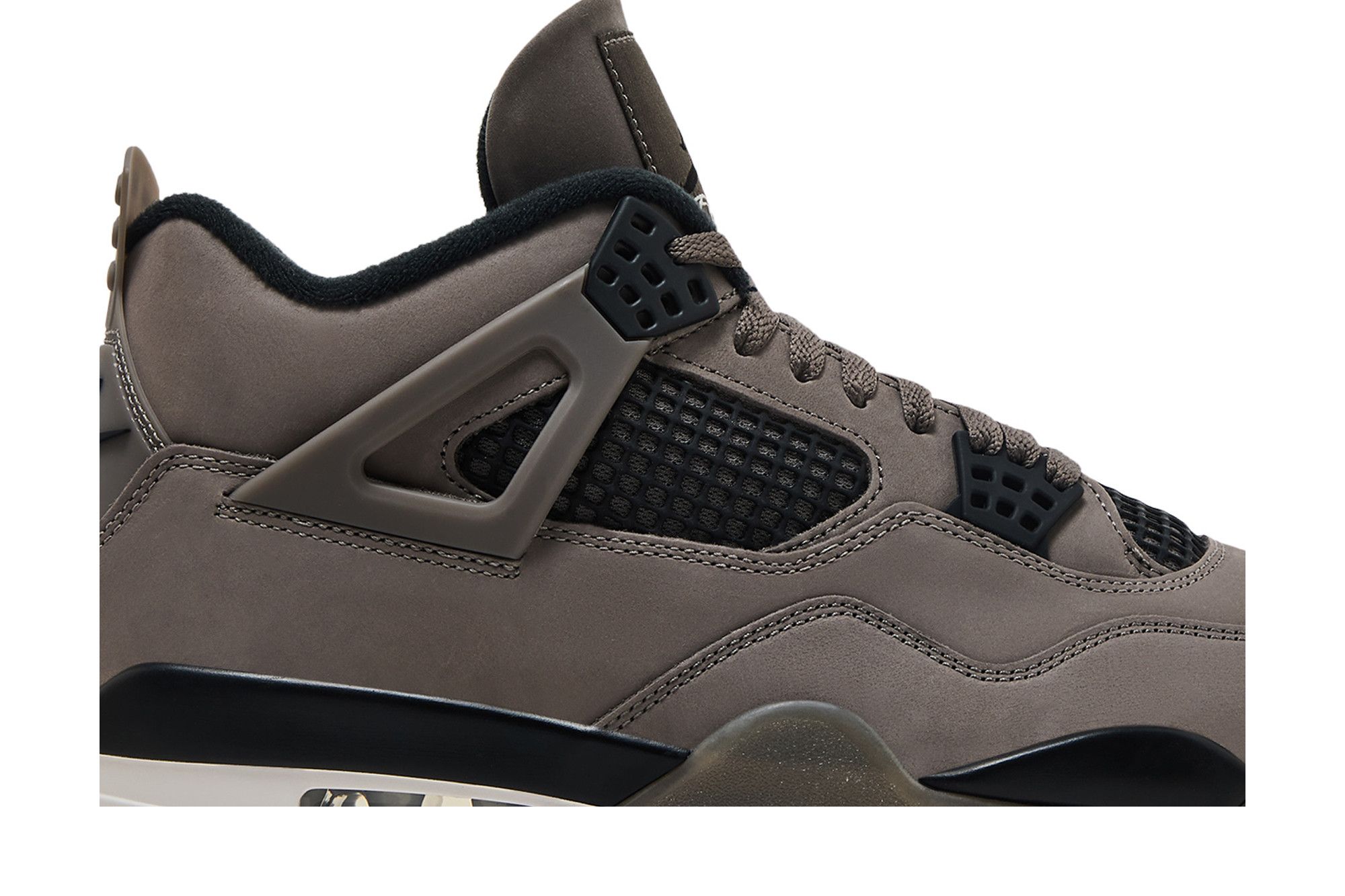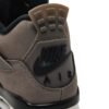 The Air Jordan 4 Retro ‘Cave Stone’ showcases a dark taupe hue on the smooth nubuck upper, featuring contrasting black accents on the quarter panel netting, molded eyelets, and textile collar lining. A Jumpman icon adorns the woven Flight tongue tag, while Nike Air branding graces the molded heel tab. Lightweight cushioning is provided by a white and black polyurethane midsole with visible Air-sole cushioning in the heel.