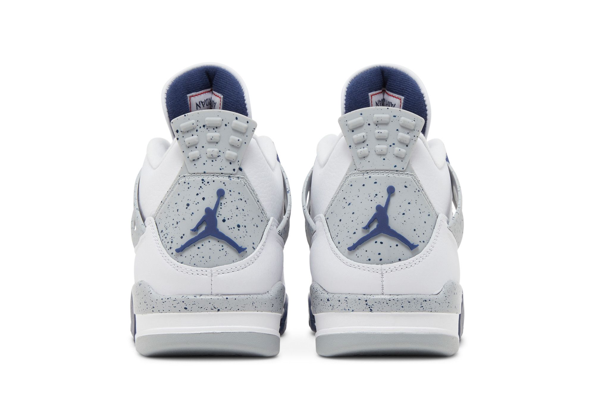 The Air Jordan 4 Retro ‘Midnight Navy’ dresses the legacy silhouette in the same color blocking used on the OG ‘Fire Red’ colorway. The upper is constructed from white leather with black support wings, a matching black heel tab with embossed Jumpman branding, and navy molded eyelets. A second Jumpman icon adorns the woven tongue tag in crimson. The sneaker rides on a two-tone polyurethane midsole, featuring encapsulated Air in the forefoot and a visible unit in the heel.