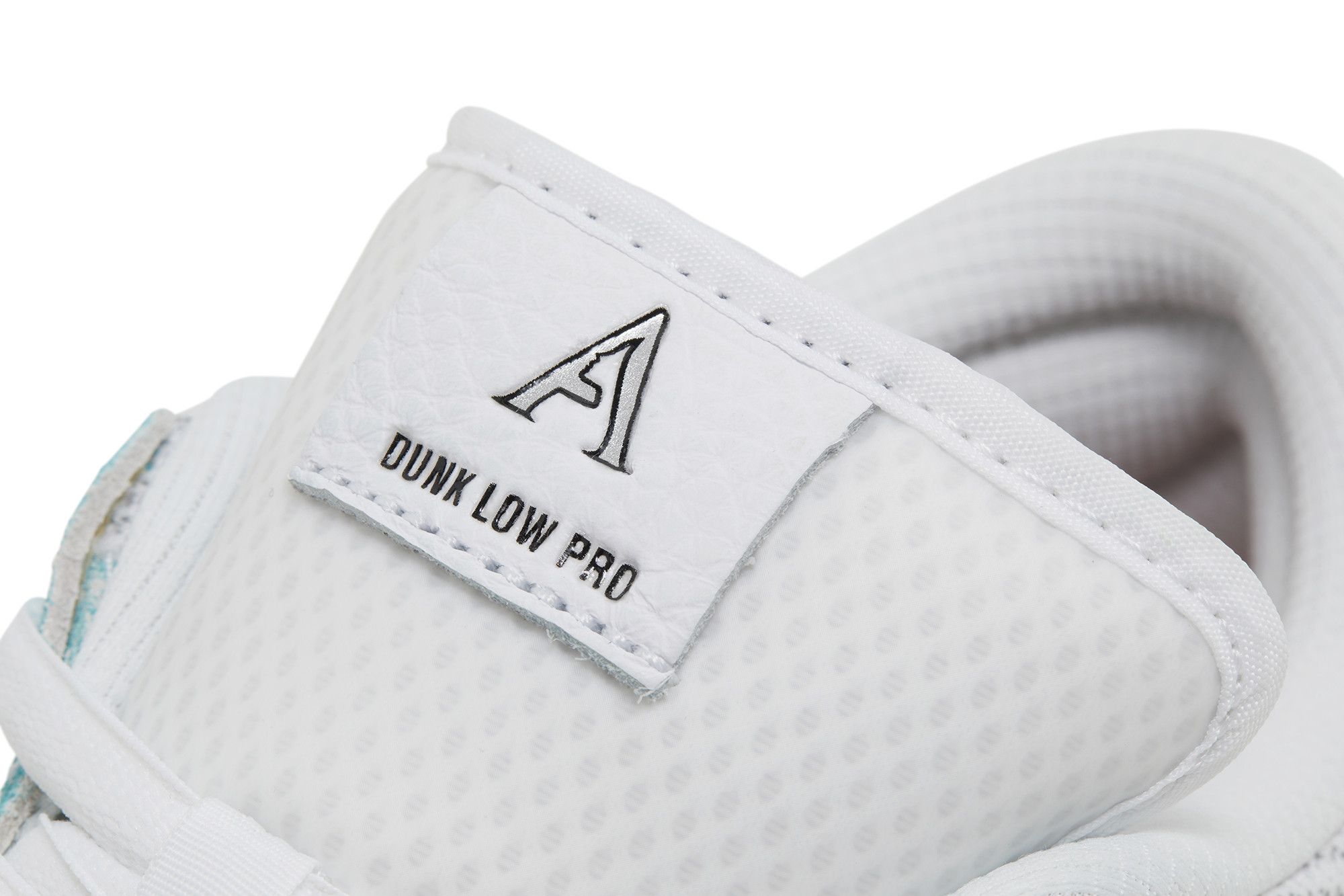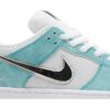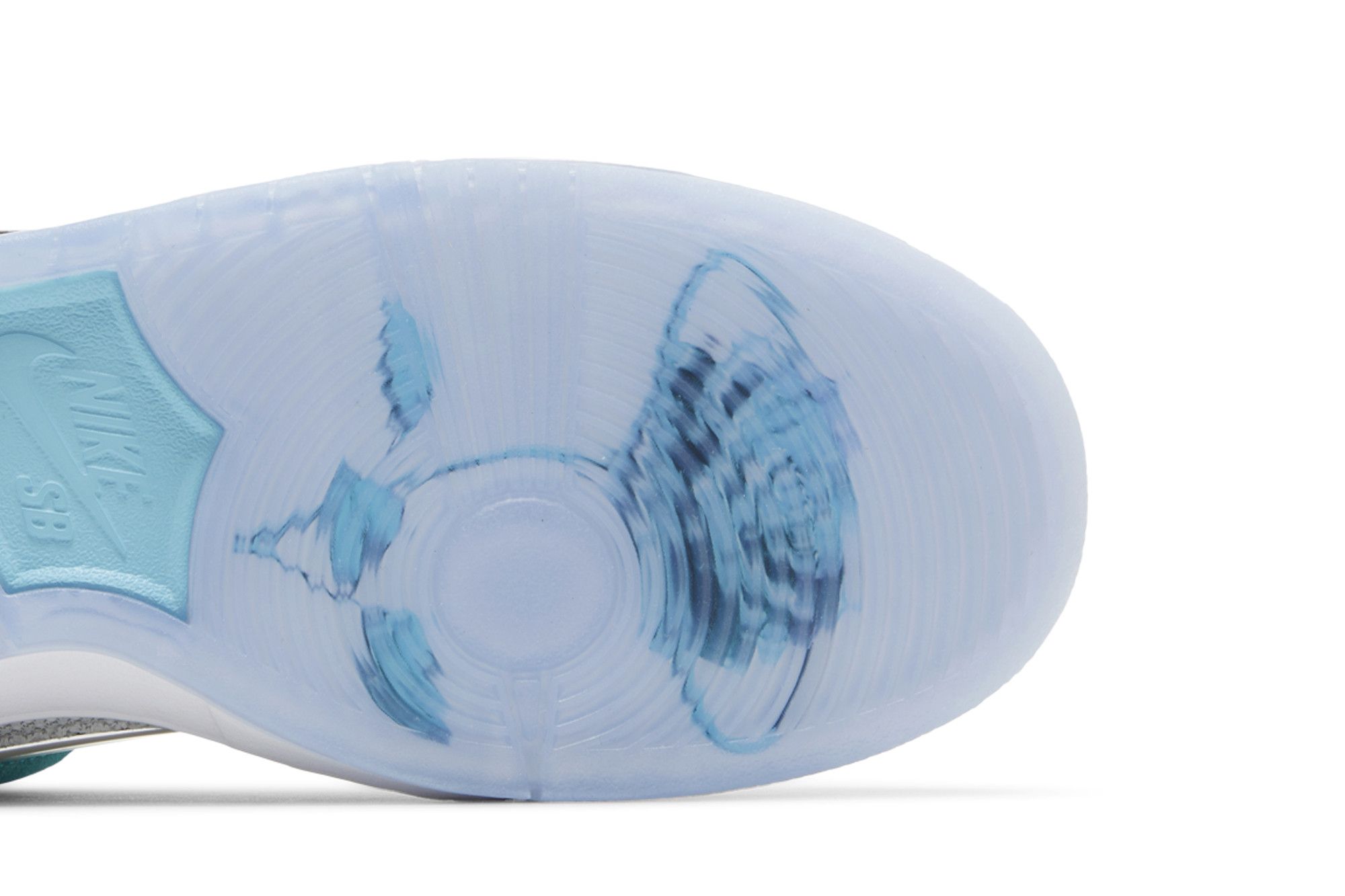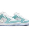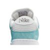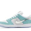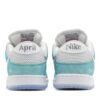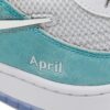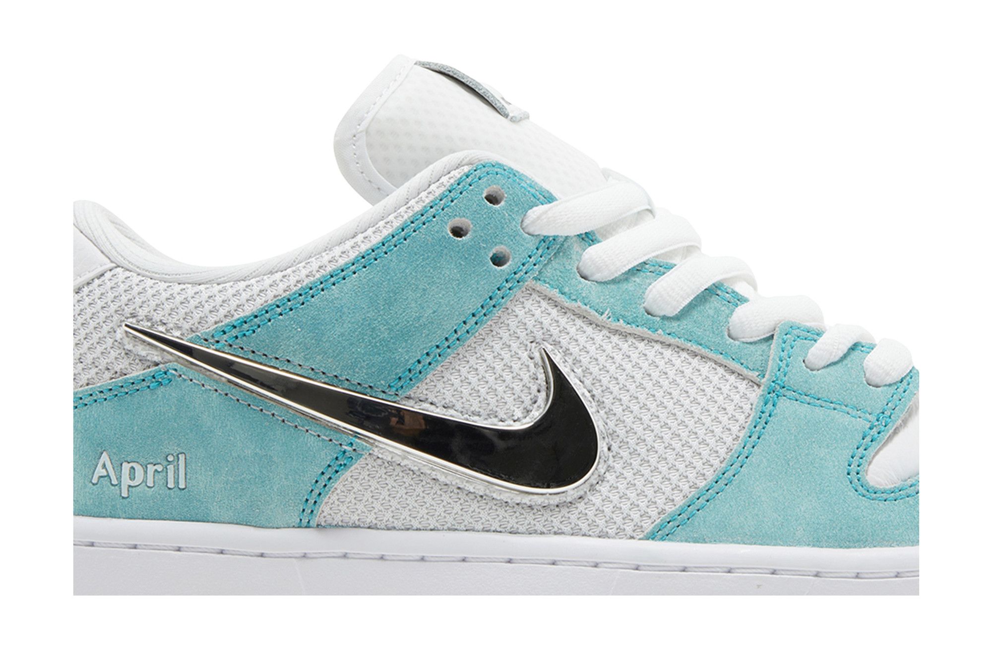 The April Skateboards x Nike Dunk Low SB ‘Turbo Green’ dresses the retro model in an airy white mesh upper, accented with a chrome Swoosh and fortified with suede overlays in a bright teal finish. White leather is utilized on the toe box and back tab, marked with April and Nike SB branding across the left and right shoe. ‘April’ is stamped on the lateral heel, while each tongue tag displays mismatched Nike SB and April logos. Underfoot, a translucent rubber outsole reveals a unique floral graphic.