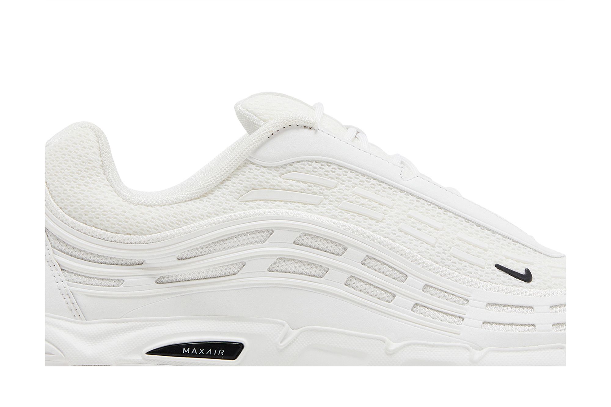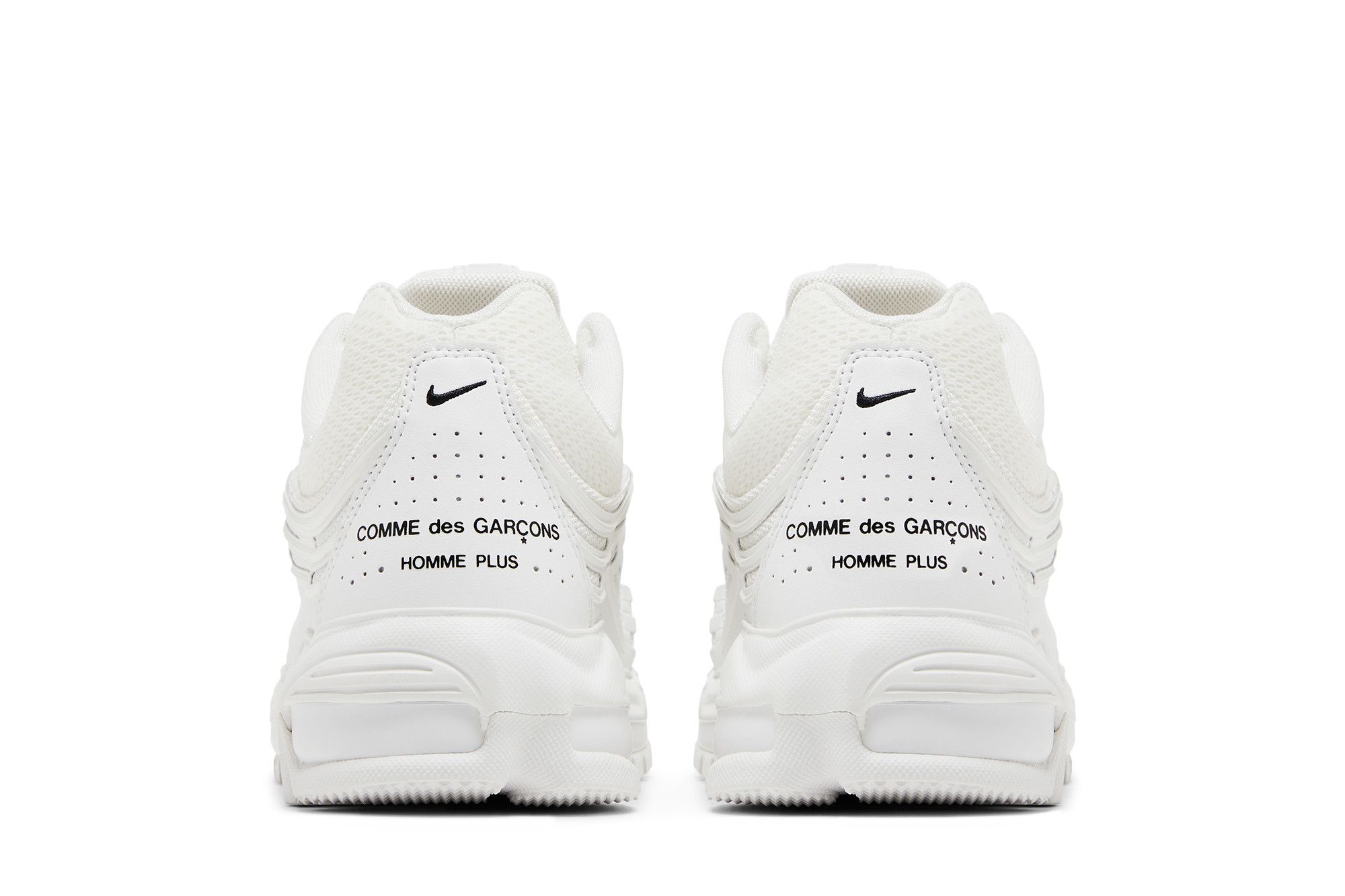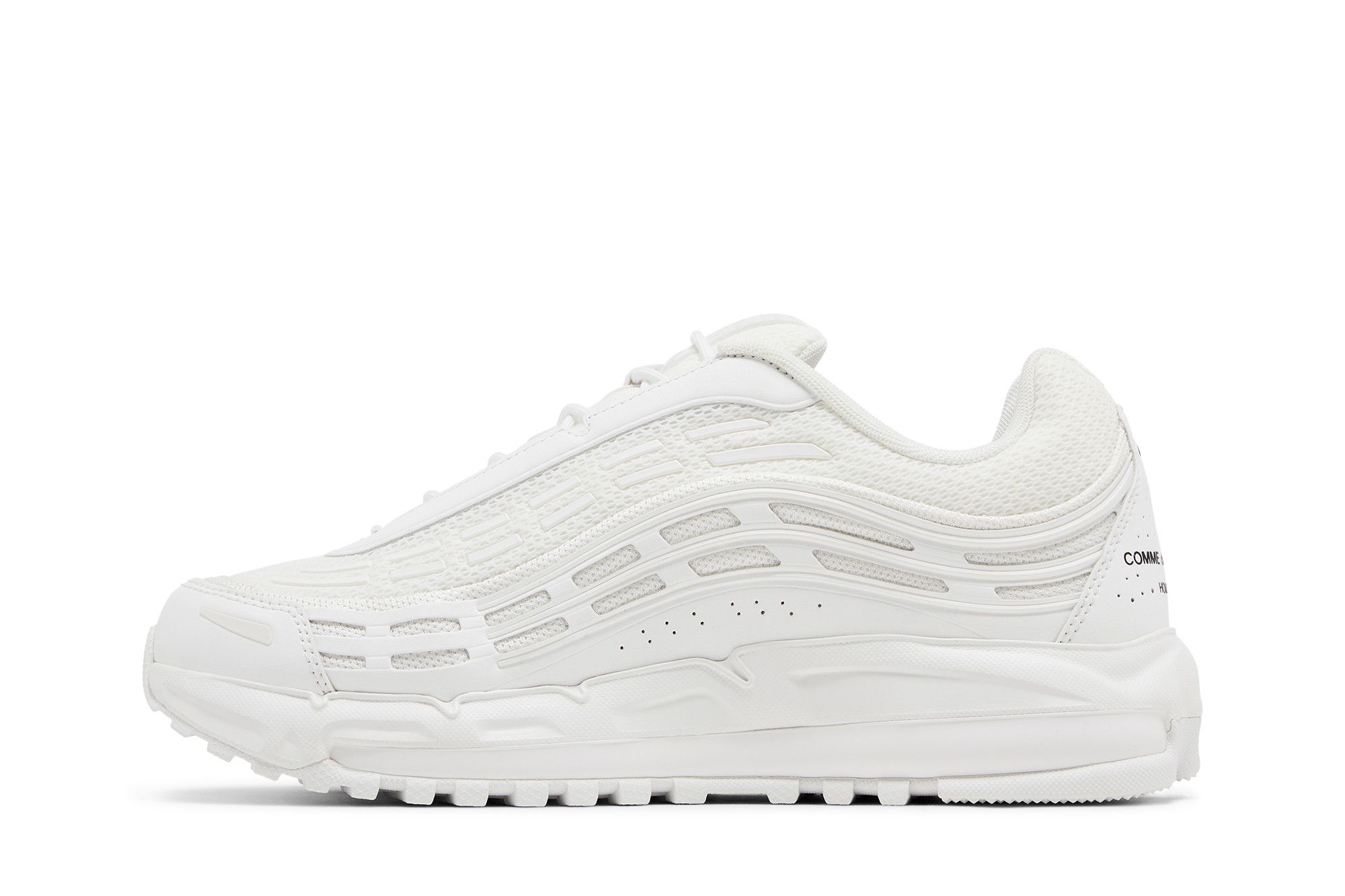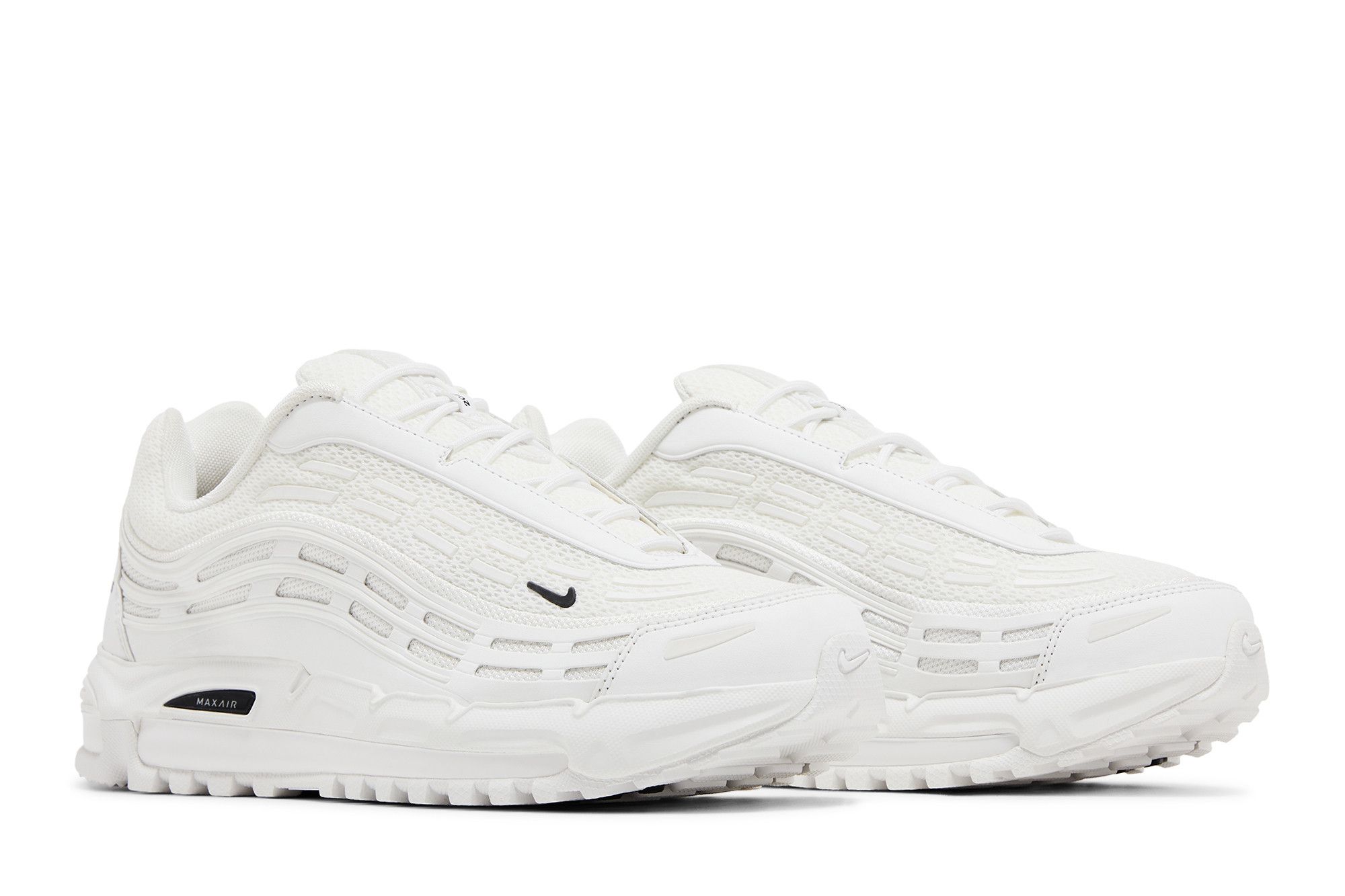 The Comme des Garçons Homme Plus x Nike Air Max TL 2.5 ‘Summit White’ revives the retro runner as part of a three-piece pack. Dressed in monochromatic white, the upper combines a mesh base with wavy synthetic leather overlays. A mini-Swoosh at the lateral forefoot is rendered in contrasting black, matching the dual branding hits that appear on the back heel. Anchoring the sneaker is a solid white foam midsole with full-length Air-sole cushioning.