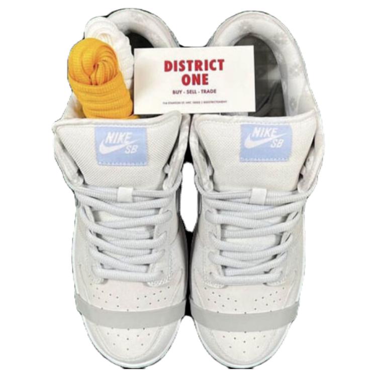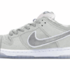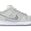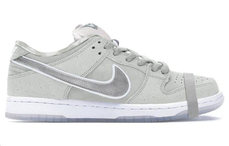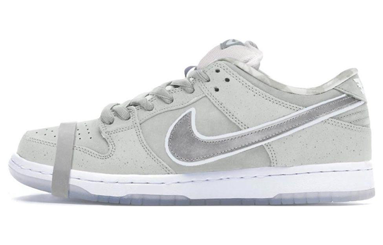 The Concepts x Nike Dunk Low OG SB QS “White Lobster” Friends & Family edition is a rare collaborative sneaker inspired by the New England lobster, featuring a predominantly white and photon dust upper with subtle light blue speckling and gray accents. It showcases a plaid lining and an elastic band resembling a lobster’s claw, emphasizing luxury with its premium materials like nubuck. This exclusive model carries unique design touches distinguishing it from other releases in the Lobster series, making it highly coveted among collectors.