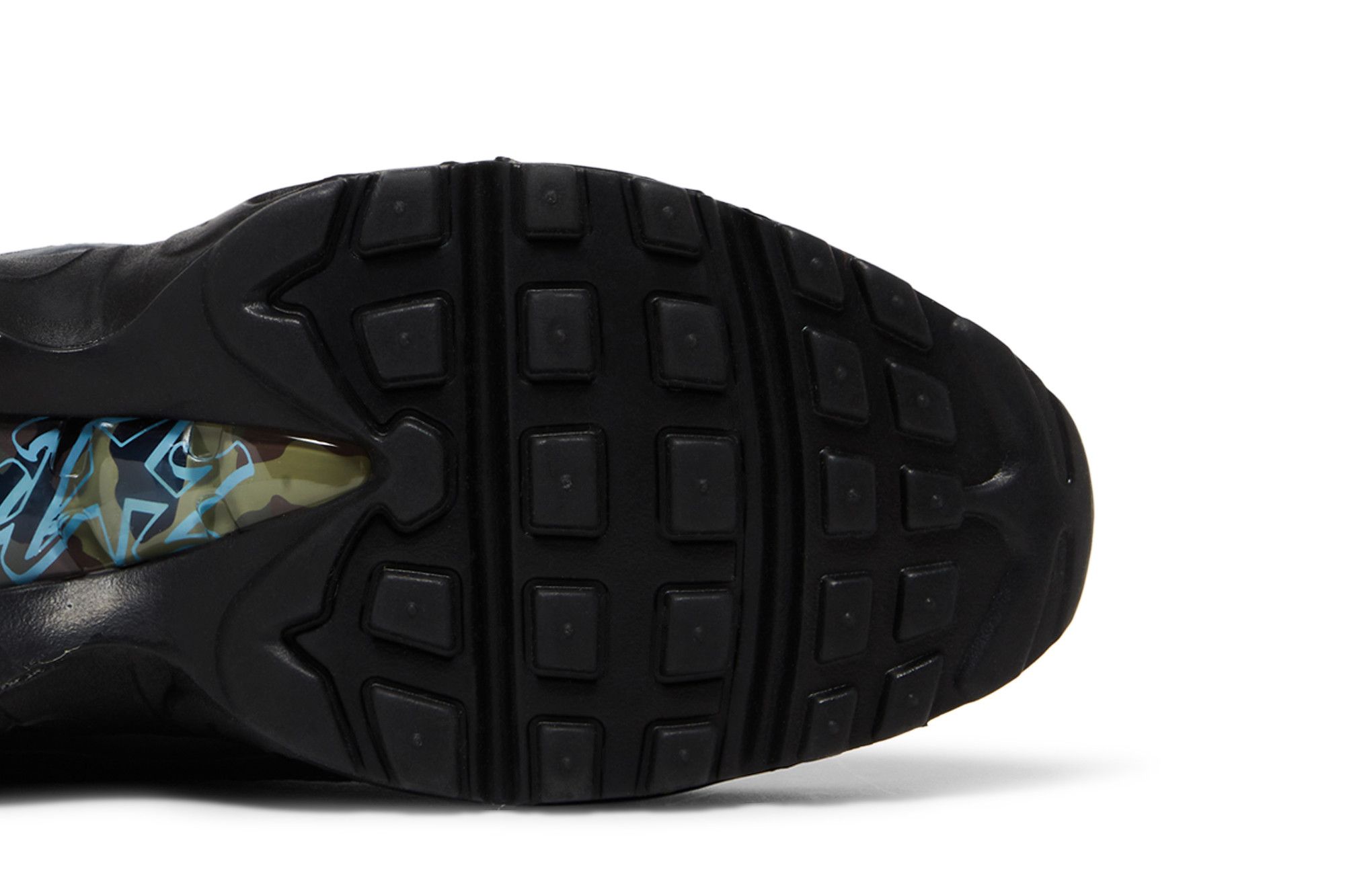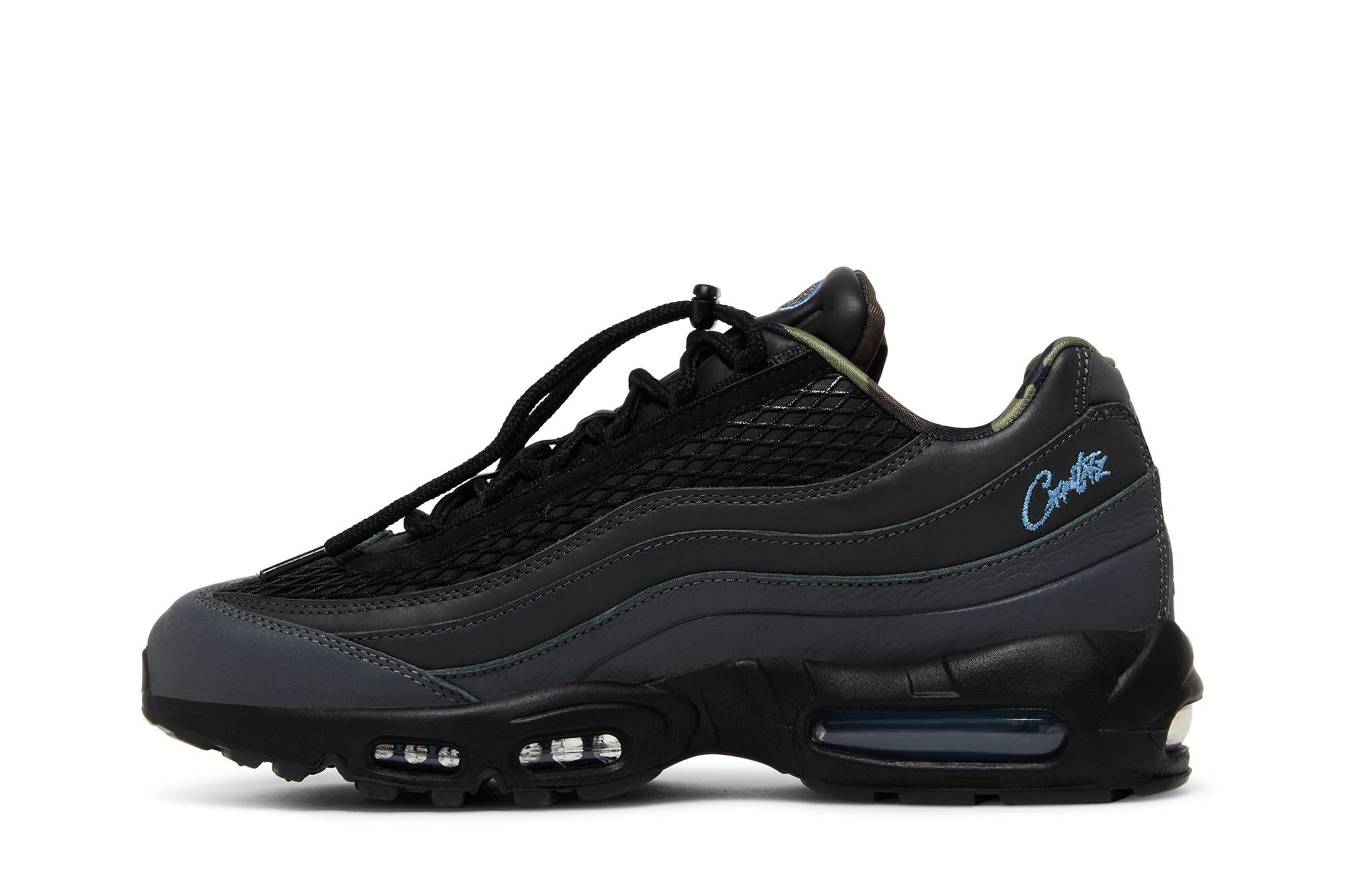 Dropping as part of the UK streetwear brand’s ‘Rules the World’ pack, the Corteiz x Nike Air Max 95 SP ‘Aegean Storm’ updates the retro runner with neutral tones and a refreshed build. Drawcord lacing secures the upper, featuring black netting surrounding the throat and wavy leather overlays in a dark grey finish. ‘Corteiz’ is inscribed in bright blue embroidery on the shoe’s lateral side, complementing the label’s Alcatraz logo on the tongue patch. The interior lining and sockliner are covered in a woodland camo print, bringing a military flourish to the sleek design. Anchoring the sneaker is a solid black polyurethane midsole with blue-tinged Max Air units in the forefoot and heel.