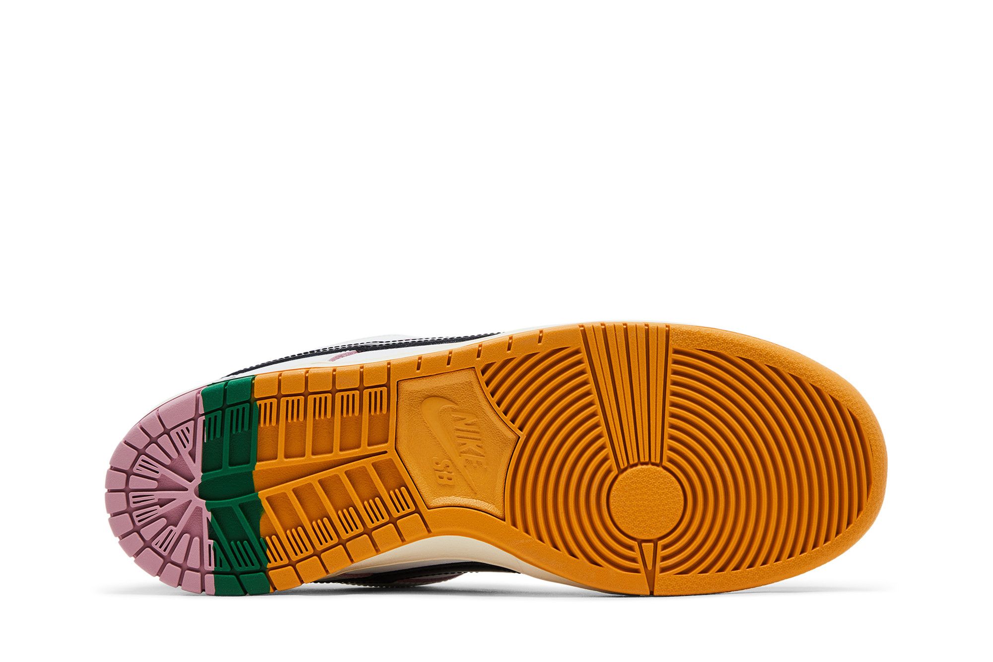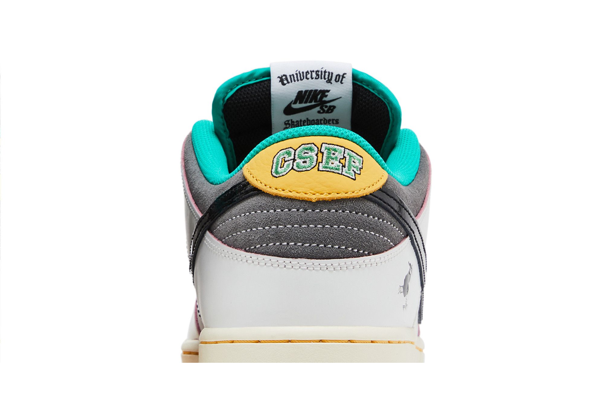 The CSEF x Nike Dunk Low SB ‘White Clear Emerald’ celebrates the intersection of higher education and skateboarding culture. Representing Nike’s first collaboration with the College Skateboarding Educational Foundation, the low-top sports a Summit White leather upper with contrasting black accents on the suede toe box, patent leather Swoosh, and padded tongue. Grey suede wraps the low-cut collar, which is lined in emerald green mesh. Yellow leather back tabs display mismatched Nike and CSEF branding. A scantron-inspired tag adorns the tongue, while a graphic depicting CSEF’s mascot graces the lateral heel.