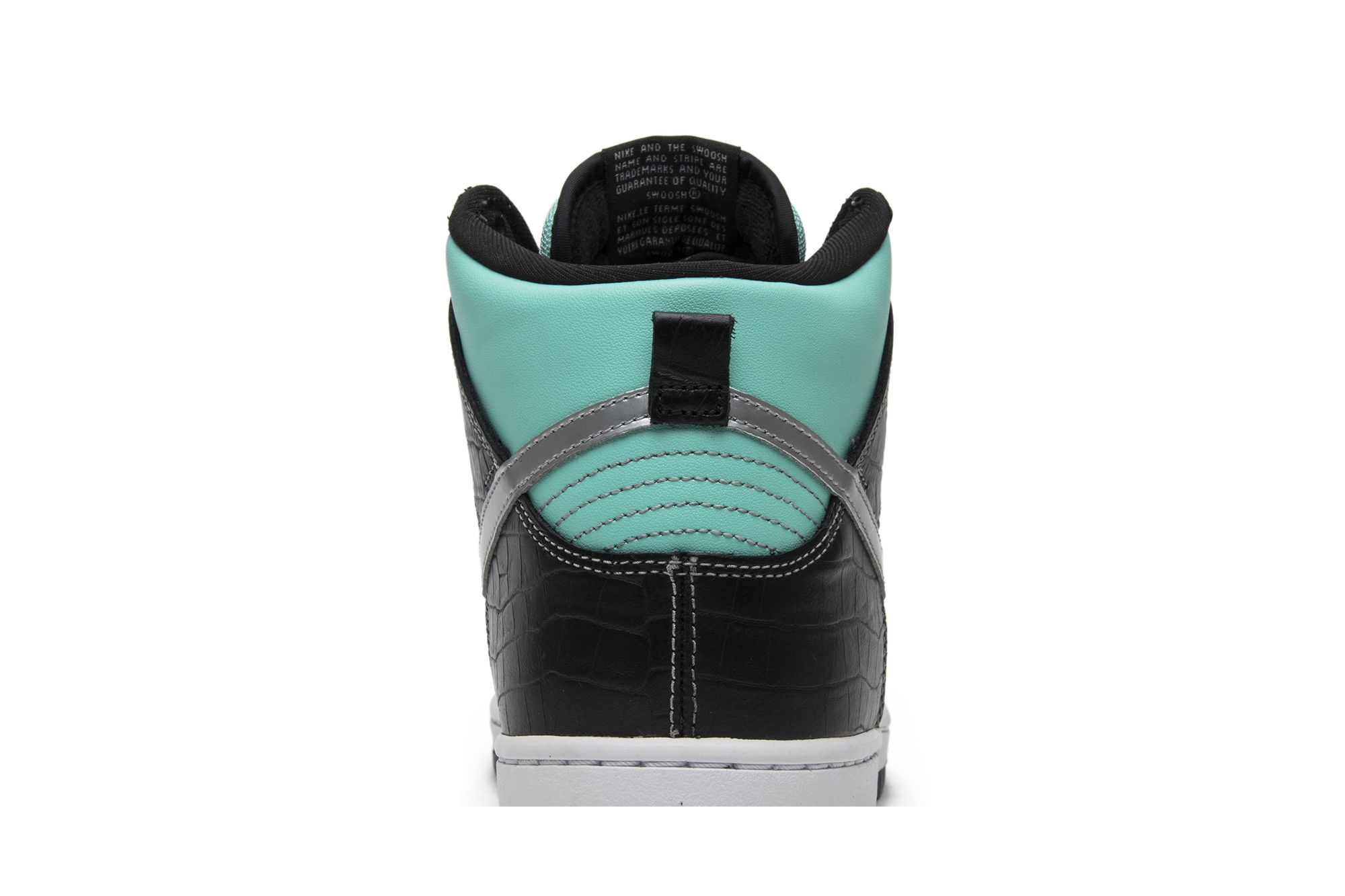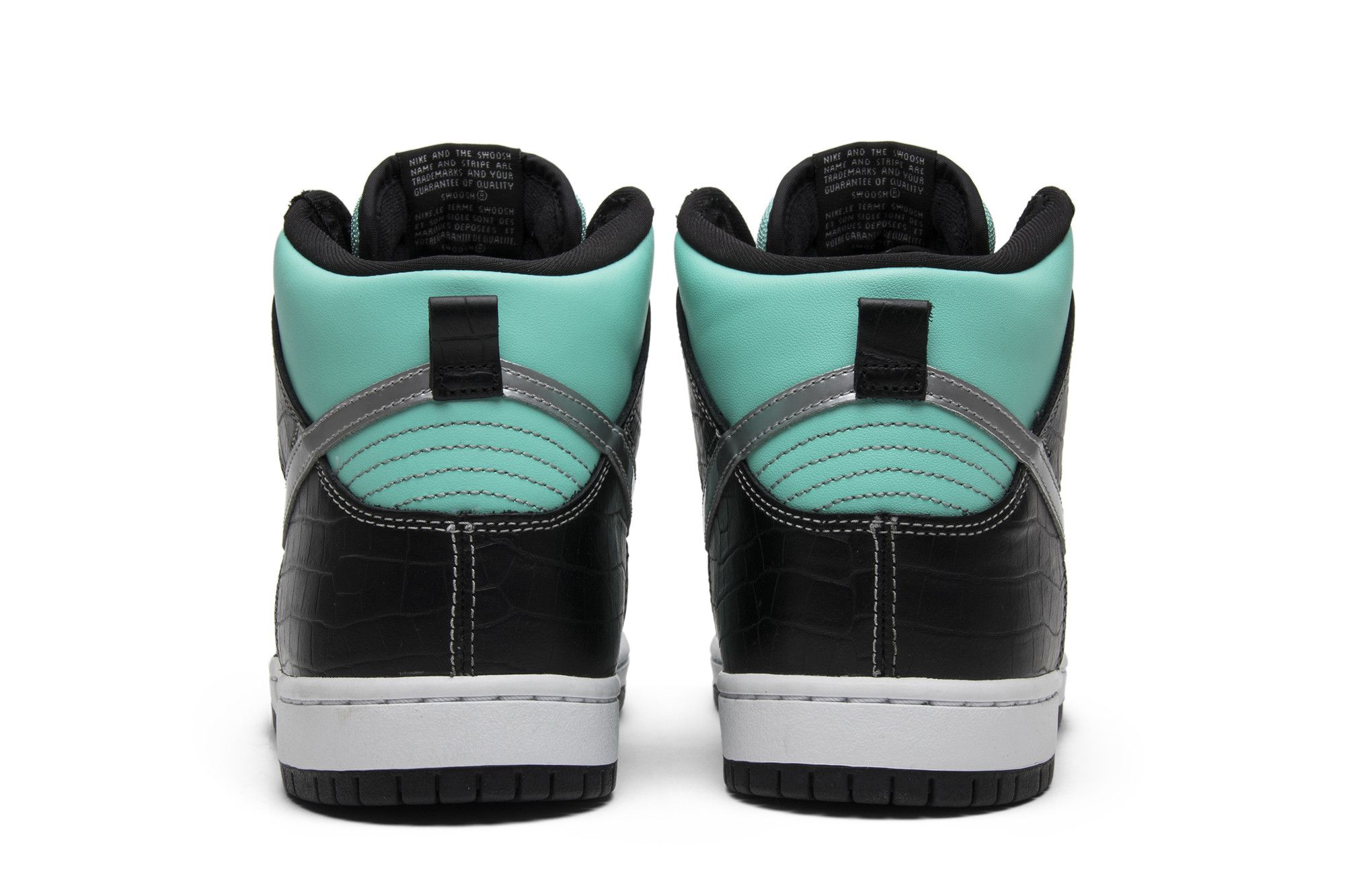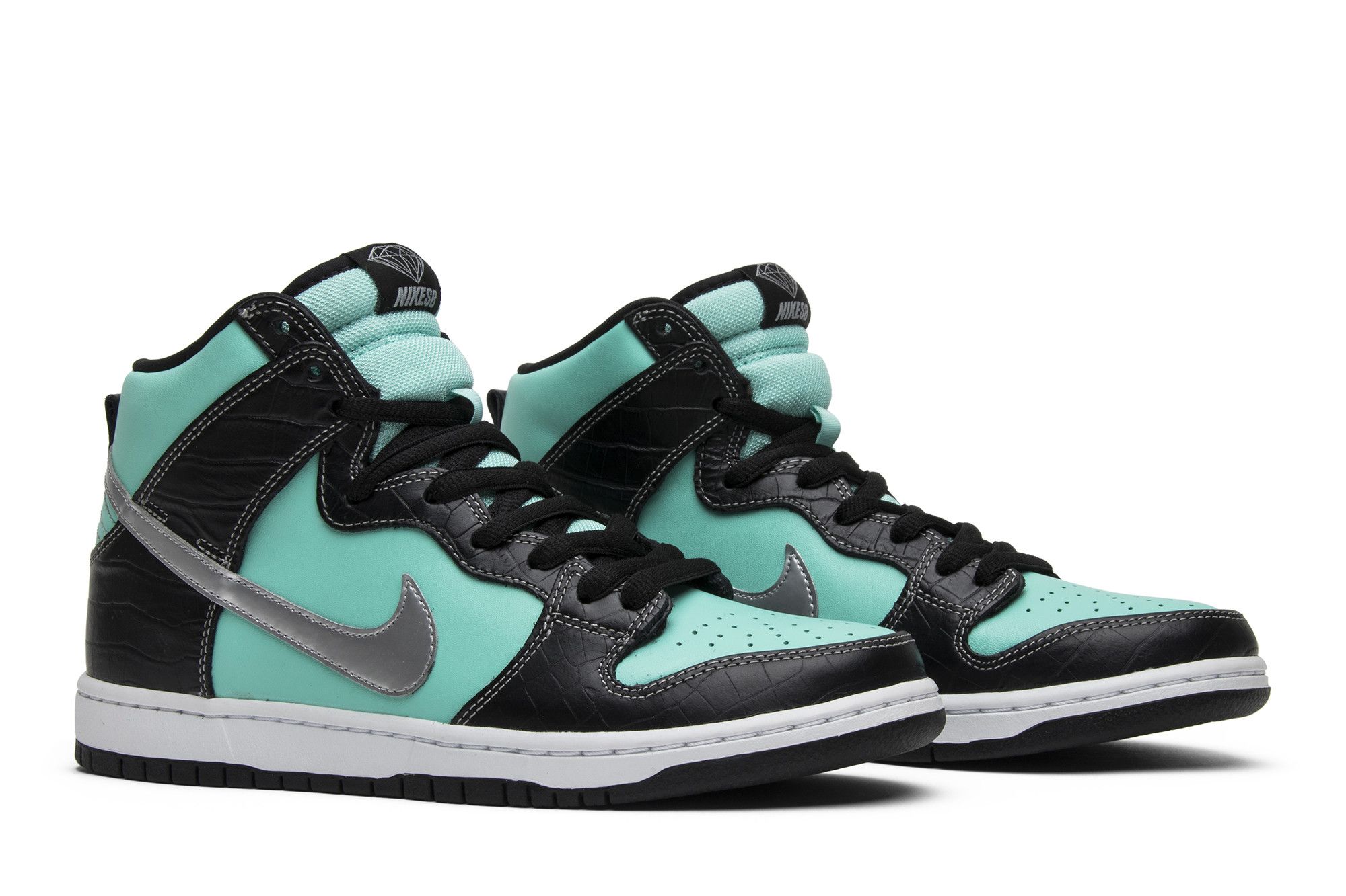 The Nike Diamond Supply Co. x Dunk High Premium SB features the same colorway as Diamond Supply’s SB Dunk Low from Nike SB’s 2005 Team Manager series. The design features an Aqua leather upper with black faux croc skin overlays and a chrome Swoosh on the side panels. Released in February 2014, the sneaker also comes with a white midsole and black outsole.