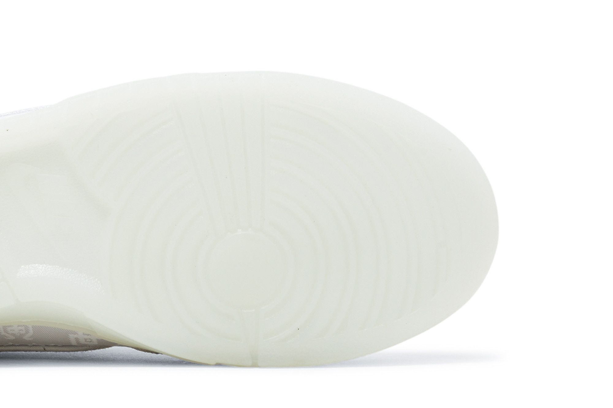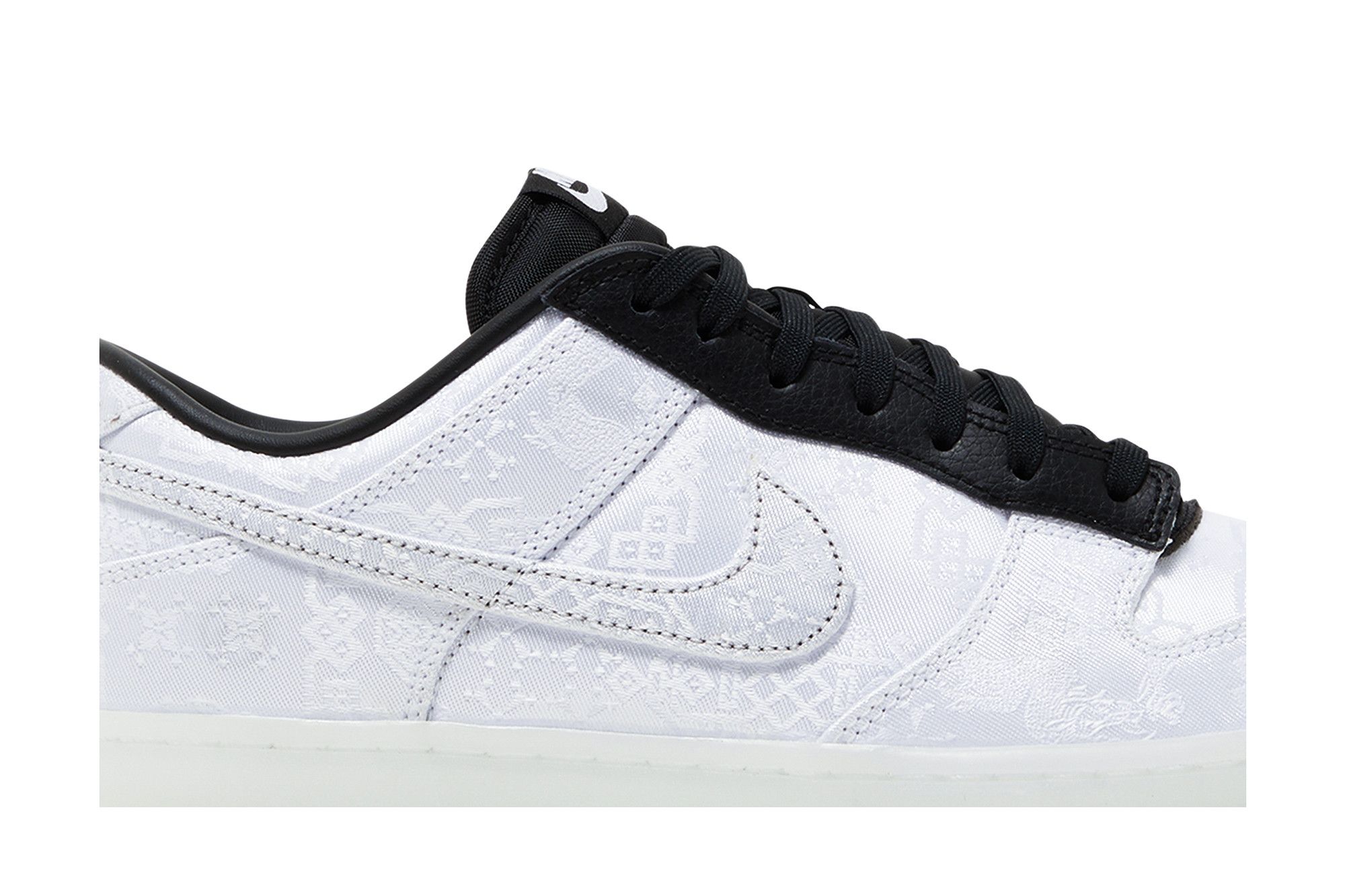 The Fragment Design x CLOT x Nike Dunk Low SP ‘20th Anniversary’ brings together a trio of heavy-hitting creative partners, who’ve united to celebrate two decades of the Hong Kong-based streetwear brand founded by Edison Chen. He and longtime friend Hiroshi Fujiwara dress the Nike Dunk in a tearaway white silk upper, inspired by CLOT’s 2018 Air Force 1 collaboration and featuring the brand’s tonal Silk Royale pattern. Contrasting black accents land on the tongue, collar lining and back tab, marked with mismatched CLOT and FRGMNT branding. A semi-translucent rubber cupsole anchors the low-profile silhouette.