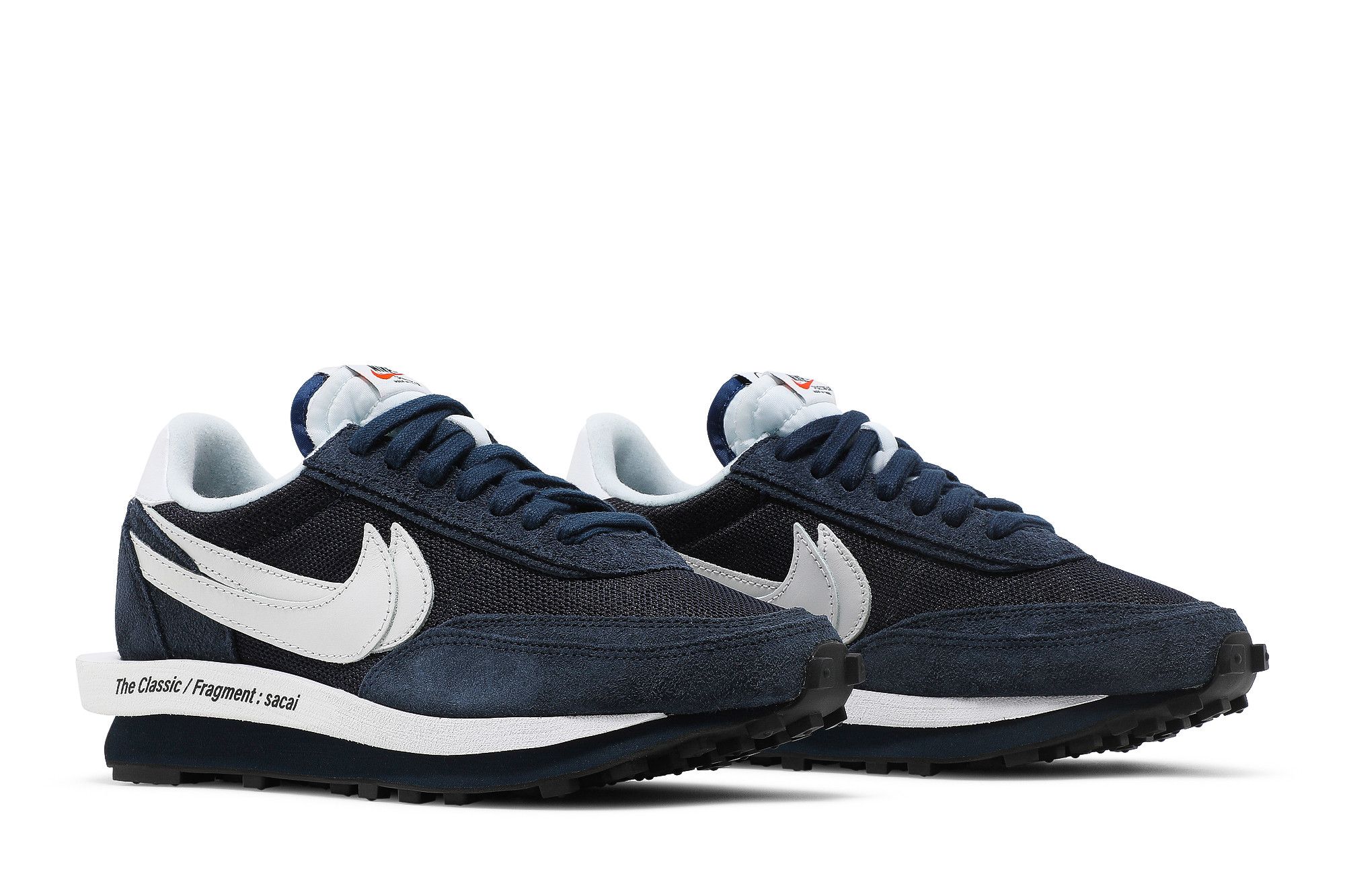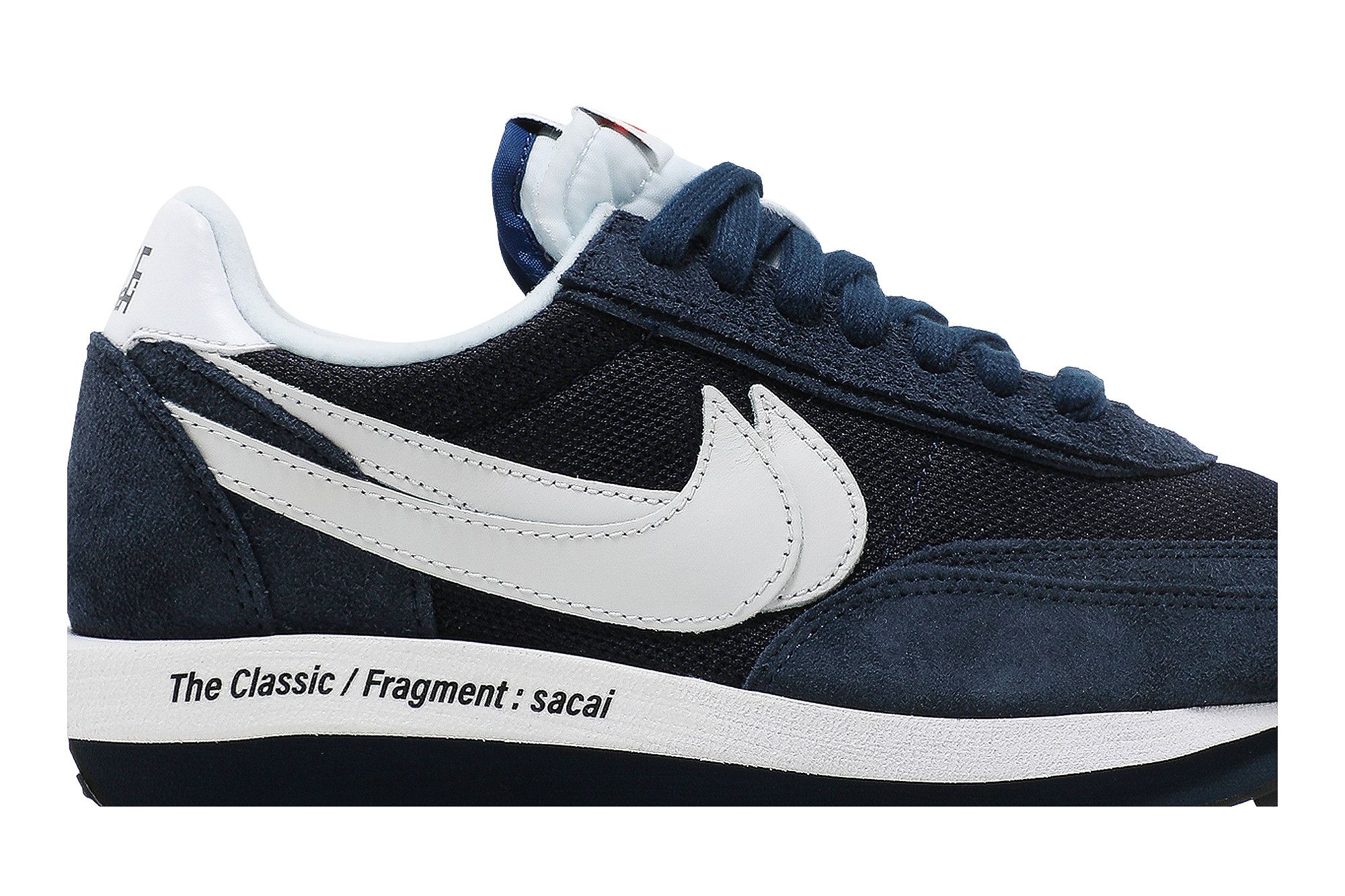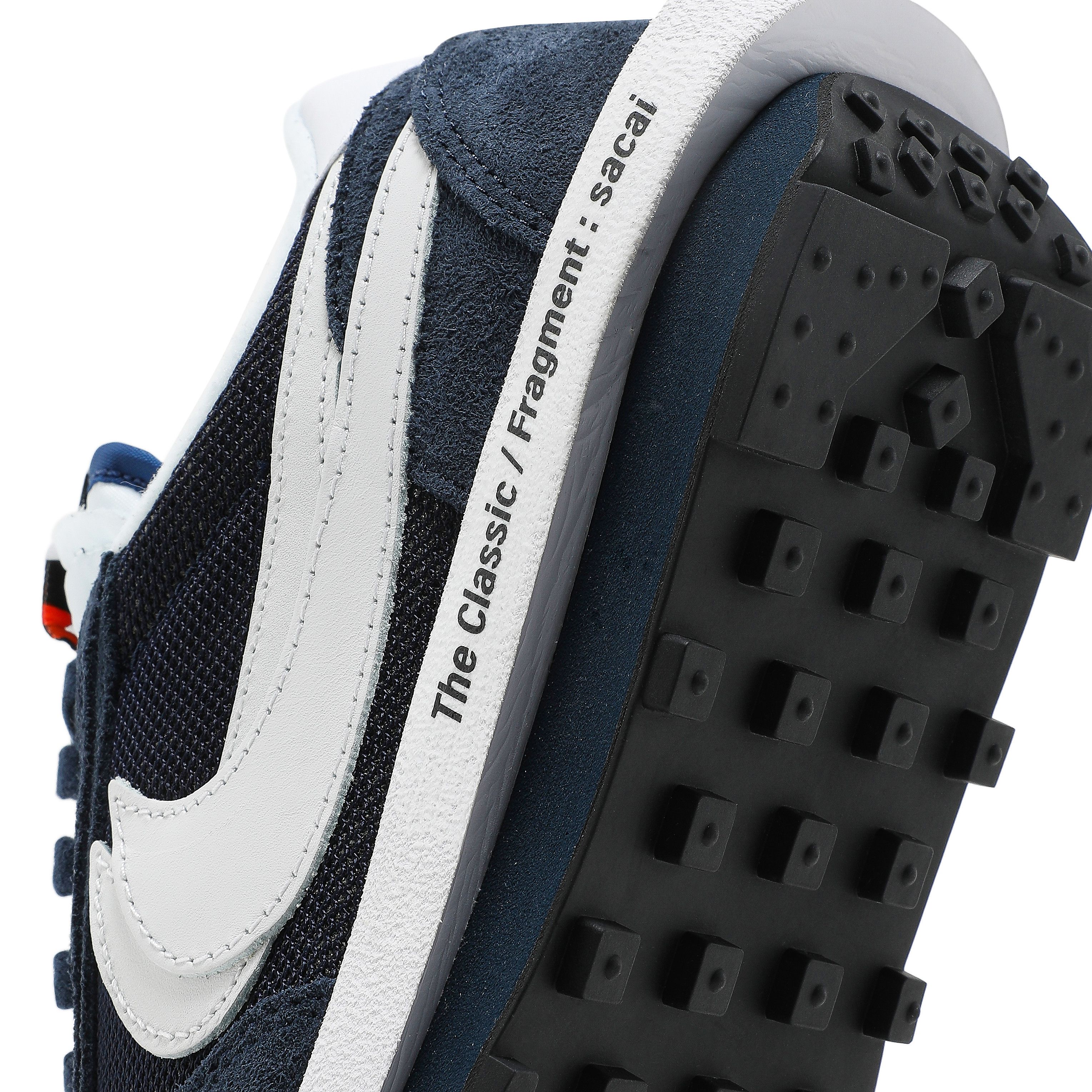 The Fragment Design x sacai x Nike LDV Waffle ‘Blackened Blue’ delivers a sneaker collaboration that leverages the creativity of renowned Japanese labels from the worlds of streetwear and high fashion. Blending elements from the Nike LDV and Waffle Racer, the hybrid silhouette is dressed in a traditional blend of mesh and suede. The tonal navy finish is contrasted by hits of white on the double-stacked leather Swoosh and heel tab, the latter marked with dual Nike and sacai branding. Woven Nike and Fragment tags adorn the doubled-up tongues, while the elongated foam midsole is inscribed with ‘The Classic / Fragment: sacai.’ Nike’s waffle-traction rubber outsole provides superior grip underfoot.