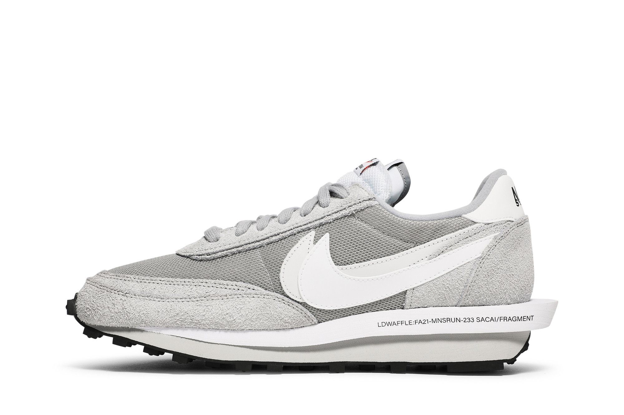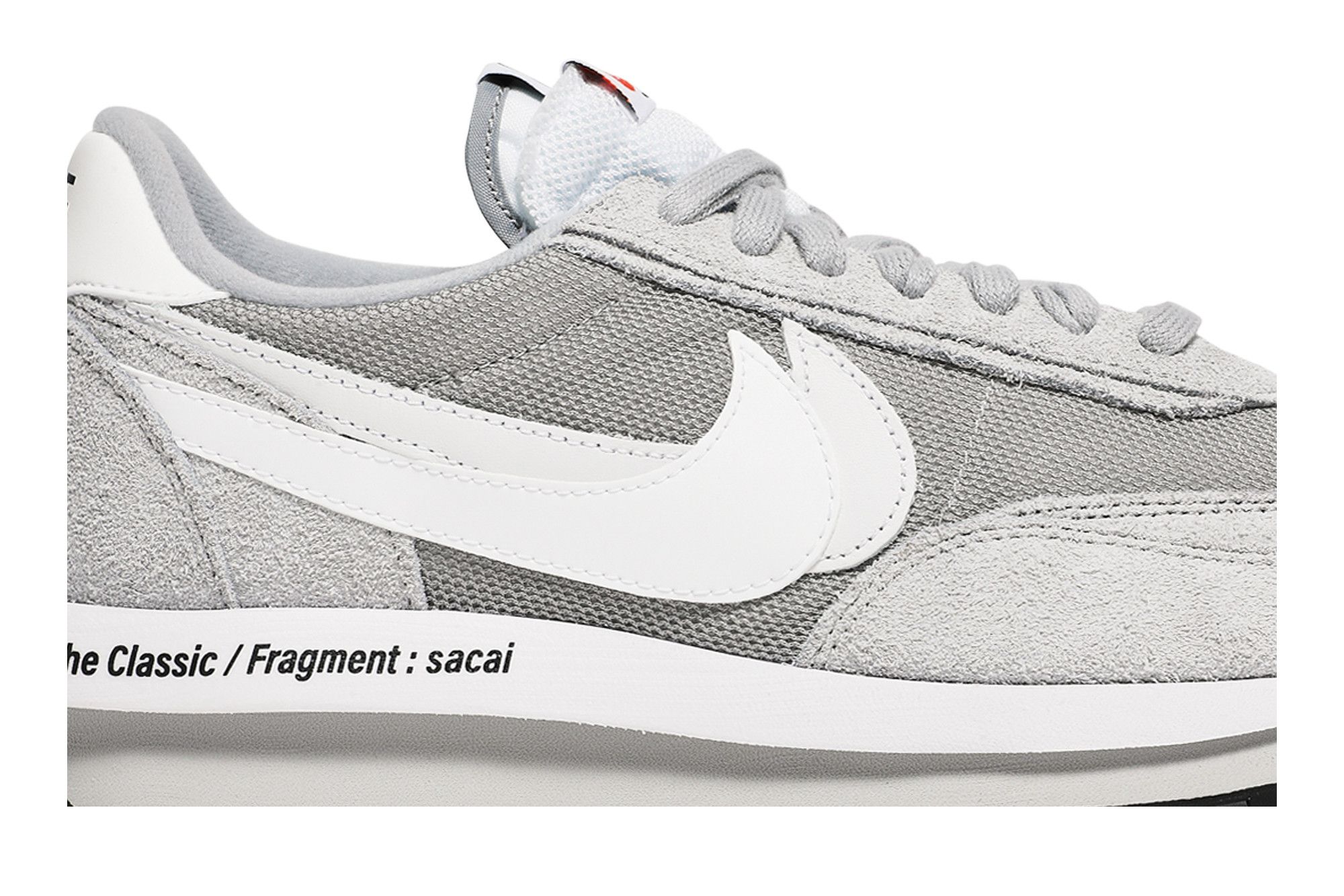 The Fragment Design x sacai x Nike LDV Waffle ‘Light Smoke Grey’ brings together Chitose Abe and Hiroshi Fujiwara on a three-way sneaker collaboration that borrows elements from the Nike LDV and Waffle Racer. In keeping with sacai’s signature aesthetic, the upper is crafted from grey mesh with double-stacked tonal suede overlays along the forefoot, heel and eyestay. The white leather Swoosh, laces and tongue are similarly doubled up, with the latter featuring Nike and Fragment woven tags. Additional branding includes printed text on the elongated foam midsole that reads ‘The Classic / Fragment: sacai.’ Underfoot, a waffle-traction rubber outsole delivers reliable grip.