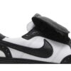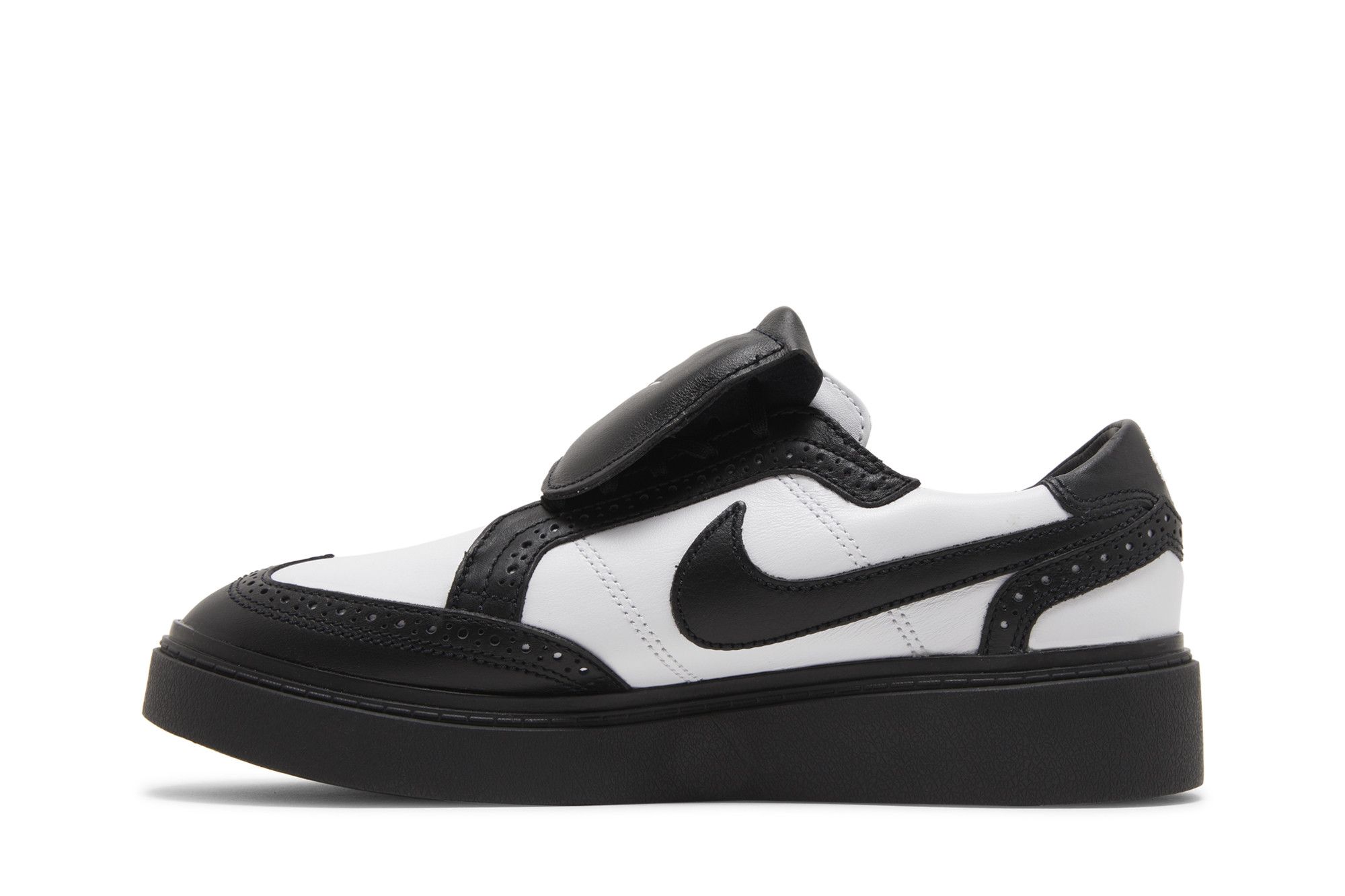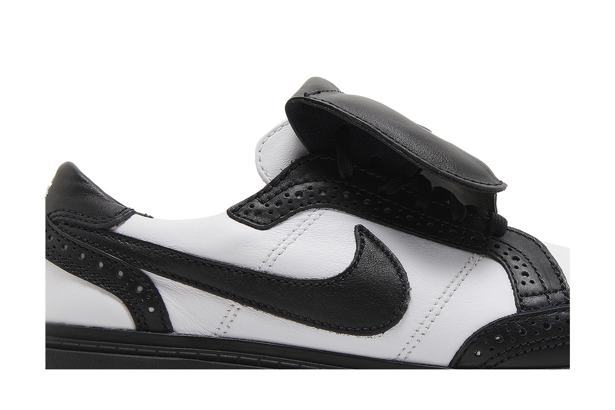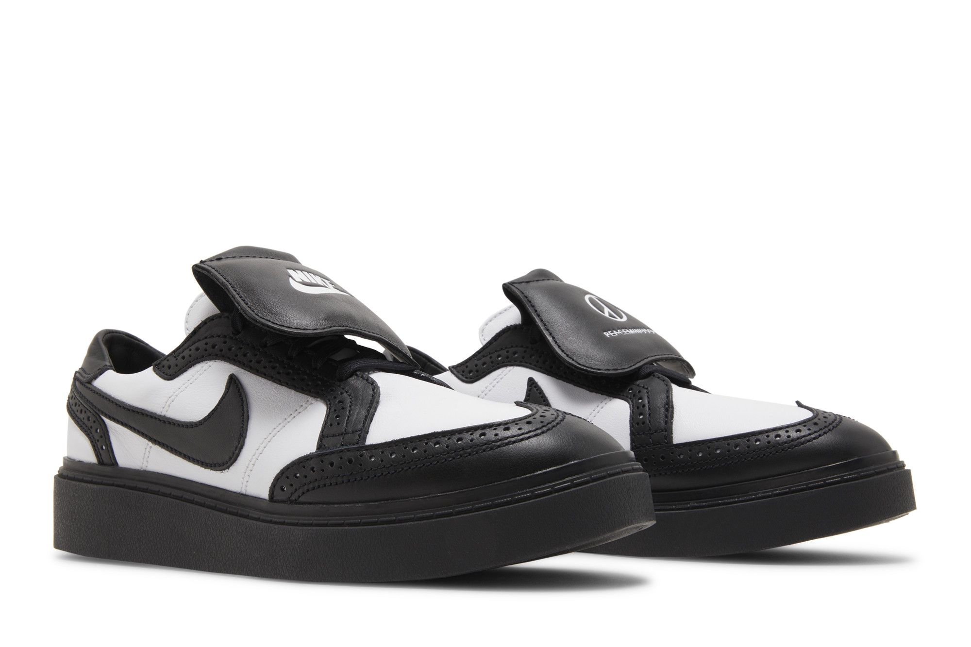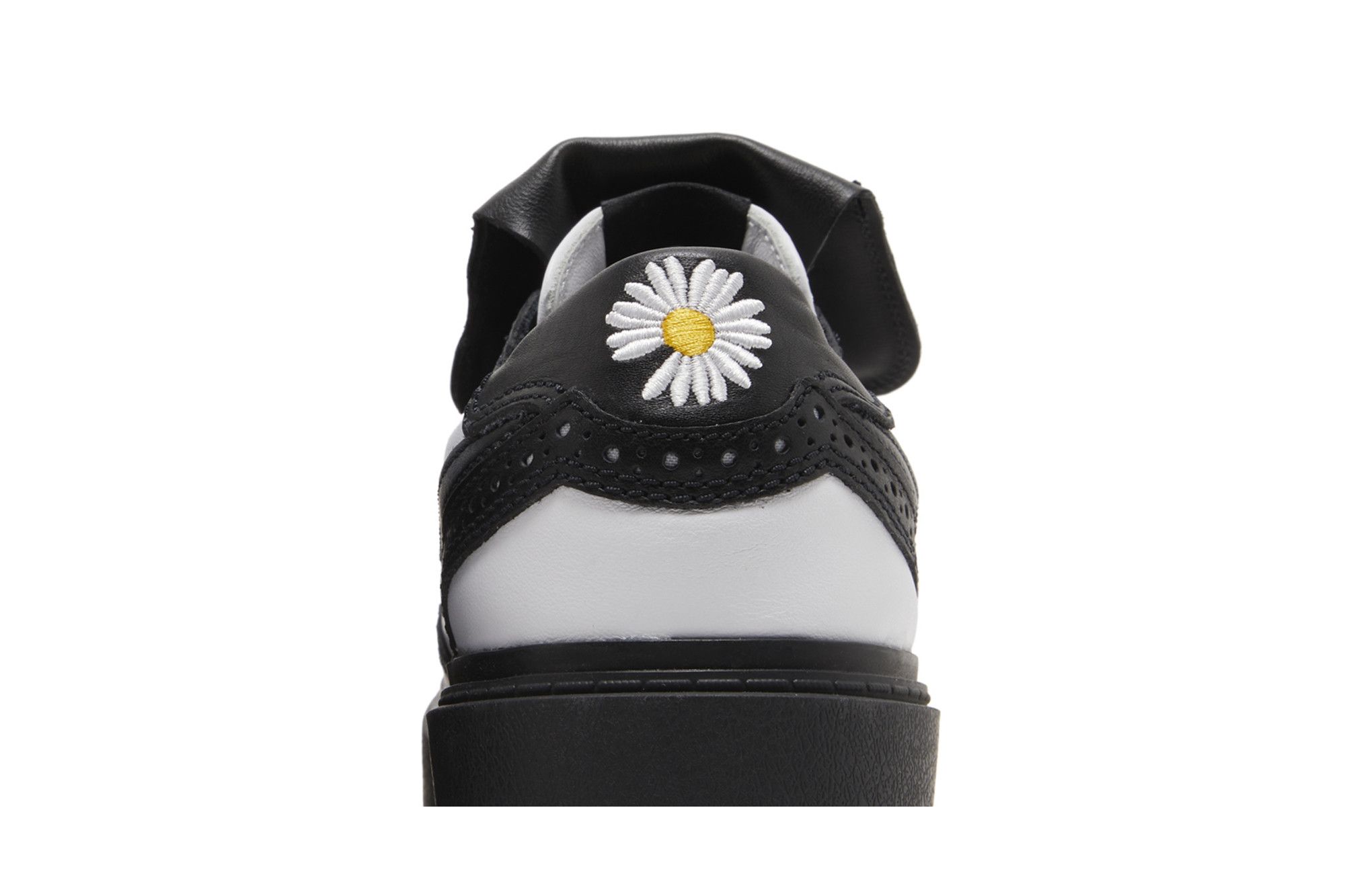 The G-Dragon x Nike Kwondo 1 ‘Yin-Yang’ reflects the K-pop artist’s personal style, blending street-ready sensibilities with a traditional dress shoe aesthetic. The black and white leather upper features a wingtip-inspired design, highlighted by brogue detailing on the forefoot and heel overlay. Removable lace shrouds display mismatched Nike and PEACEMINUSONE branding, while G-Dragon’s daisy graphic is embroidered on the heel tab. The two-tone design is finished with a rubber midsole in a solid black finish.