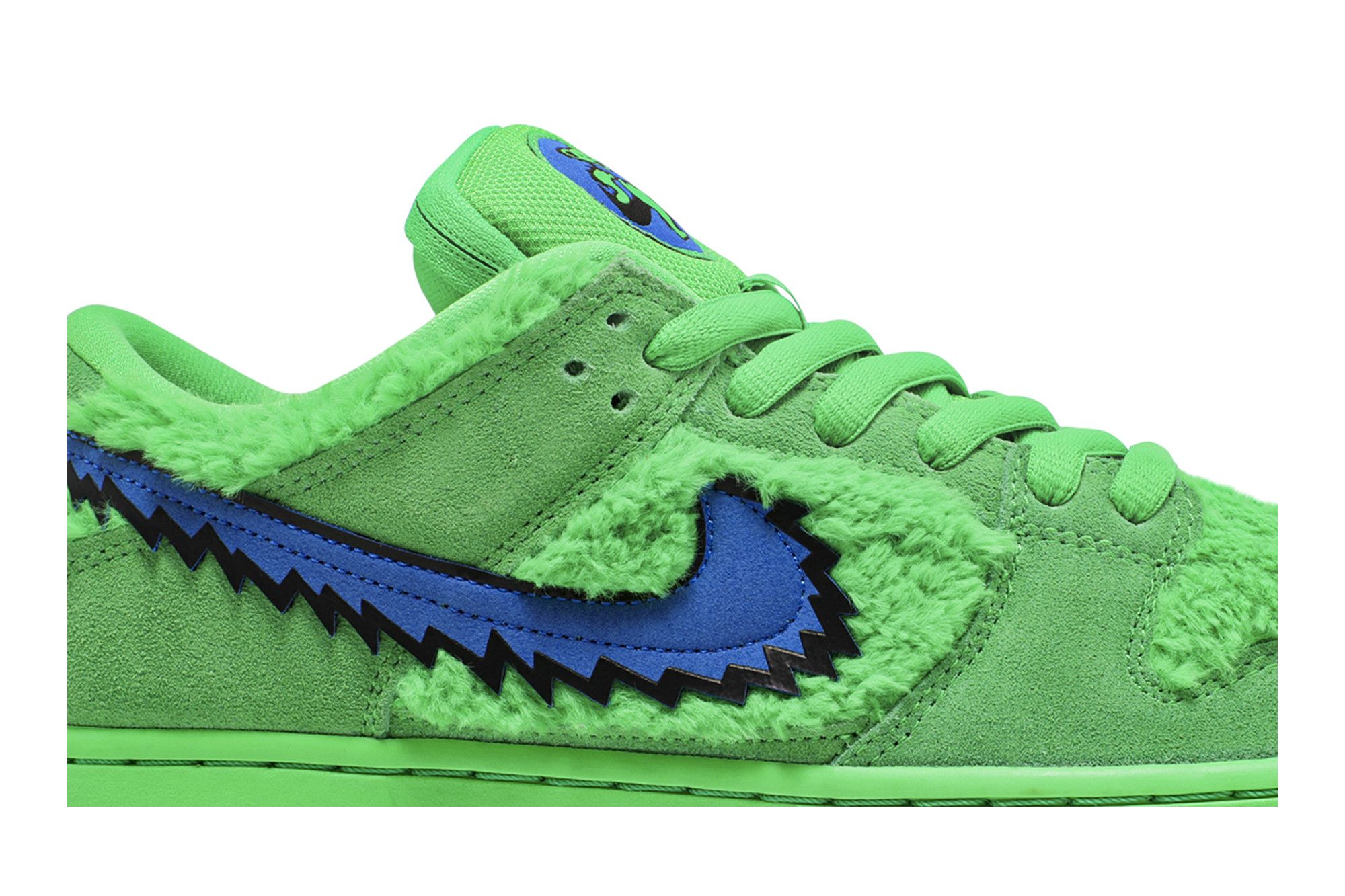 Made in collaboration with the legendary jam band, the Grateful Dead x Nike Dunk Low SB ‘Green Bear’ features a green furry upper that draws inspiration from the back cover of the 1973 live album, ‘History of the Grateful Dead, Vol. One (Bear’s Choice).’ Contrasting pops of royal blue make their way to the jagged Swoosh, rubber outsole and the sneaker’s branding hits, including an ursine graphic on the tongue. The latter is equipped with a zippered stash pocket.