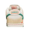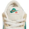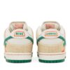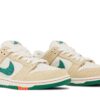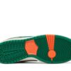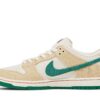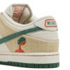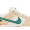 The Jarritos x Nike Dunk Low SB showcases a collaborative design inspired by the popular Mexican soda brand. The upper combines a Phantom white leather base with hemp canvas overlays and a Malachite green textile Swoosh. The Jarritos logo is embroidered in green and orange on the lateral heel, while dual branding embellishes the woven tongue tag. Mismatched heel tabs are emblazoned with ‘Nike’ and ‘Jarritos’ across the left and right shoe. Anchoring the sneaker is a durable rubber cupsole that pairs white sidewalls with a two-tone green and orange outsole.