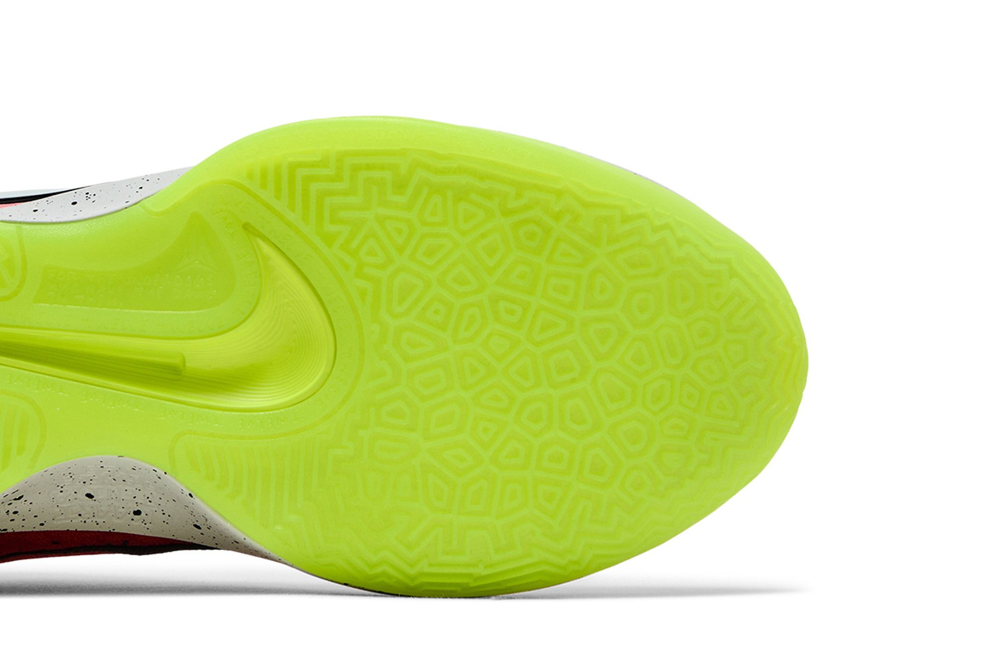 The Kool-Aid x Nike Ja 2 ‘Mixed Berry’ showcases mismatched color blocking, with a blue-to-black gradient design on the left shoe that nods to Blue Raspberry Kool-Aid. The right shoe channels the Cherry Red flavor with an upper that transitions from crimson to orange. A graphic atop the tongue depicts the Kool-Aid man crashing through a wall, while the character’s ‘Ohhh Yeah!’ tagline is embroidered on the interior side. Heel tabs display Ja’s ’12:AM’ branding in the classic Kool-Aid font. Black speckles coat the white Phylon midsole, supported underfoot by a glow-in-the-dark rubber outsole.