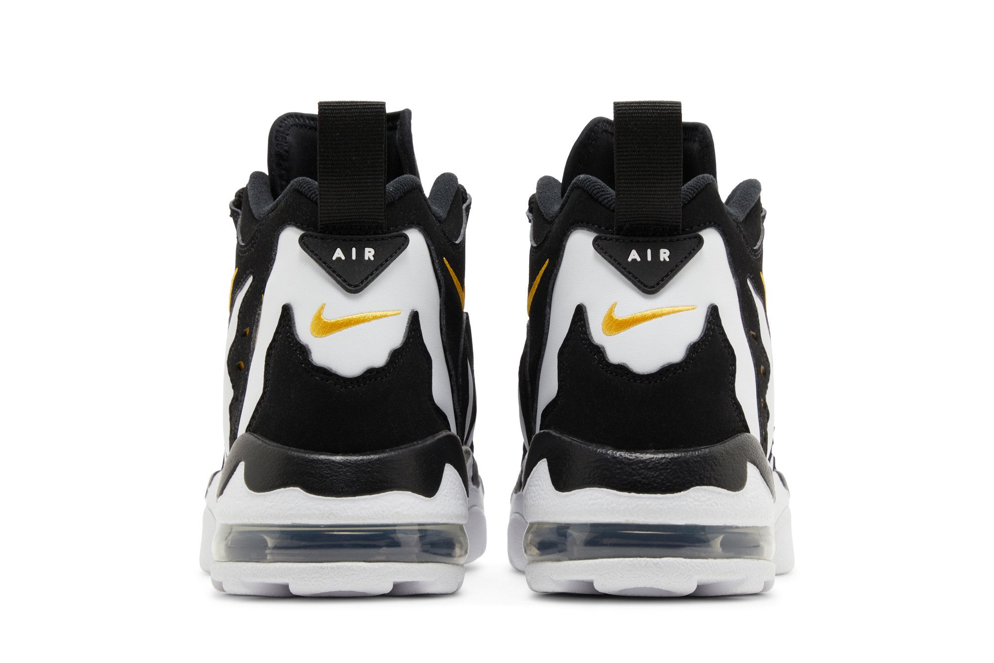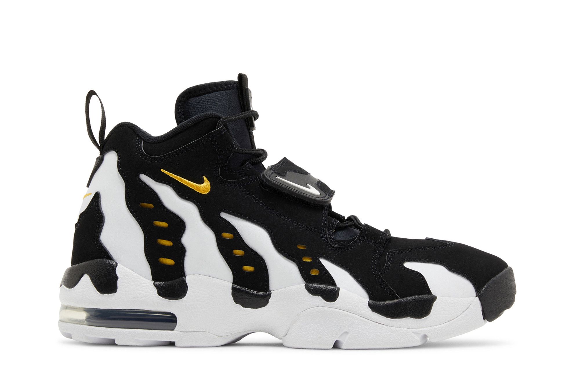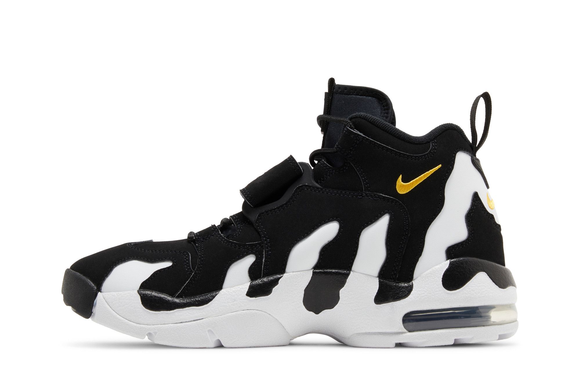 The 2024 edition of the Nike Air Diamond Turf Max ’96 ‘Black Varsity Maize’ brings back an original colorway of the mid-top training shoe made famous by Deion Sanders. Secured with an adjustable midfoot strap, the upper blends a white leather base with black nubuck overlays. Gold embroidered Swooshes adorn the collar, while webbing pull tabs appear on the back heel. Lightweight cushioning comes courtesy of a full-length foam midsole with a visible Max Air unit in the heel.