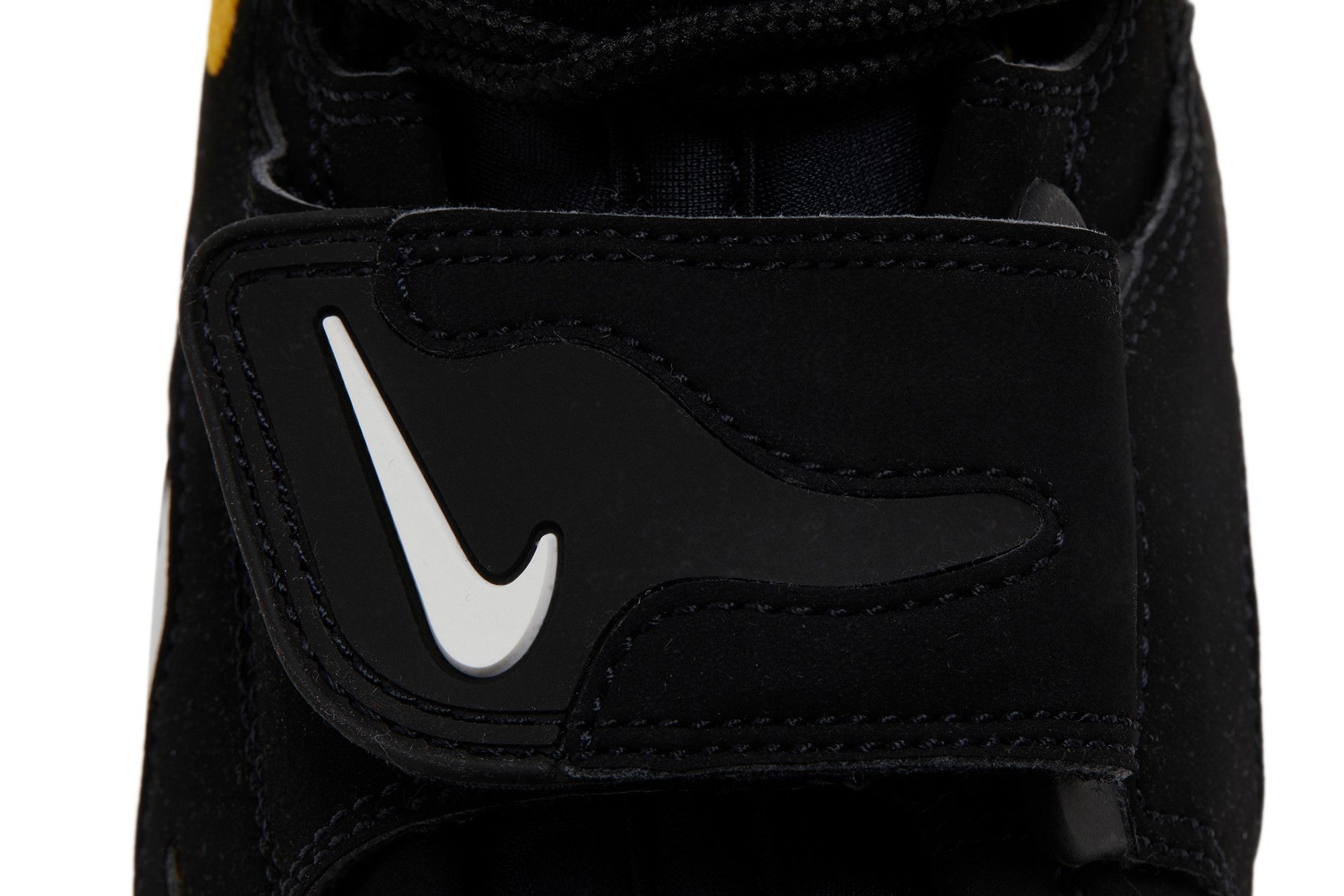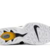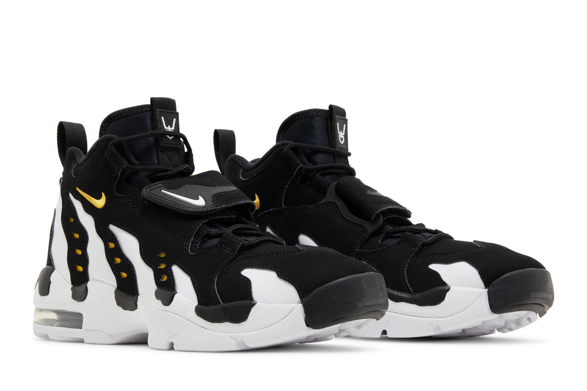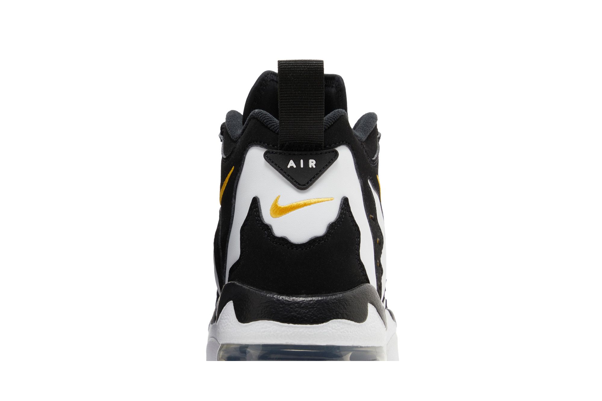 The 2024 edition of the Nike Air Diamond Turf Max ’96 ‘Black Varsity Maize’ brings back an original colorway of the mid-top training shoe made famous by Deion Sanders. Secured with an adjustable midfoot strap, the upper blends a white leather base with black nubuck overlays. Gold embroidered Swooshes adorn the collar, while webbing pull tabs appear on the back heel. Lightweight cushioning comes courtesy of a full-length foam midsole with a visible Max Air unit in the heel.