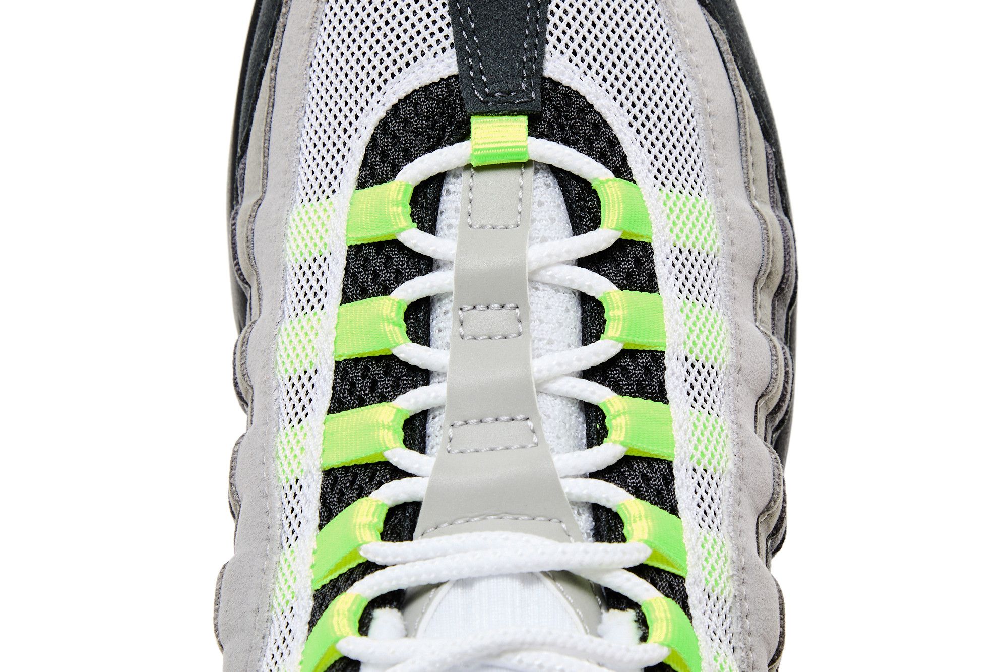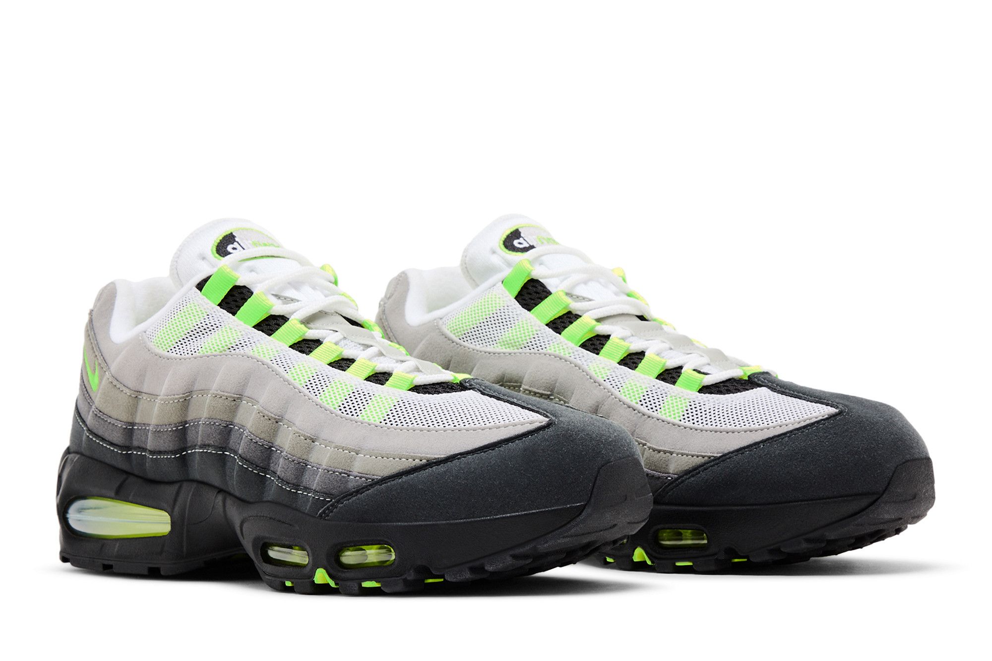 The 2025 edition of the Nike Air Max 95 OG ‘Neon’ revives the sneaker icon in its legendary launch colorway. Designed by Sergio Lozano, who took inspiration from the human anatomy, the lifestyle runner features wavy suede overlays in a gradient grey color scheme. Neon yellow accents stand out on the webbing eyelets, embroidered mini-Swoosh, and Air Max tongue tag. Reflective detailing on the molded heel panel and tongue provides enhanced visibility in low-light conditions. Lightweight cushioning arrives via a black polyurethane midsole with Max Air units in the forefoot and heel.