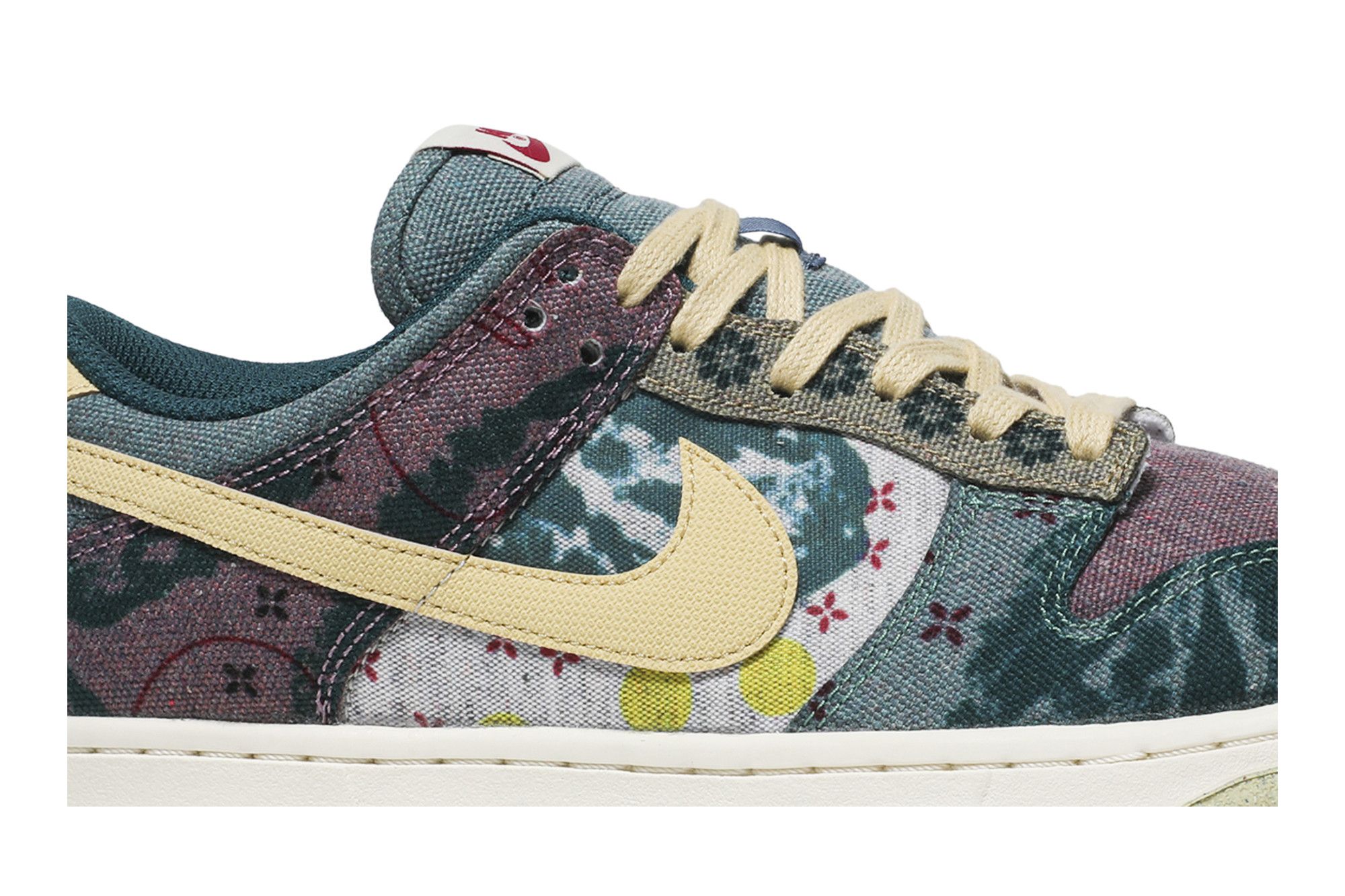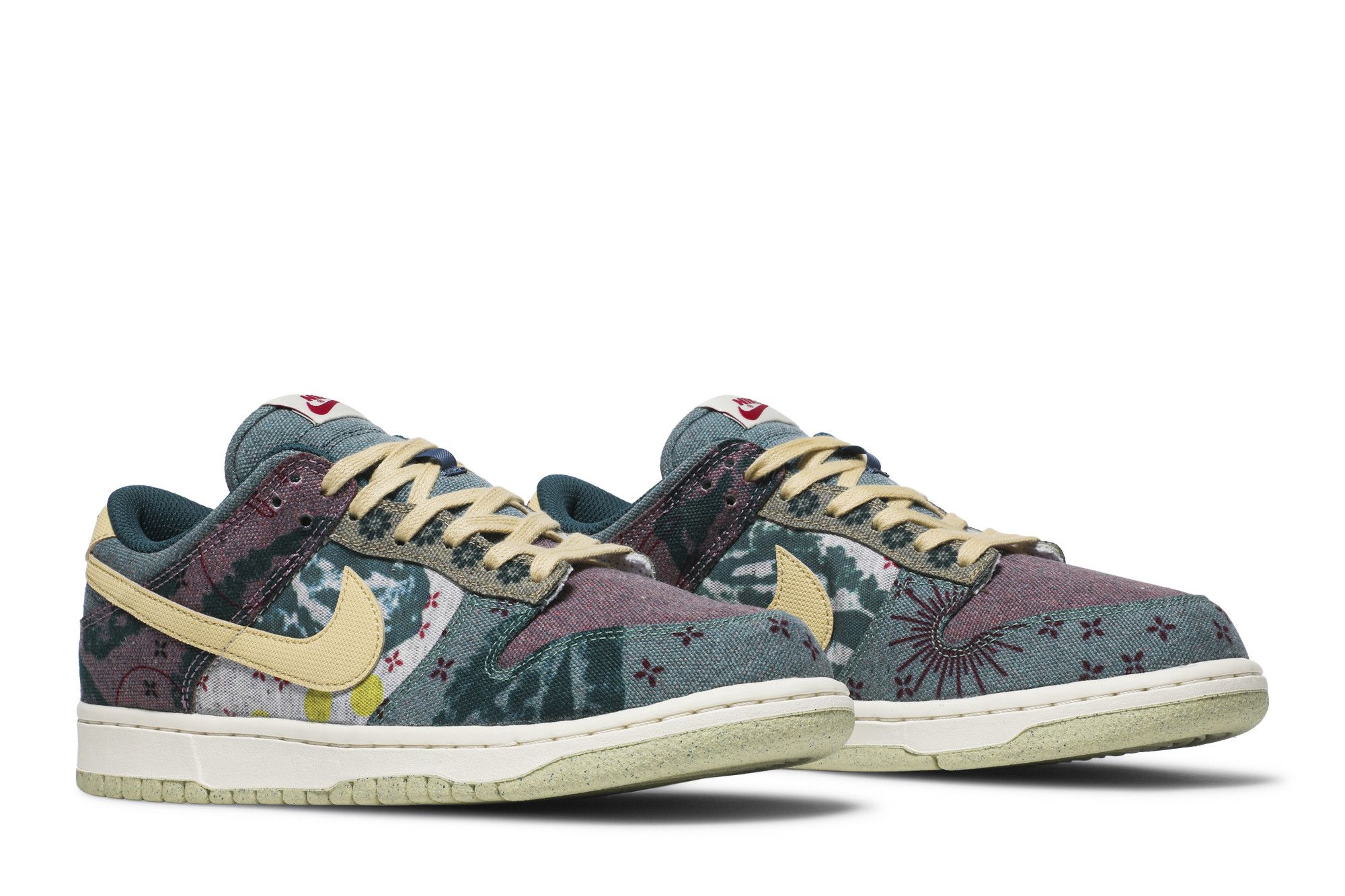 The Nike Dunk Low ‘Community Garden’ combines a patchwork design with a sustainable build. Rendered in assorted earth tones, flora-inspired graphics appear throughout the recycled canvas upper in a collage-style composition. Leather accents in Lemon Wash stand out on the signature Swoosh and back tab, featuring a Nike wordmark in dark magenta embroidery. A vintage off-white finish is applied to the midsole, supported underfoot by a pale yellow rubber outsole.
