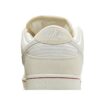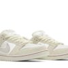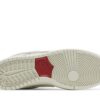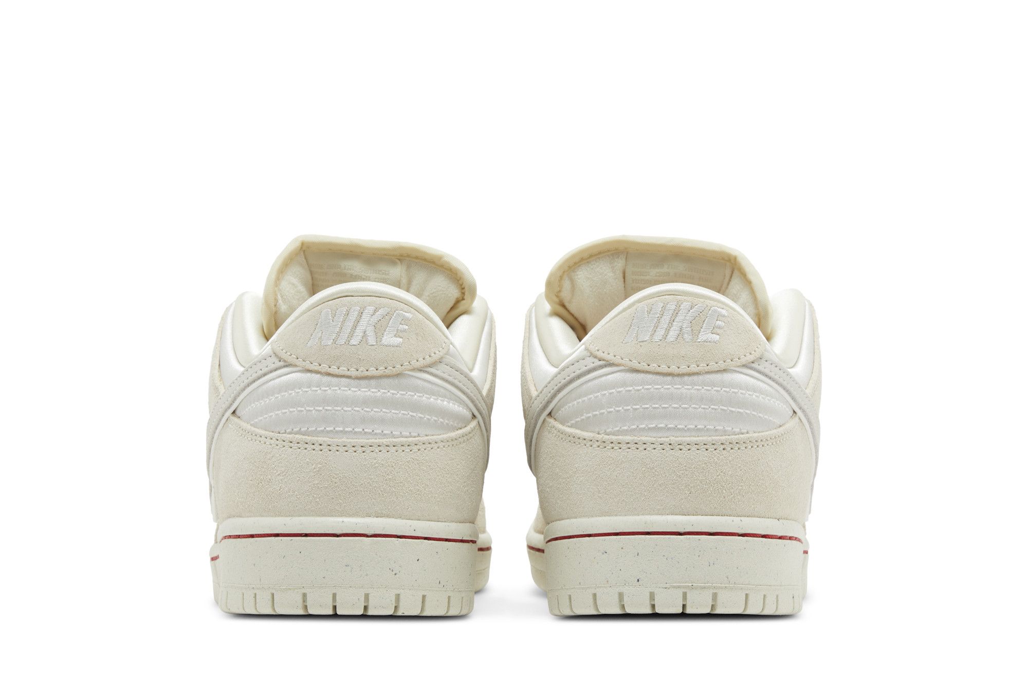 Representing one-half of the ‘City of Love Collection,’ the Nike Dunk Low Premium SB ‘Light Bone’ blends luxe materials with a tonal design. The upper features a white satin base with ivory suede overlays at the forefoot and heel. A tumbled leather Swoosh maintains the monochrome color palette. In a nod to the mythic red thread of fate, graphic insoles display two hands linked by red string tied around the pinky finger. The theme is repeated with red stitching encircling the off-white rubber midsole.
