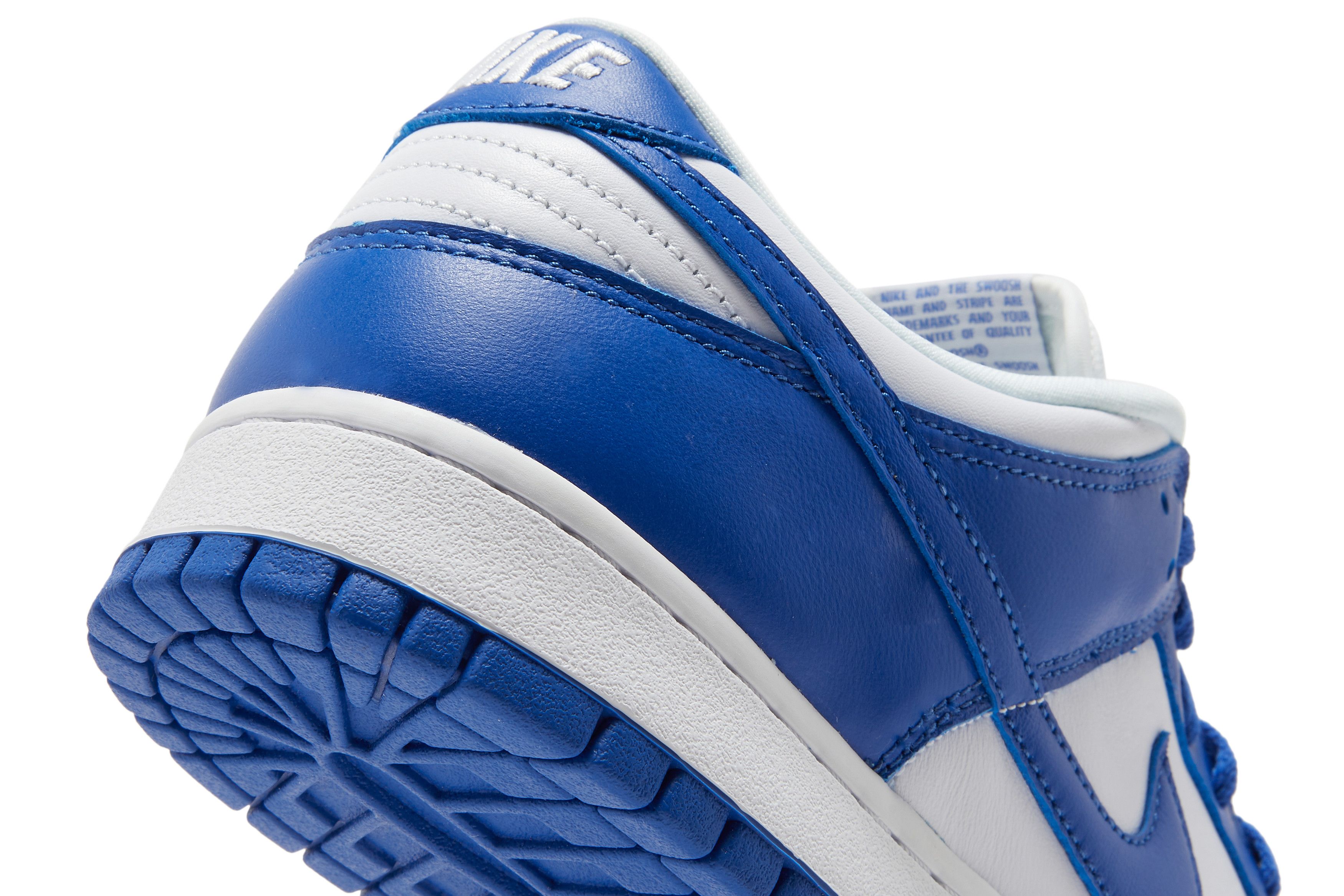 Celebrating the silhouette’s 35th anniversary, the Dunk Low Retro SP ‘Kentucky’ borrows a familiar color scheme from Nike’s legendary ‘Be True to Your School’ series from 1985. The high-top basketball shoe originally made for the University of Kentucky is updated as a versatile low-top, featuring a white leather upper with royal blue overlays. A breathable mesh tongue is topped with a woven Nike tag, complementing a second Nike logo hit on the heel tab.