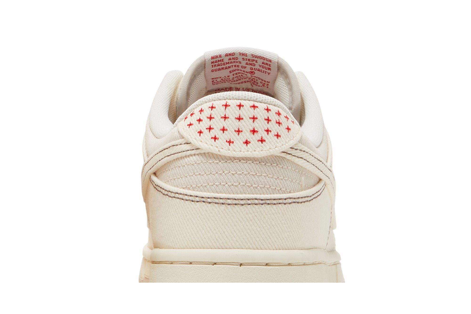 The Nike Dunk Low SE ‘Sashiko Light Orewood Brown’ gives the heritage hoops shoe an artisanal makeover. The upper replaces traditional leather construction with textile twill in a subtle off-white finish with contrast brown stitching throughout. A crimson Nike tag adorns the tongue, matching the embroidered eyelets and Sashiko-style stitching on the toe box and heel tab. A color-matched rubber midsole anchors the low-profile silhouette.