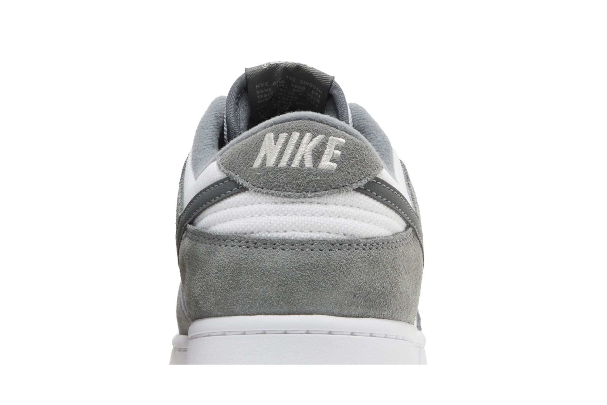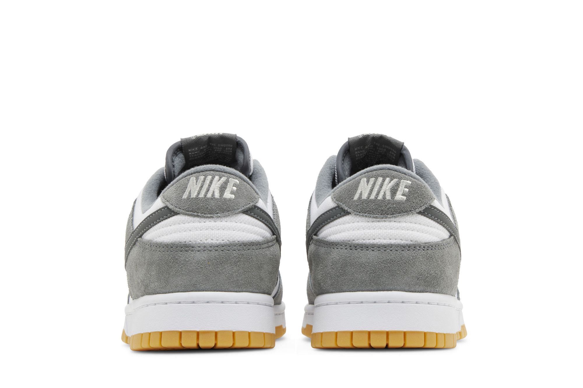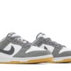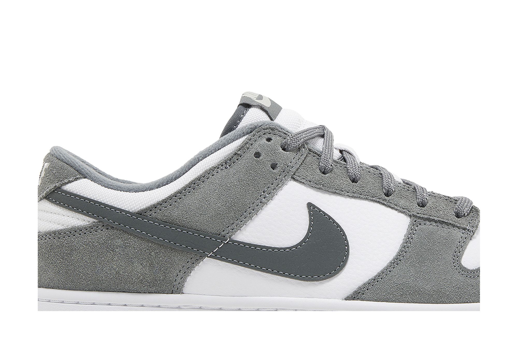 The Nike Dunk Low ‘Smoke Grey Gum’ features reflective threads woven into the laces, which secure a white leather upper with grey suede overlays at the forefoot and heel. A reflective grey leather Swoosh sweeps across the side panel. Additional branding elements include a woven Nike tongue tag and an embroidered Nike wordmark on the back tab. The sneaker rests on a crisp white midsole, supported underfoot by a grippy gum rubber outsole.