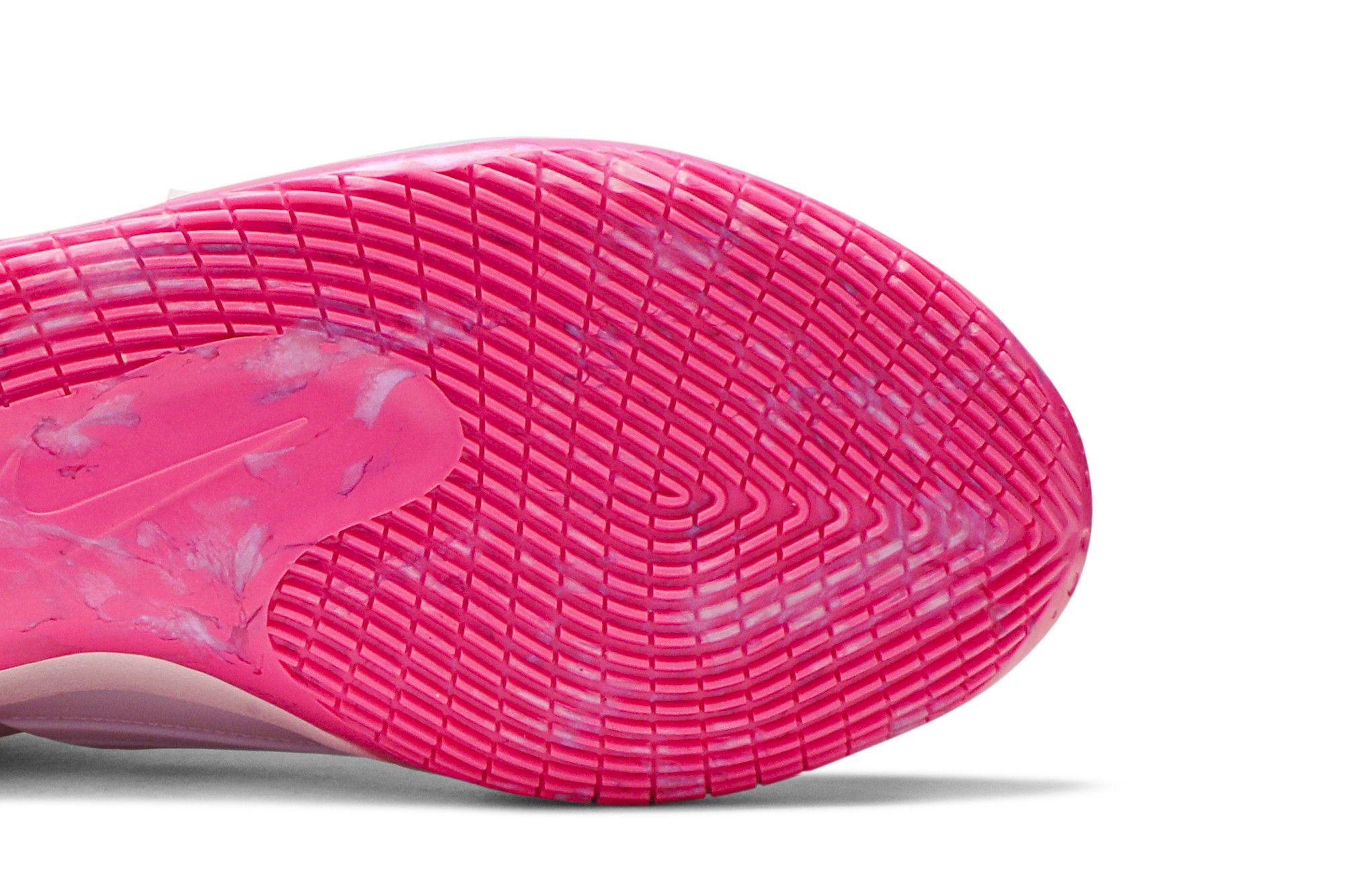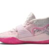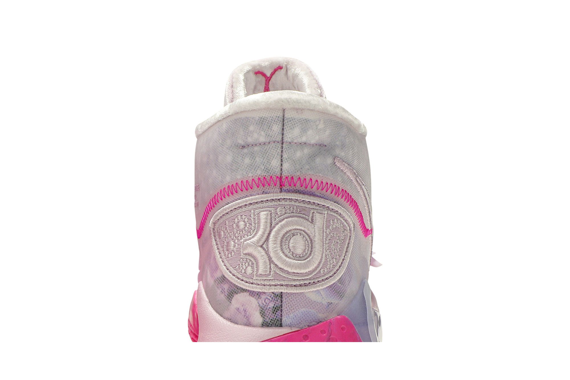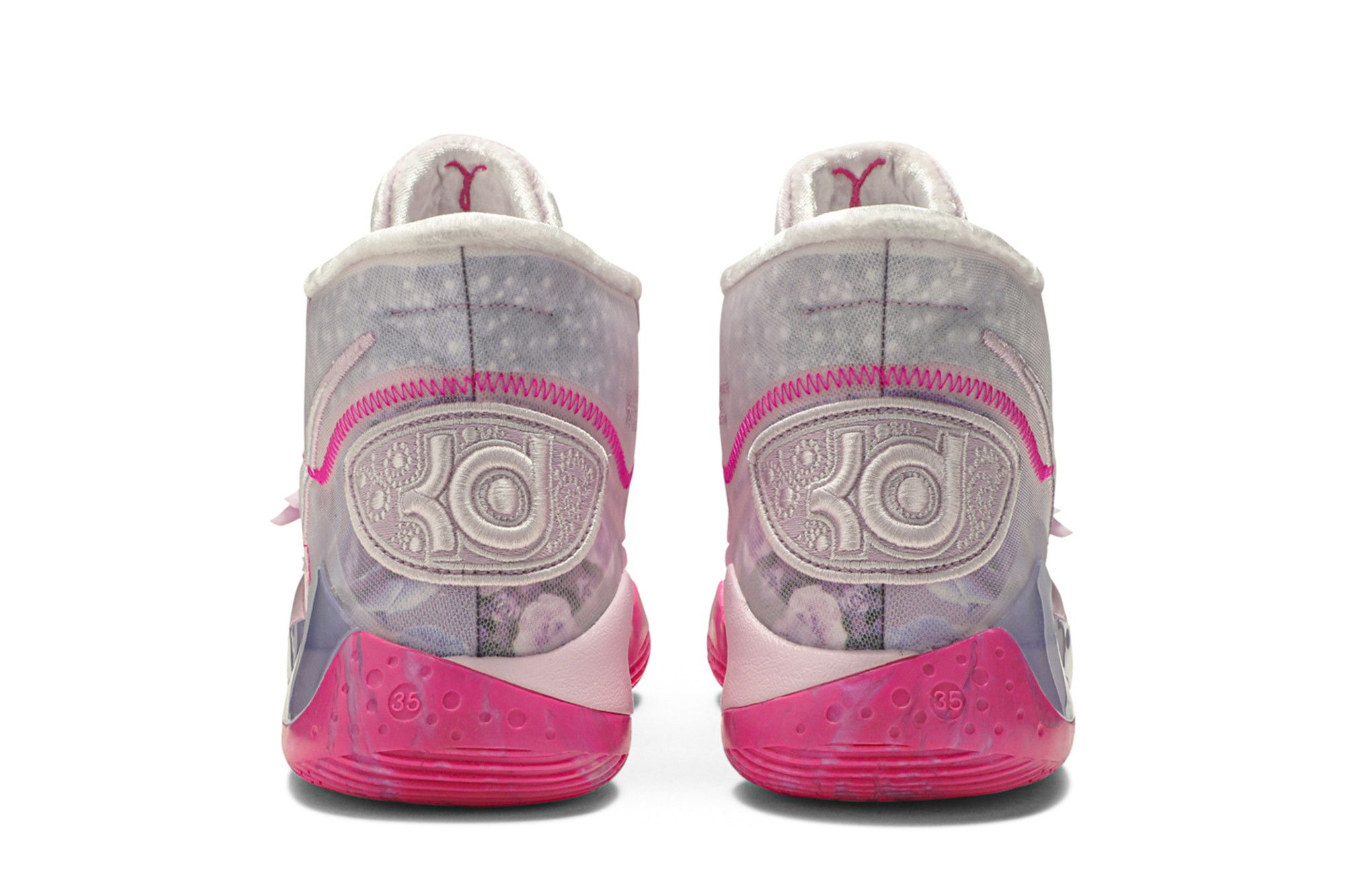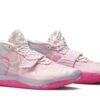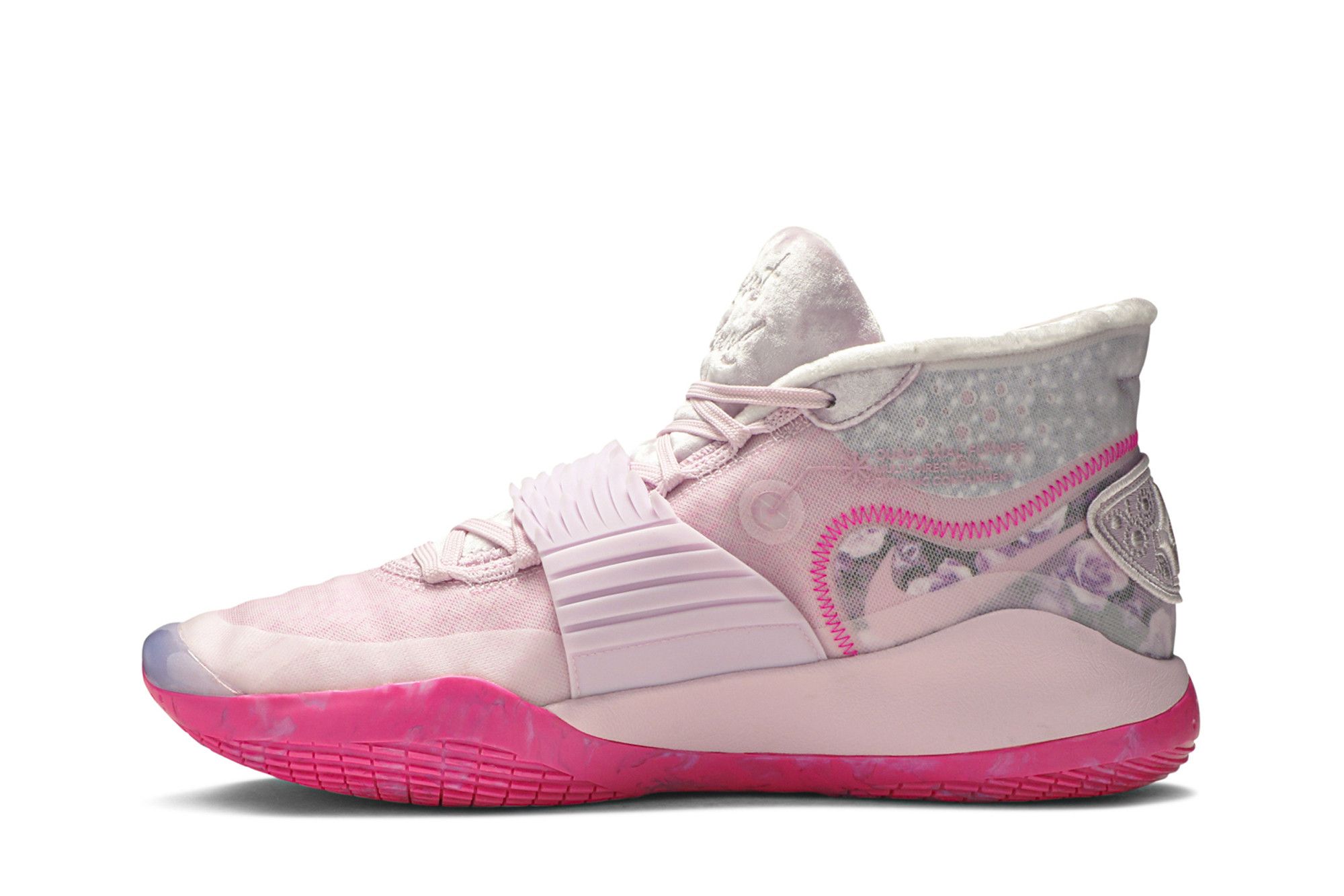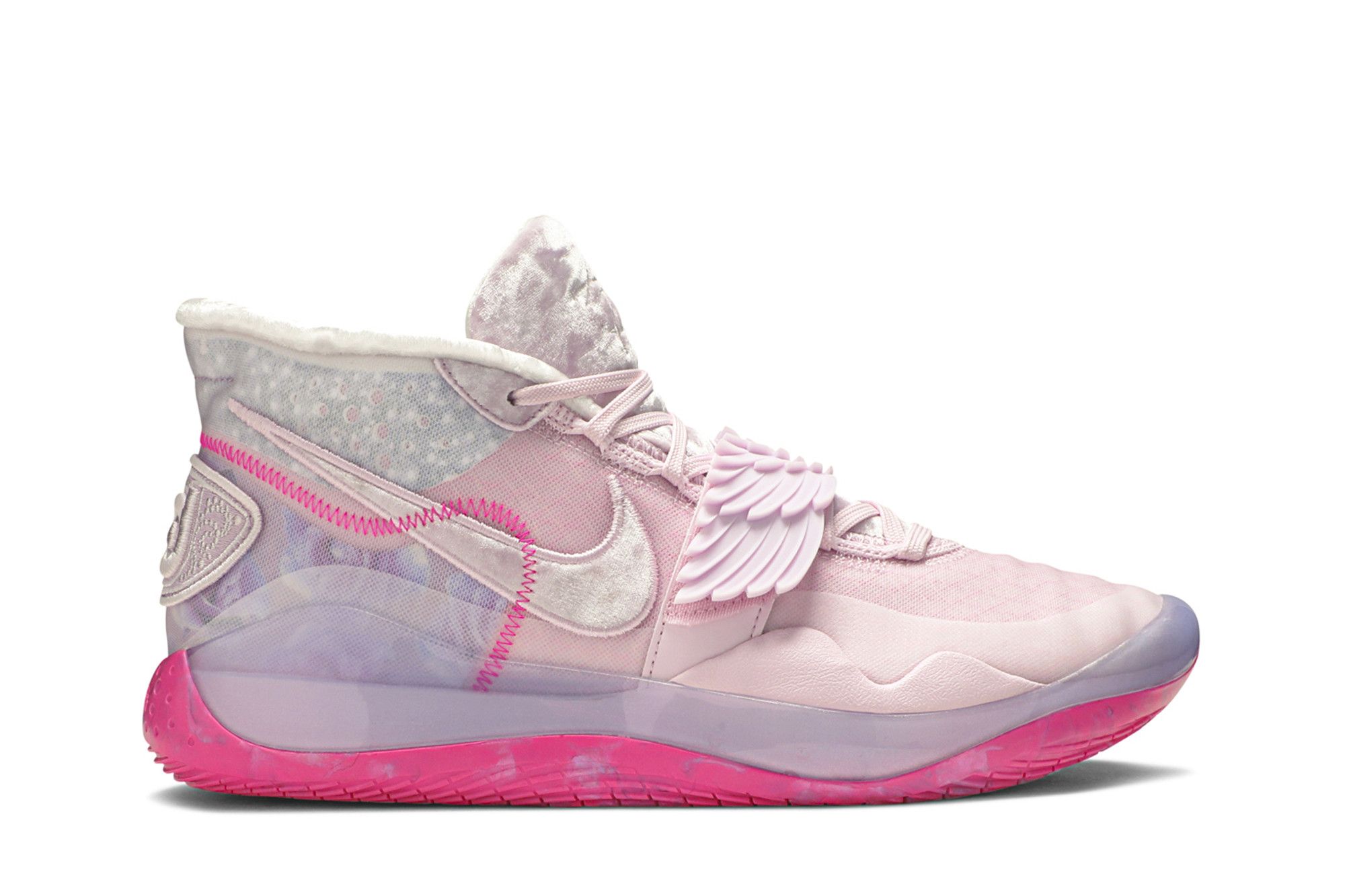 Continuing a tradition begun with the KD 4 in 2012, the Nike KD 12 ‘Aunt Pearl’ celebrates the memory of Kevin Durant’s beloved aunt. The sneaker, dressed in monochromatic pink as a nod to the Kay Yow Cancer Fund, borrows multiple design details from previous ‘Aunt Pearl’ colorways. They include plush velvet fabrication from the KD 10, a winged midfoot strap from the KD 7, and a marbled outsole from the KD 11.