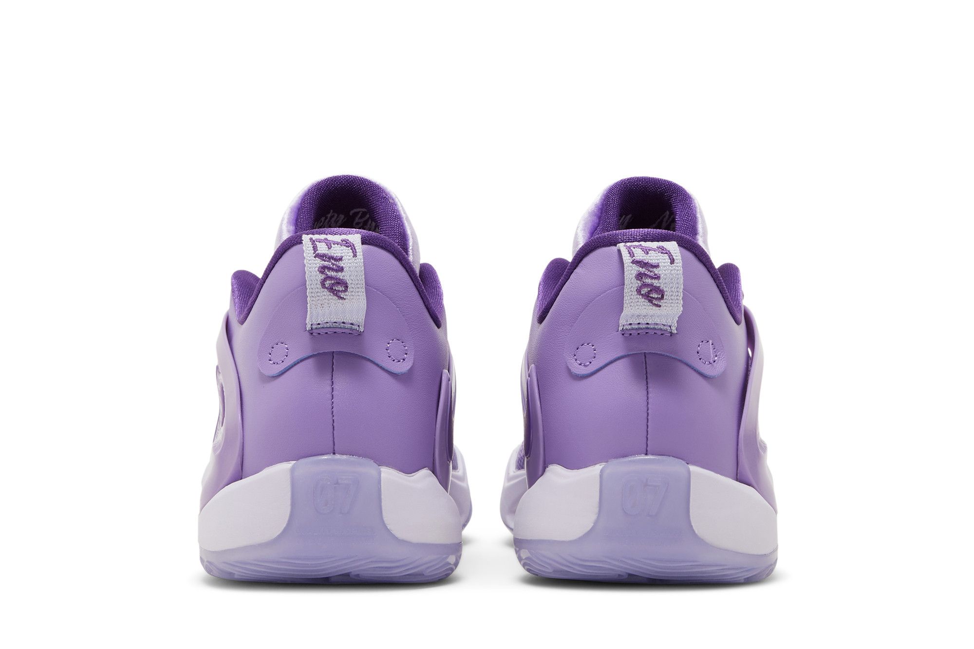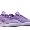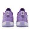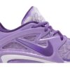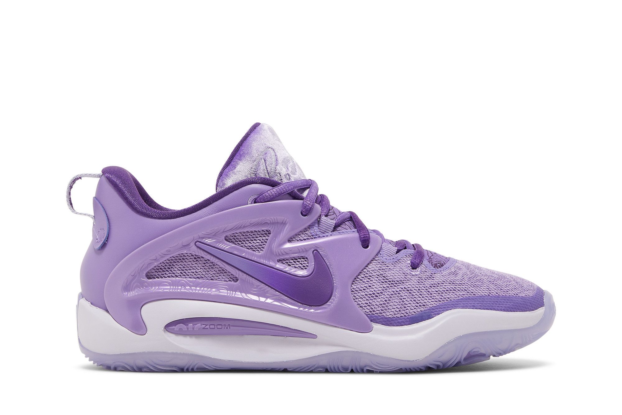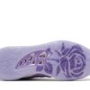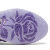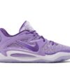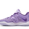 The Nike KD 15 ‘B.A.D.’ features a striking purple-themed design with a mesh upper in Space Purple, Oxygen Purple, and Purple Cosmos hues. It has plastic lace cage detailing, a dark purple Nike Swoosh, and tonal lacing accents complemented by rose-embroidered velvet tongues. The midsole is white, paired with an icy purple outsole. Inside, the insoles include special branding with a group of names, and the shoes come in unique packaging. This model balances lightweight textile materials for comfort with a robust full-length Zoom Strobel and Cushlon foam cushioning for excellent court performance. The design pays homage to Kevin Durant’s inner circle.