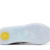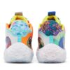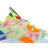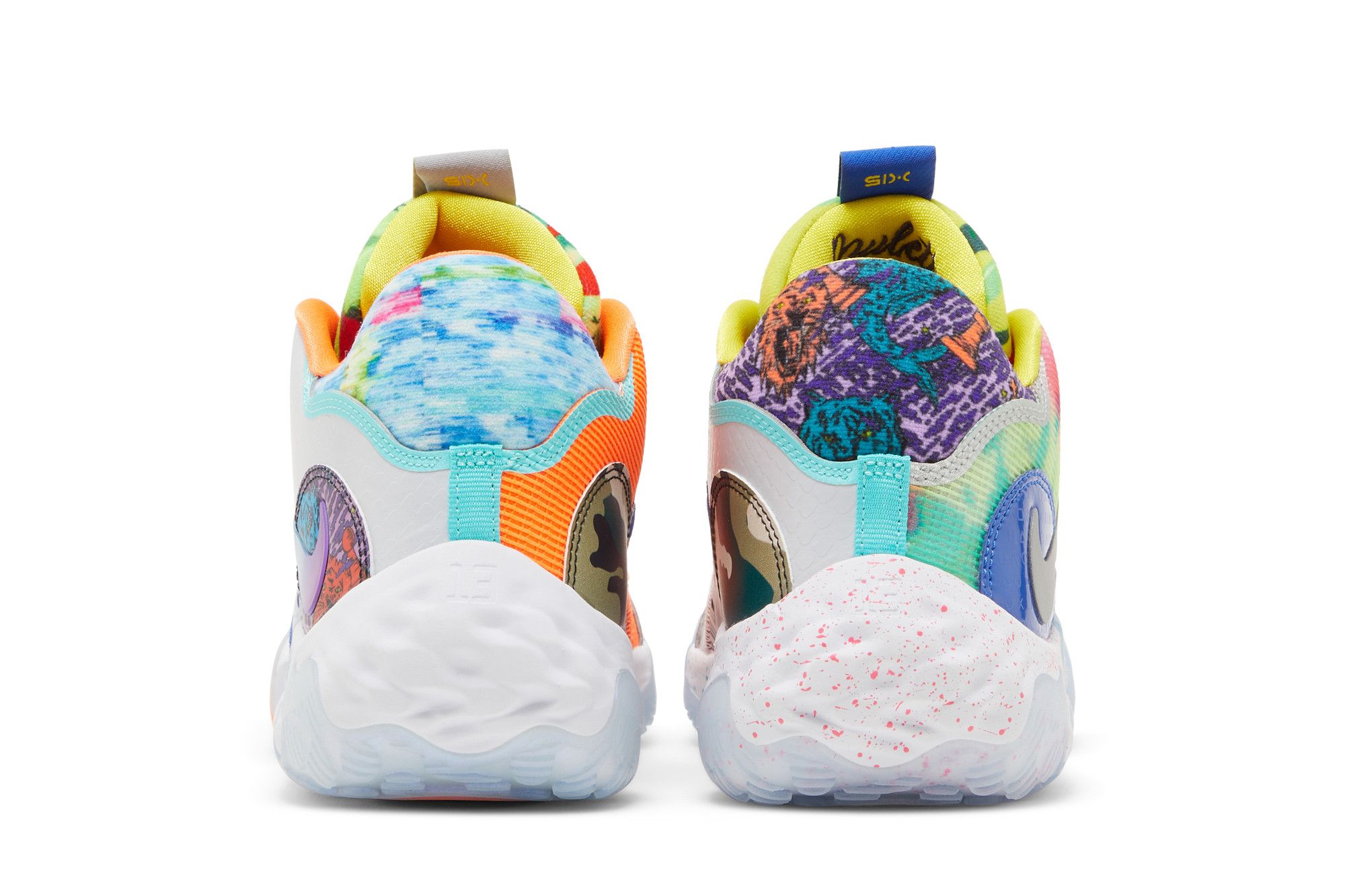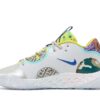 The Nike PG 6 ‘What The’ features a bold and eye-catching design combining Opti Yellow, Metallic Silver, and Total Orange hues. Each shoe has a unique base with Metallic Silver and White, overlaid by a mix of colors, patterns, and prints for a dynamic look. It incorporates Nike’s React foam midsole for responsive cushioning and an icy outsole for reliable traction, delivering both style and performance optimized for multi-directional movement on the court.