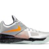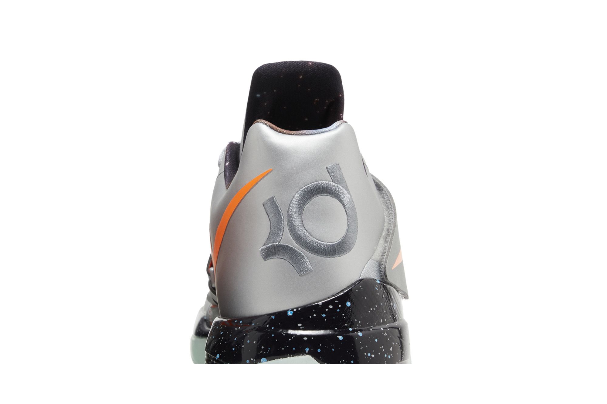 The 2024 edition of the Nike Zoom KD 4 ‘Galaxy’ reintroduces one of the key releases from Nike’s 2012 NBA All-Star Collection. Adorned with a large orange Swoosh, an Adaptive Fit Strap secures the silver mesh upper, fortified with fused synthetic overlays in a matching metallic silver finish. Reflecting the shoe’s cosmic theme, a starry graphic animates the black Phylon midsole, featuring springy Zoom Air cushioning in the forefoot. The low-top is built atop a glow-in-the-dark rubber outsole.