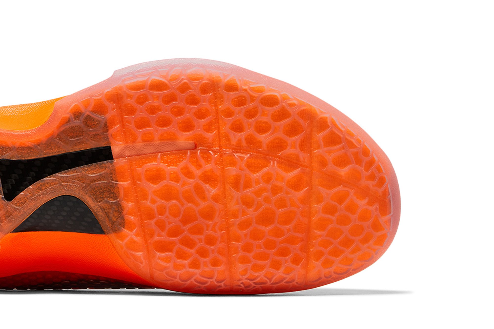The Nike Zoom Kobe 6 Protro ‘Total Orange’ features a fiery orange hue throughout the micromesh upper, covered in a unique snakeskin texture composed of raised polyurethane ‘islands.’ The monochrome design is disrupted by a metallic silver Swoosh. Kobe Bryant’s shield logo graces the tongue, while his signature is inscribed on the molded heel counter. Performance benefits include a full-length Cushlon midsole with a Zoom Turbo unit in the forefoot.