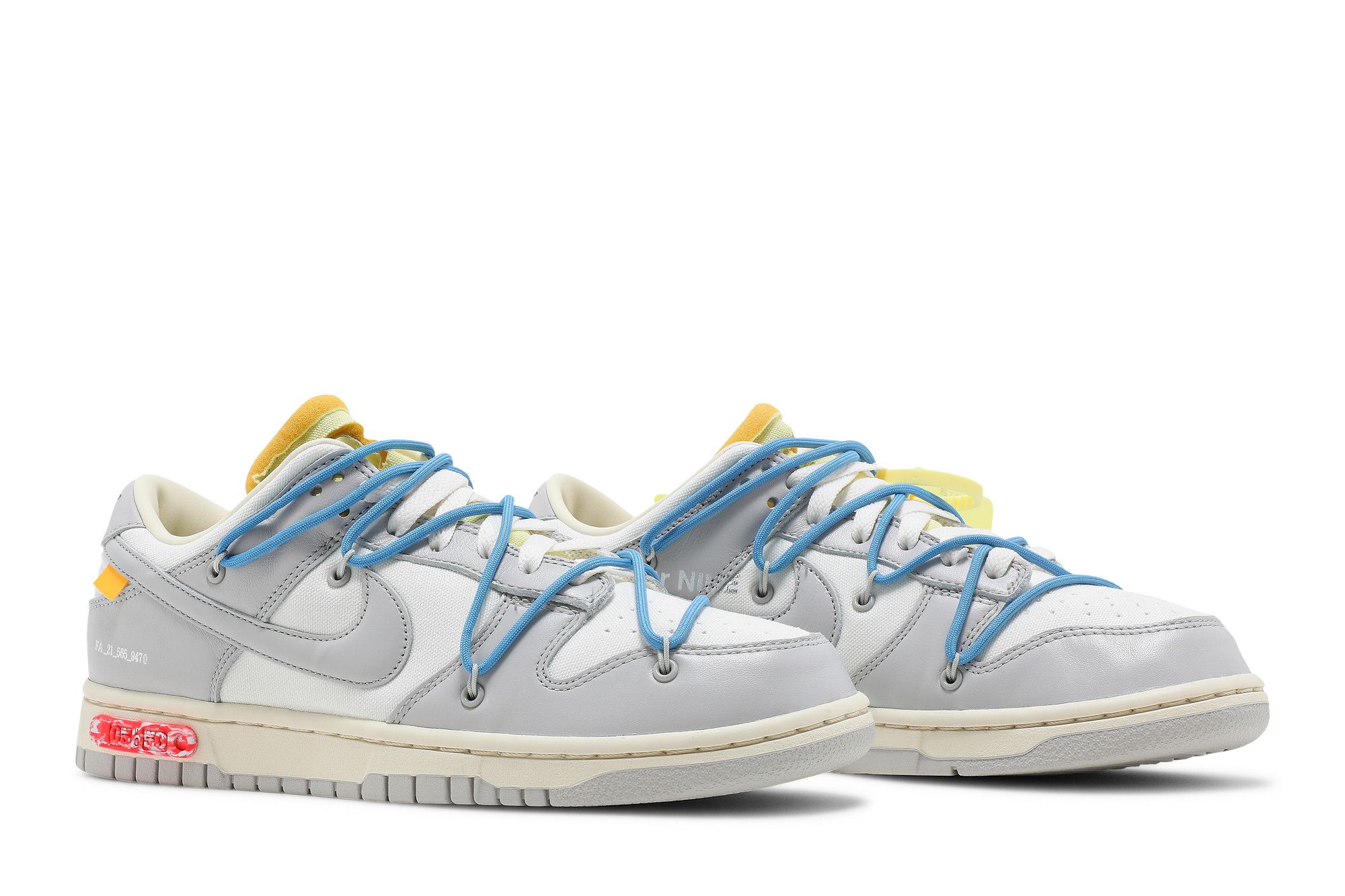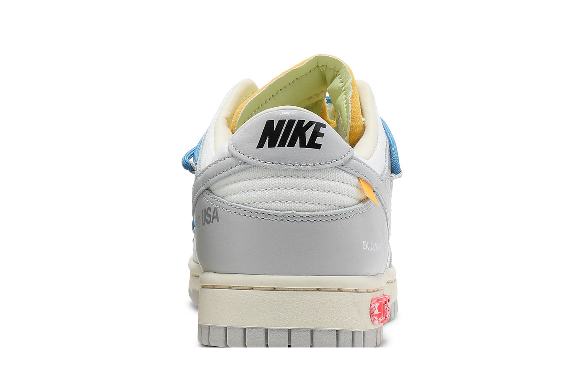 This Off-White x Nike Dunk Low is taken from the ‘Dear Summer’ collection, a sprawling follow-up to Virgil Abloh’s first Nike Dunk collaboration from 2019. The low-top makes use of a white leather upper with soft grey canvas overlays, along with Virgil Abloh’s calling-card flourishes, which include a plastic zip tie and printed Helvetica text. Contrasting pops of color arrive via the sneaker’s secondary lacing system, zip-tie, an exposed-foam tongue and a rectangular tab affixed to the Swoosh. Limited to fifty pairs, a ’5 of 50’ badge is affixed on the lateral midsole.