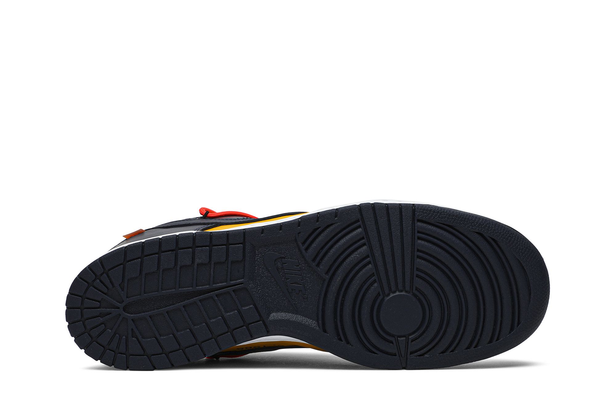 Arrived in December 2019, Off-White and Nike continue their creative partnership by revisiting the Dunk Low for a three-piece capsule. This edition in University Gold and navy leather sports a signature orange flag label on the lateral Swoosh. Virgil Abloh’s deconstructed style is exhibited in the form of secondary Flywire lacing, exposed tongue foam and enlarged branding on the medial. The sneaker’s split-colored rubber cupsole remains.