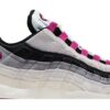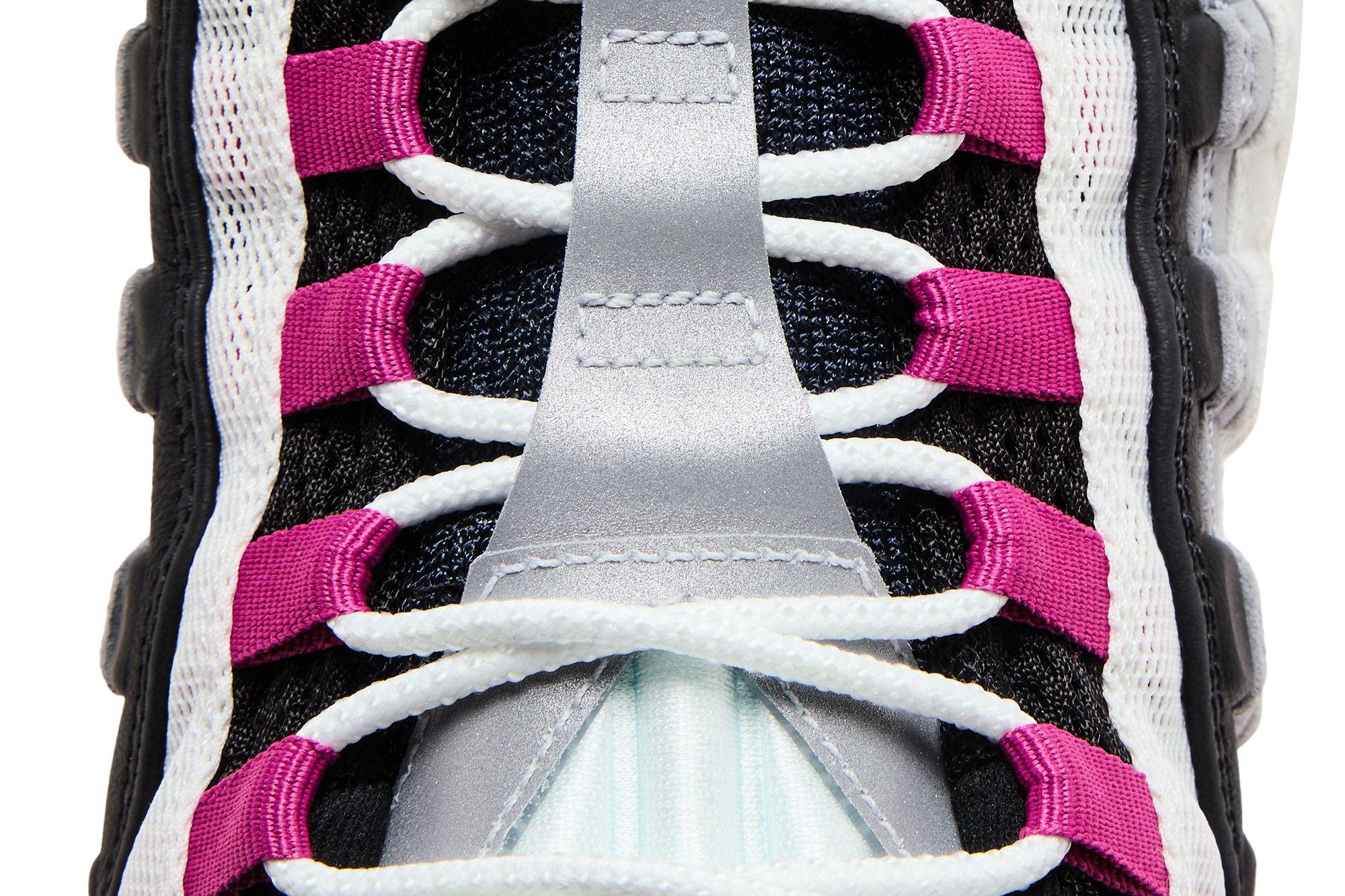 The Nike SB x Nike Air Max 95 ‘Cactus Flower’ reworks the retro runner as a modern skateboarding shoe that maintains the design DNA of the original. Wavy suede side panels feature a gradient design in which the black top layer transitions to lighter shades of grey. Fuchsia accents make their way to the webbing eyelets, embroidered mini-Swoosh, and the embossed Nike SB logo that appears on the reflective silver heel panel. A white polyurethane midsole is fitted with hot pink Air-sole units and supported by a modified gum rubber outsole.