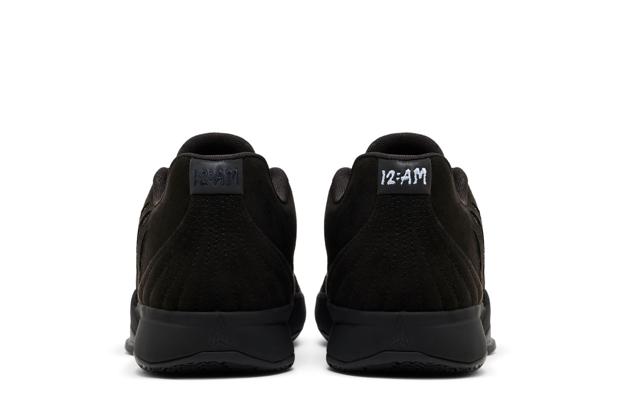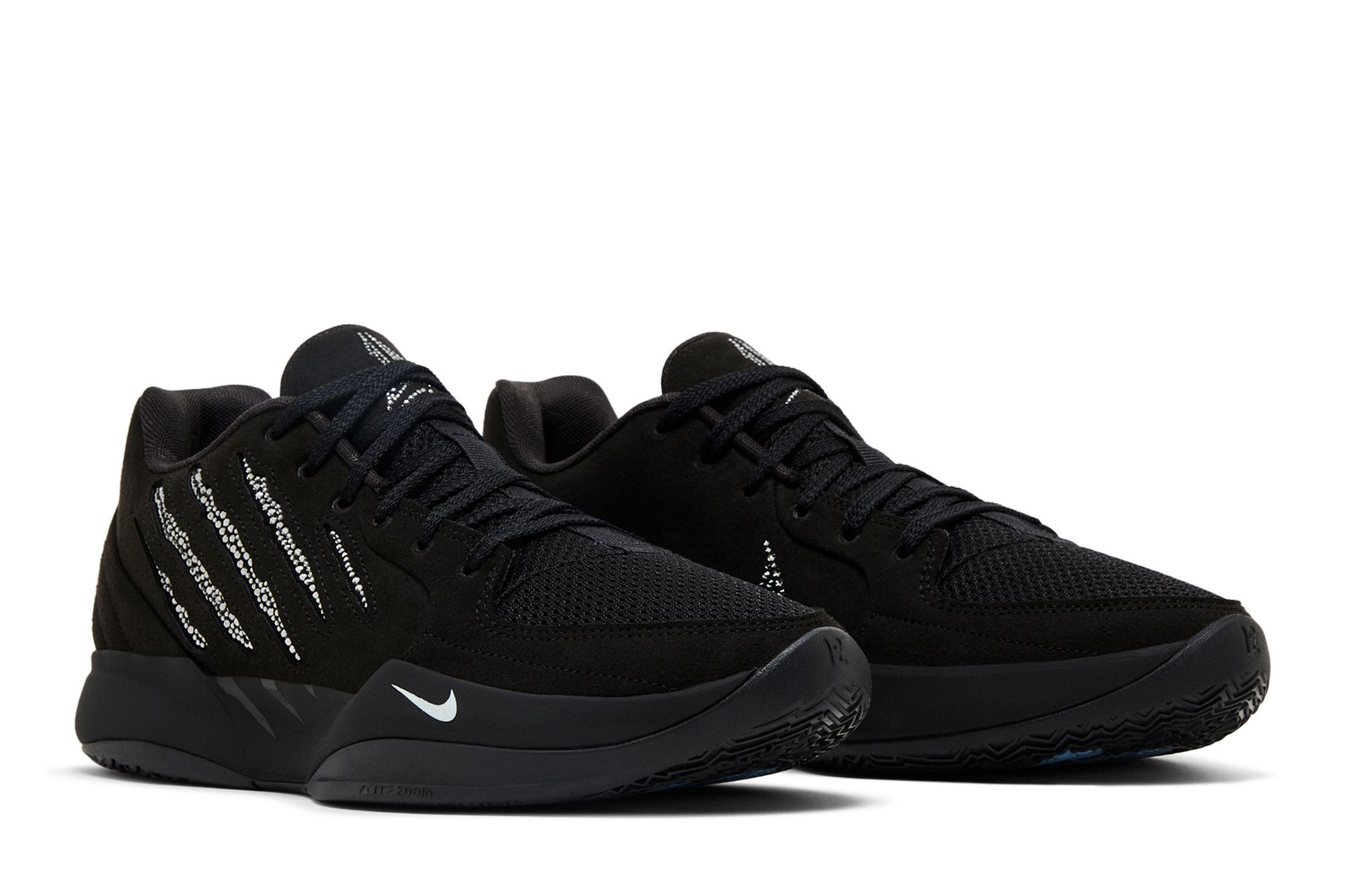 Launching as part of the ‘Black Label Pack,’ the Swarovski x Nike Ja 2 ‘Scratch Bling’ showcases a blacked-out upper featuring synthetic suede paneling, highlighted by midfoot scratch marks that reveal a sparkling crystal-encrusted underlay. The crystals form Ja’s personal logo atop the tongue, while reflective back tabs display an embroidered ’12:AM’ graphic. The sneaker rests on a matching black Phylon midsole with Zoom Air cushioning in the forefoot.